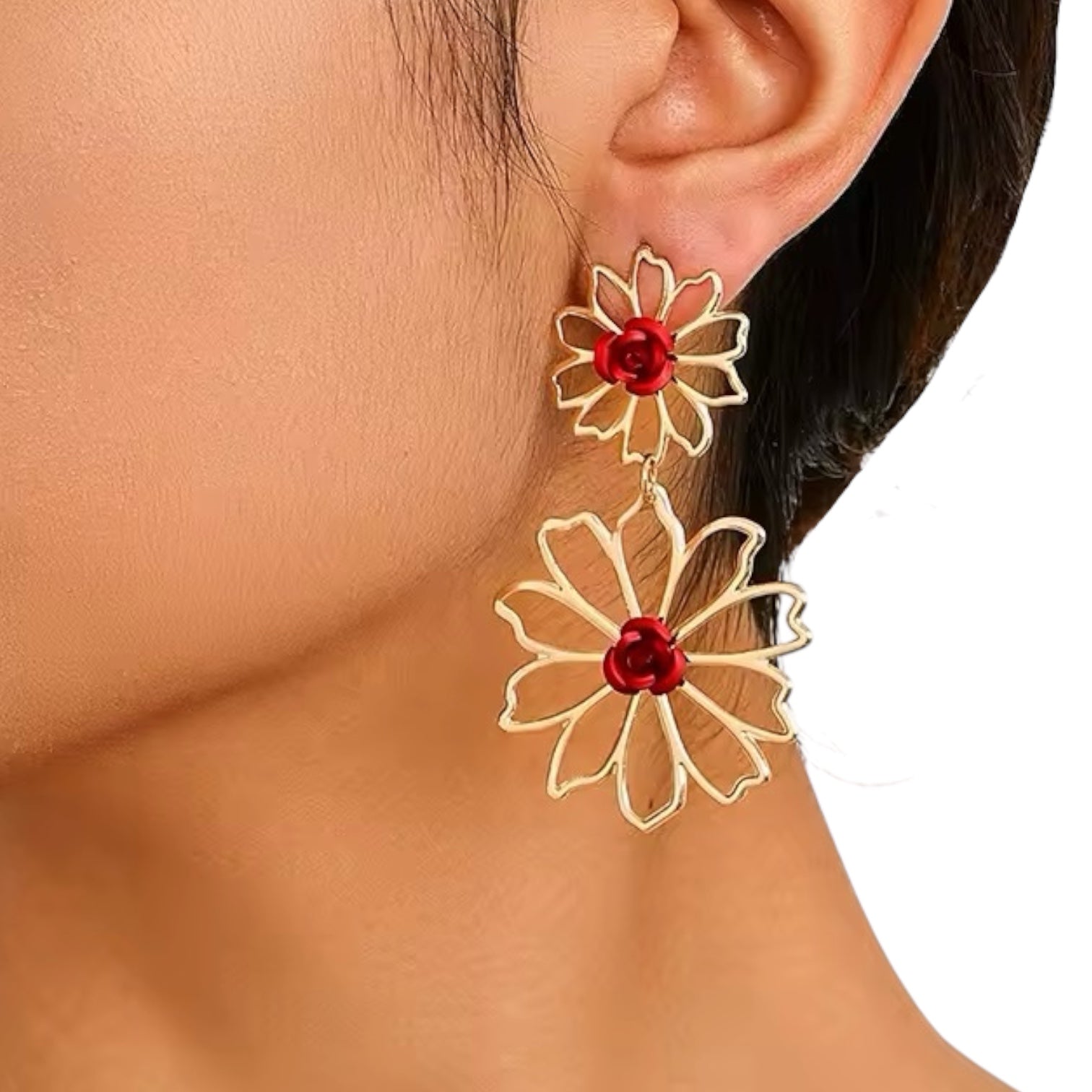 Aro dorado con detalle de flor en 3D, tono rojo.