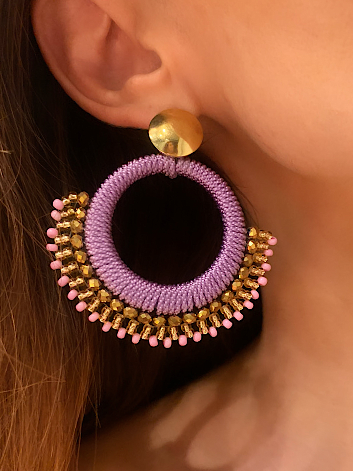 Aro con hilos, cristales facetados, canutillos y acero hecho a mano por una diseñadora colombiana.