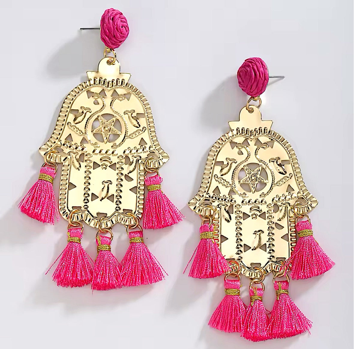 Aro dorado con trabajos en relieves, detalle de rafia y terminación en flecos de hilos de seda.