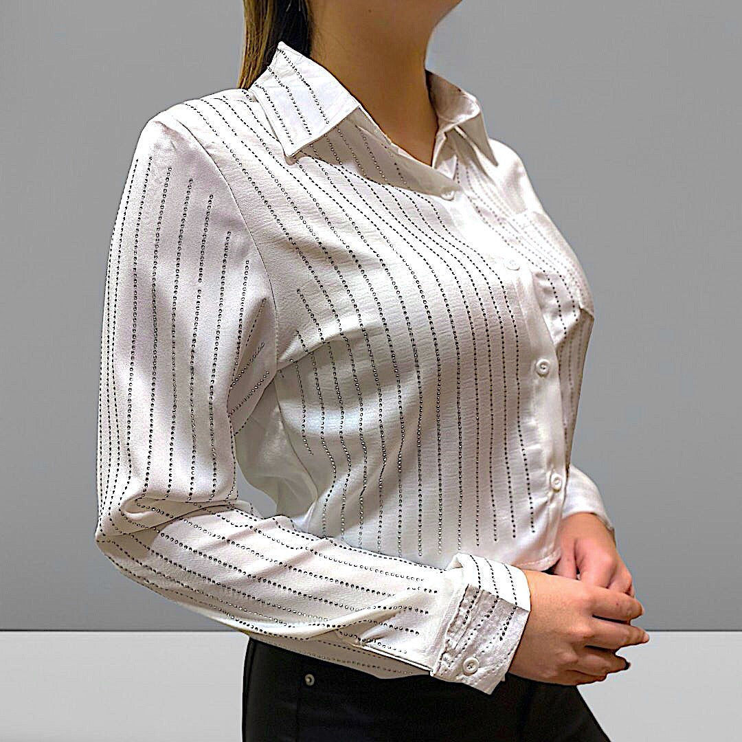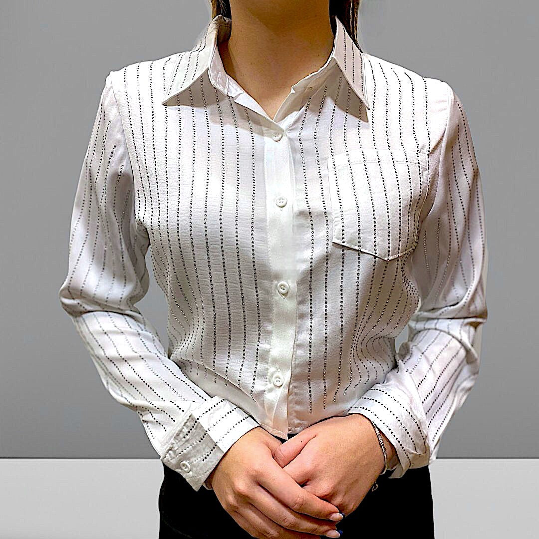 Camisa negra con detalles brillosos de strass. Tela sensación seda.