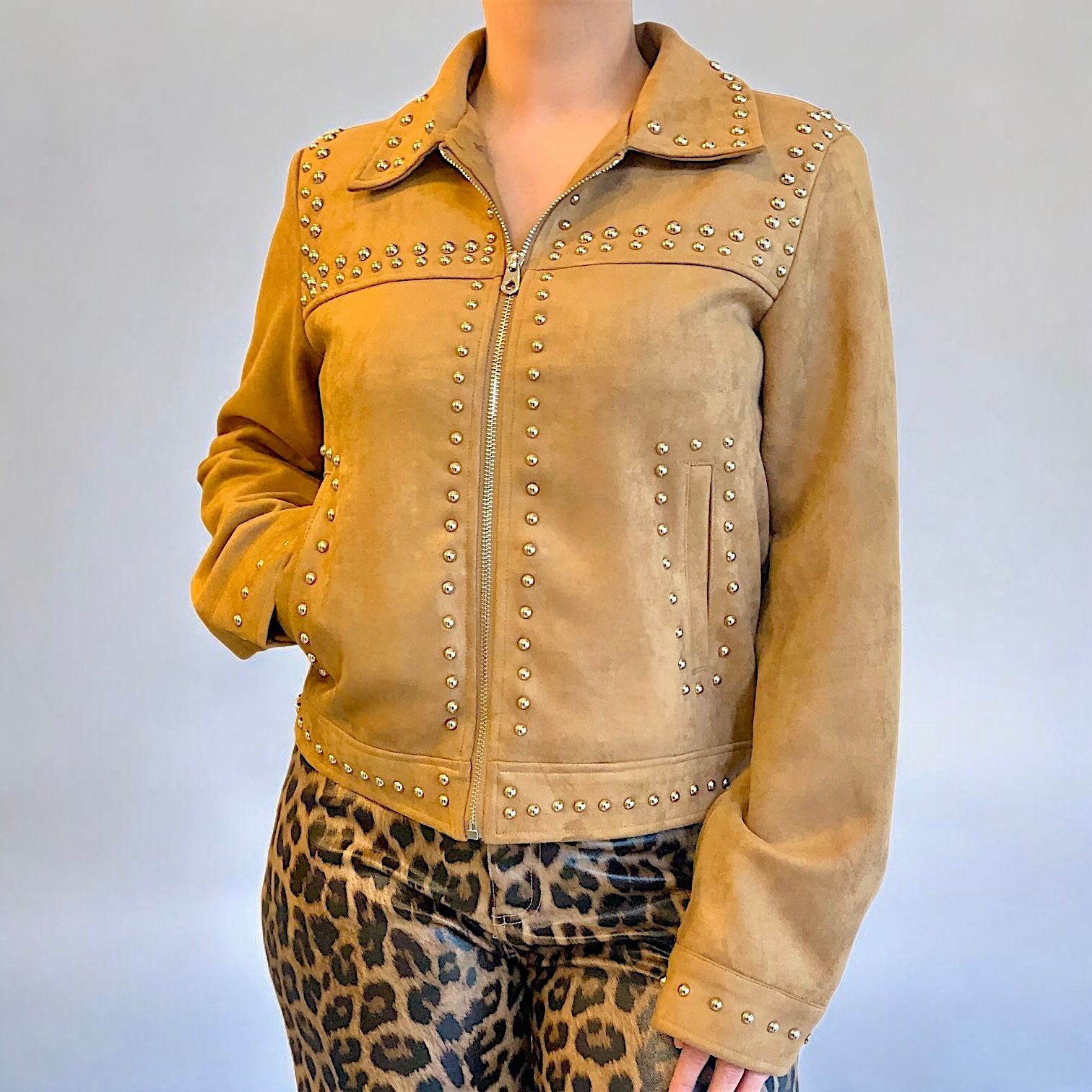 Campera de gamuza beige, totalmente forrada por dentro, bolsillos a los costados y detalles en tachas.