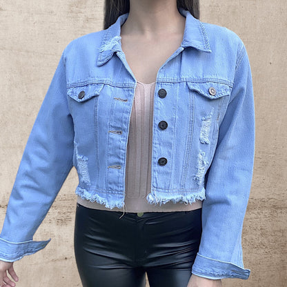 Campera de Jean con trabajos deshilachados y bordados en lentejuelas doradas.