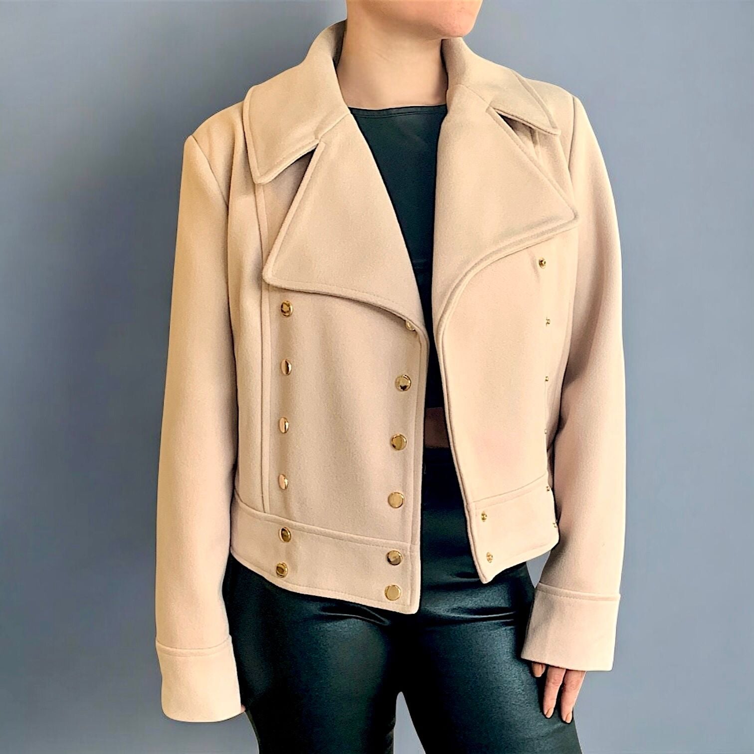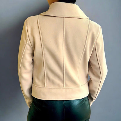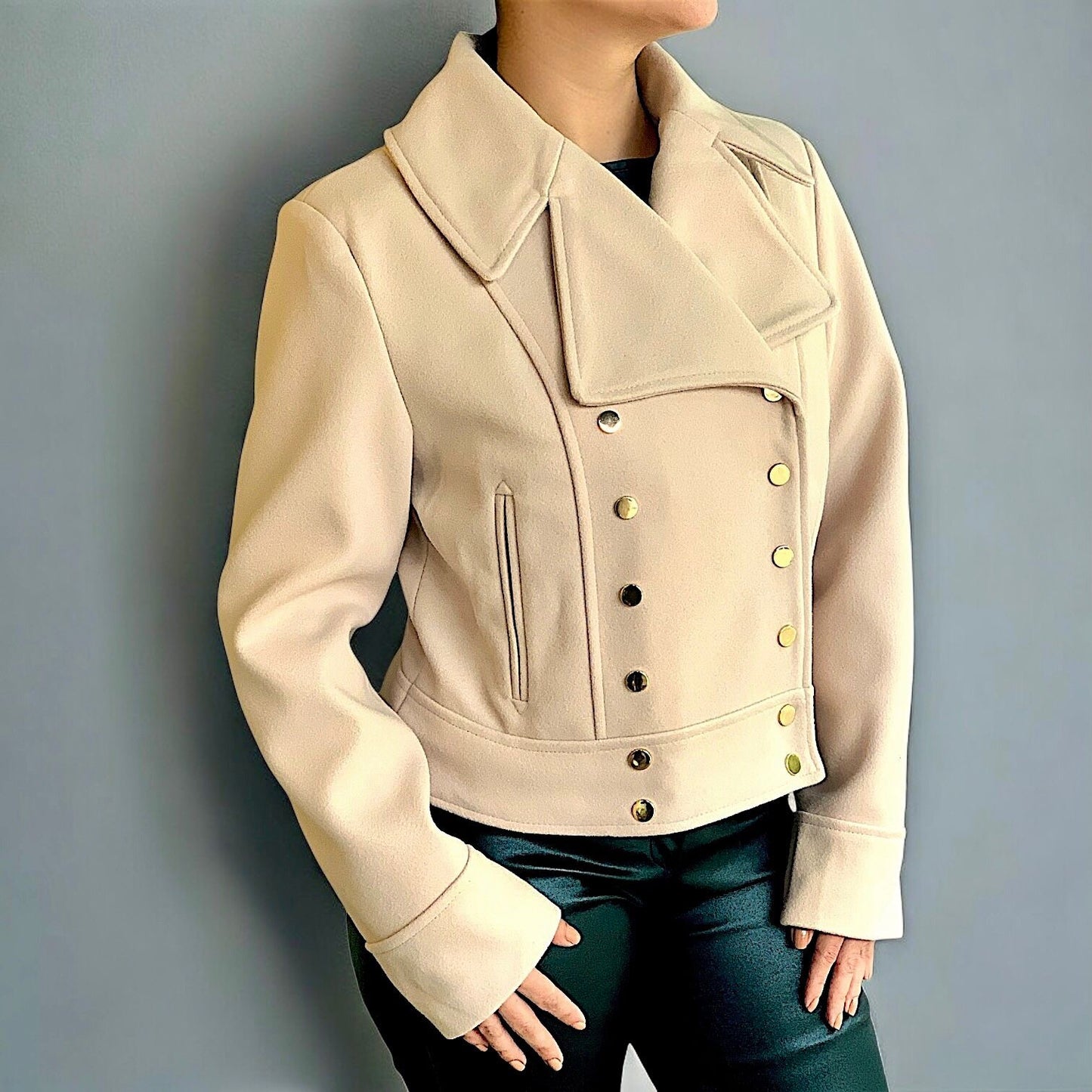 Campera cruzada abrigada con forro de peluche o pelo sintético en la parte interna.