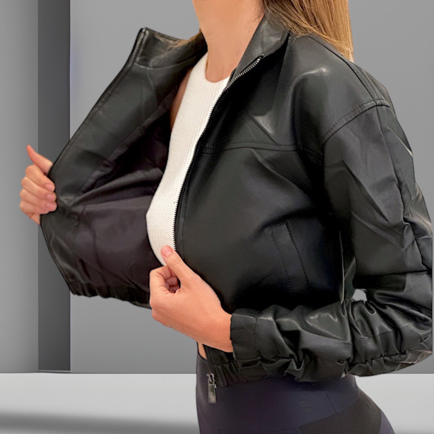 Campera negra en simil cuero con detalle fruncido en las mangas y engomado en puños y cintura