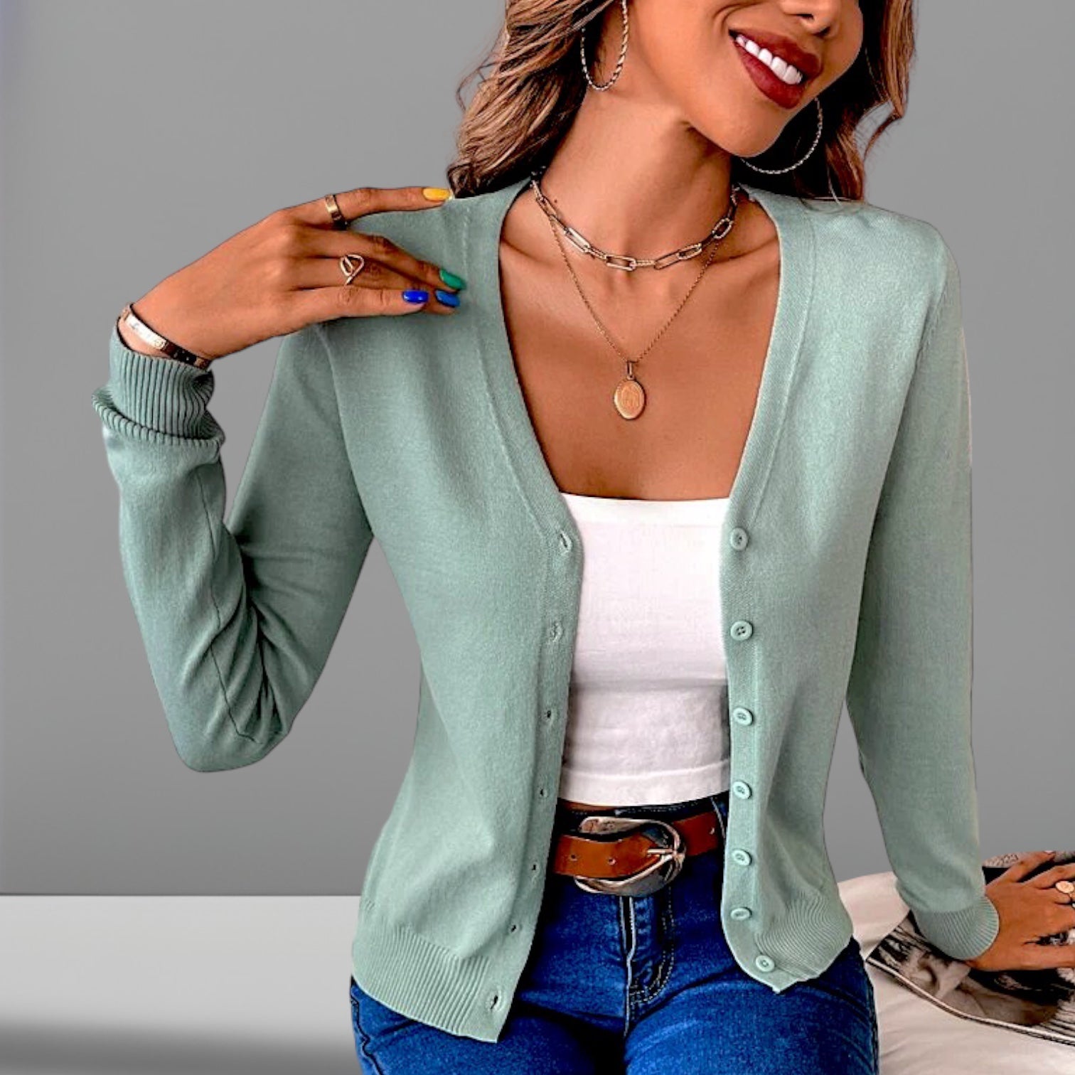 Cárdigan con botones de nácar, puede usarse abierto o cerrado