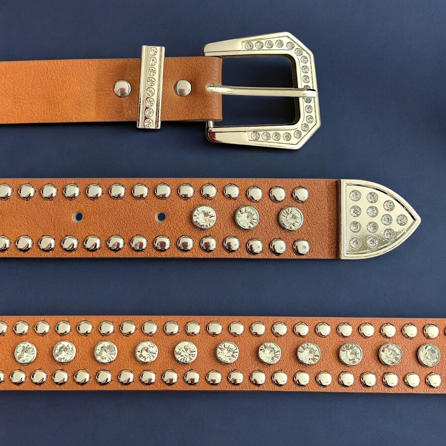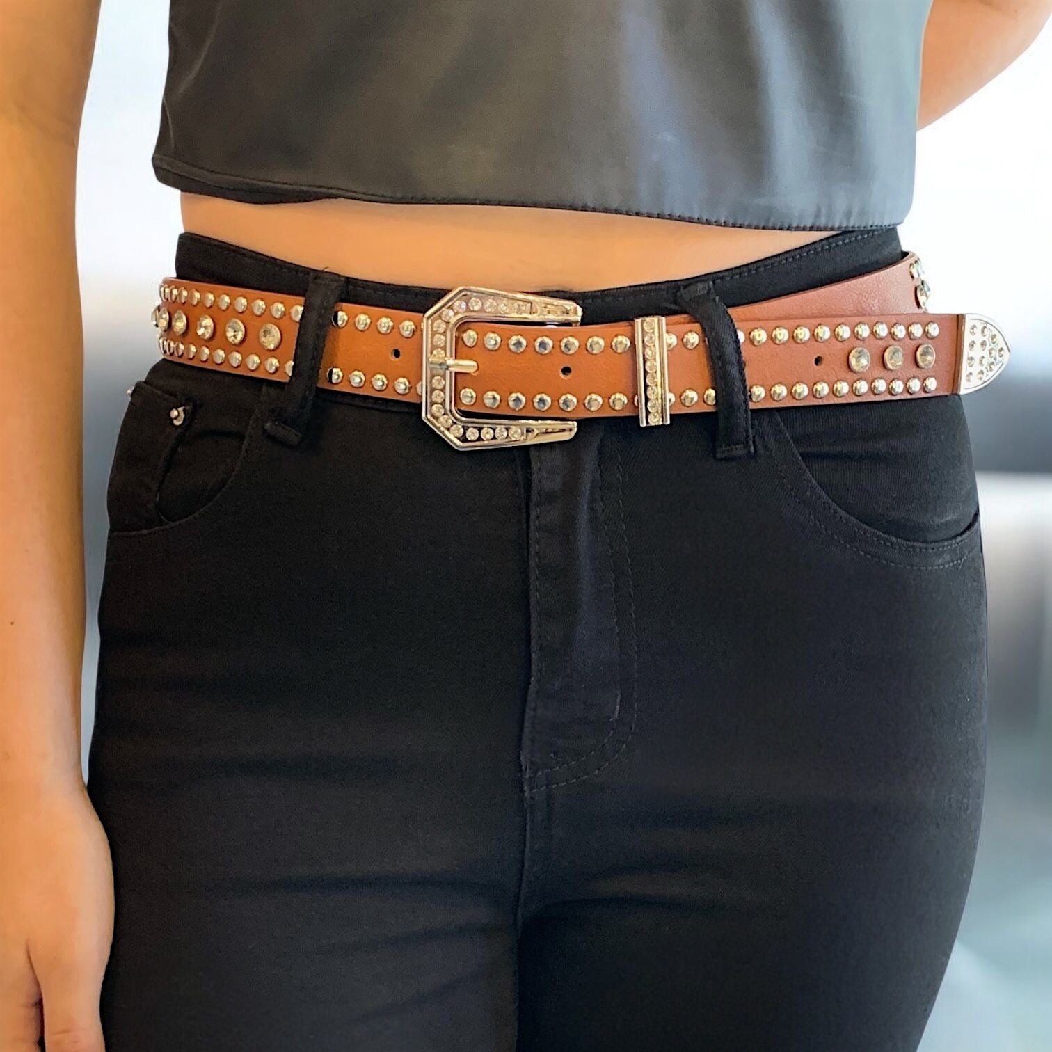 Cinto eco cuero con hebilla y tachas plateadas de metal + piedritas de strass.