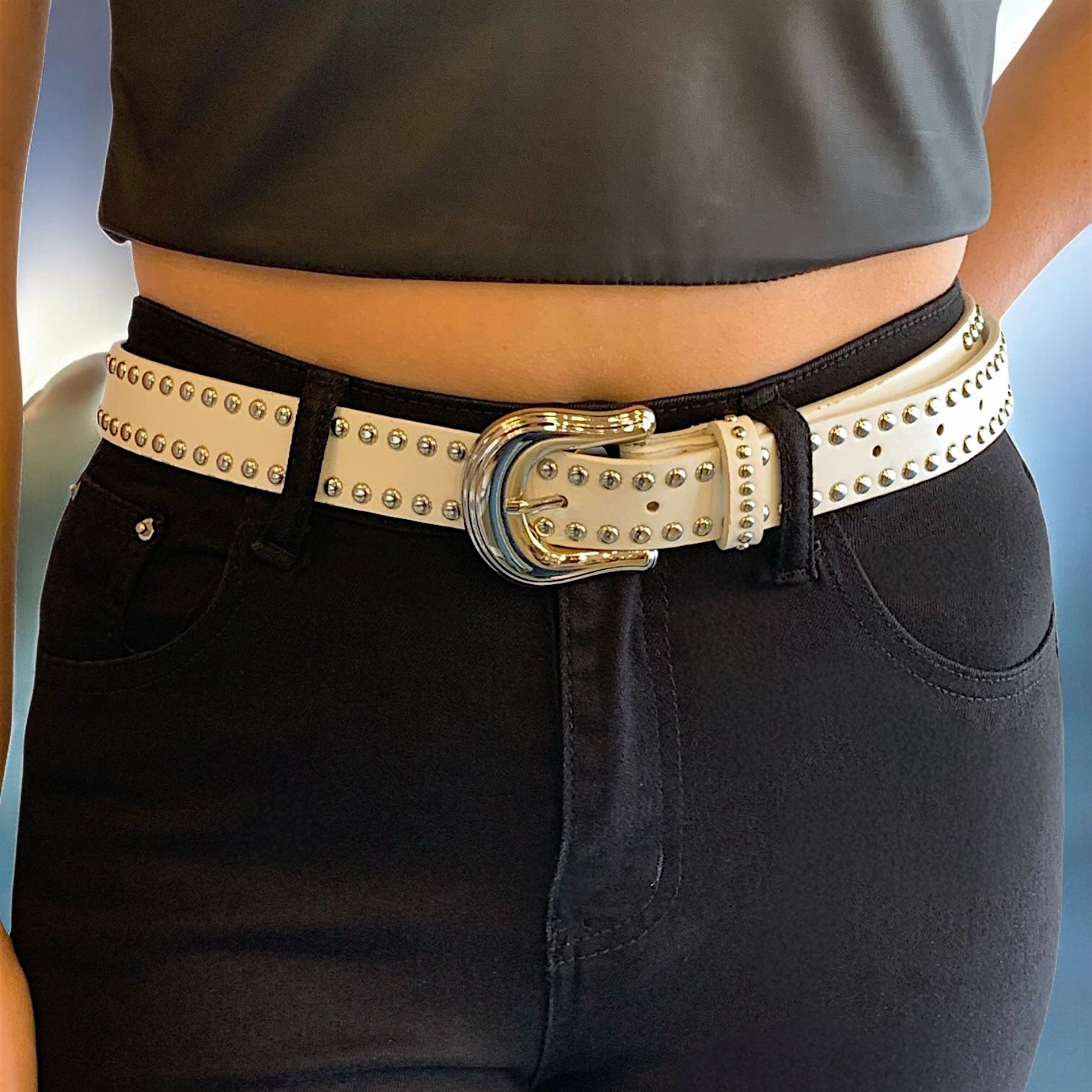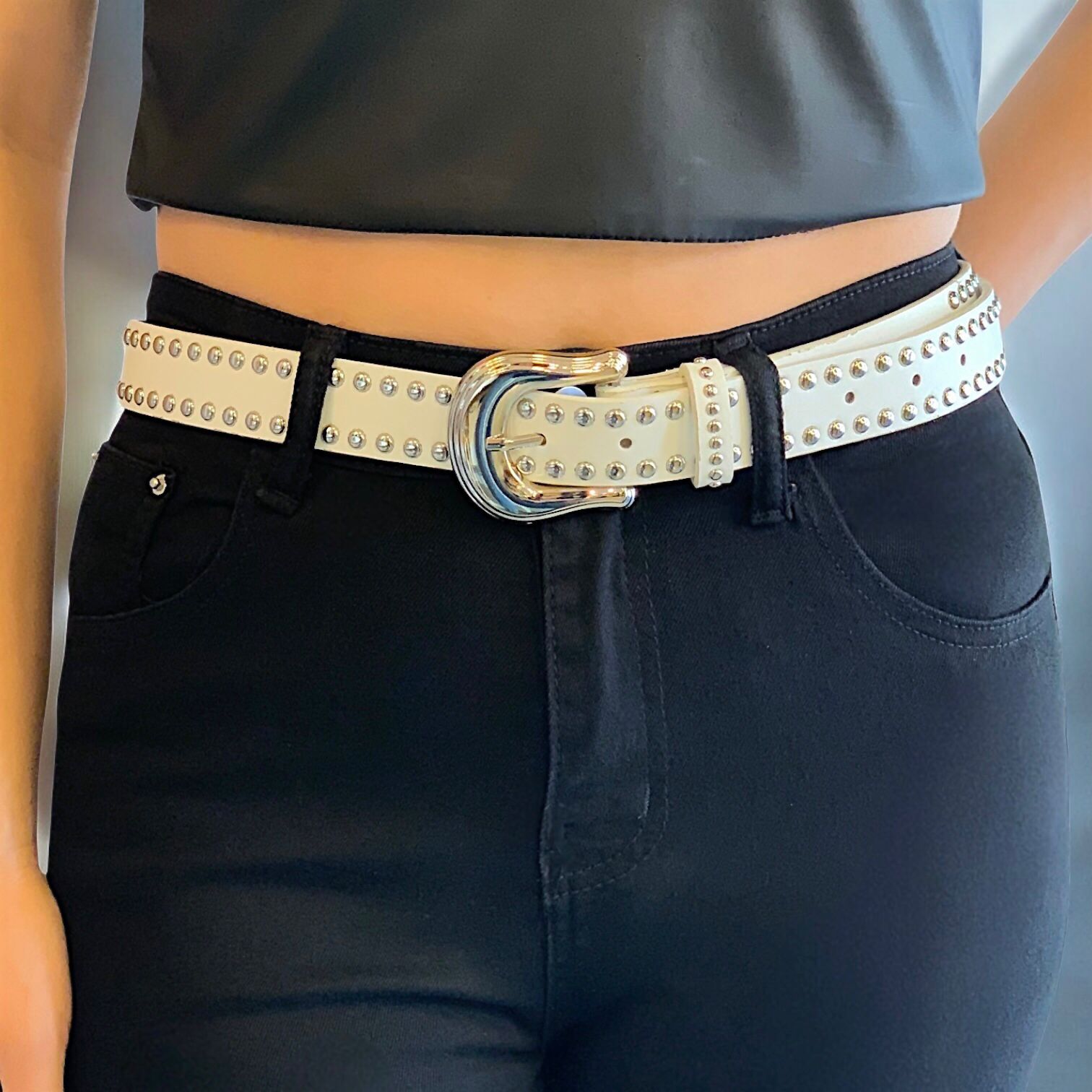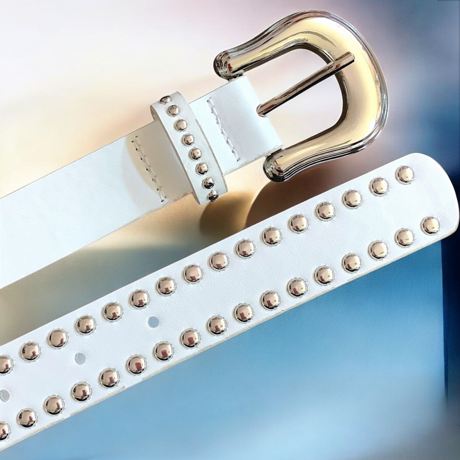 Cinto eco cuero blanco, con hebilla y tachas plateadas de metal.