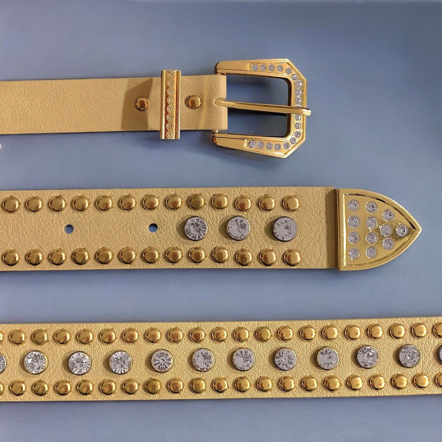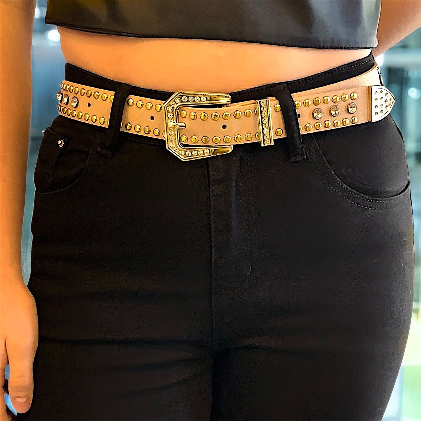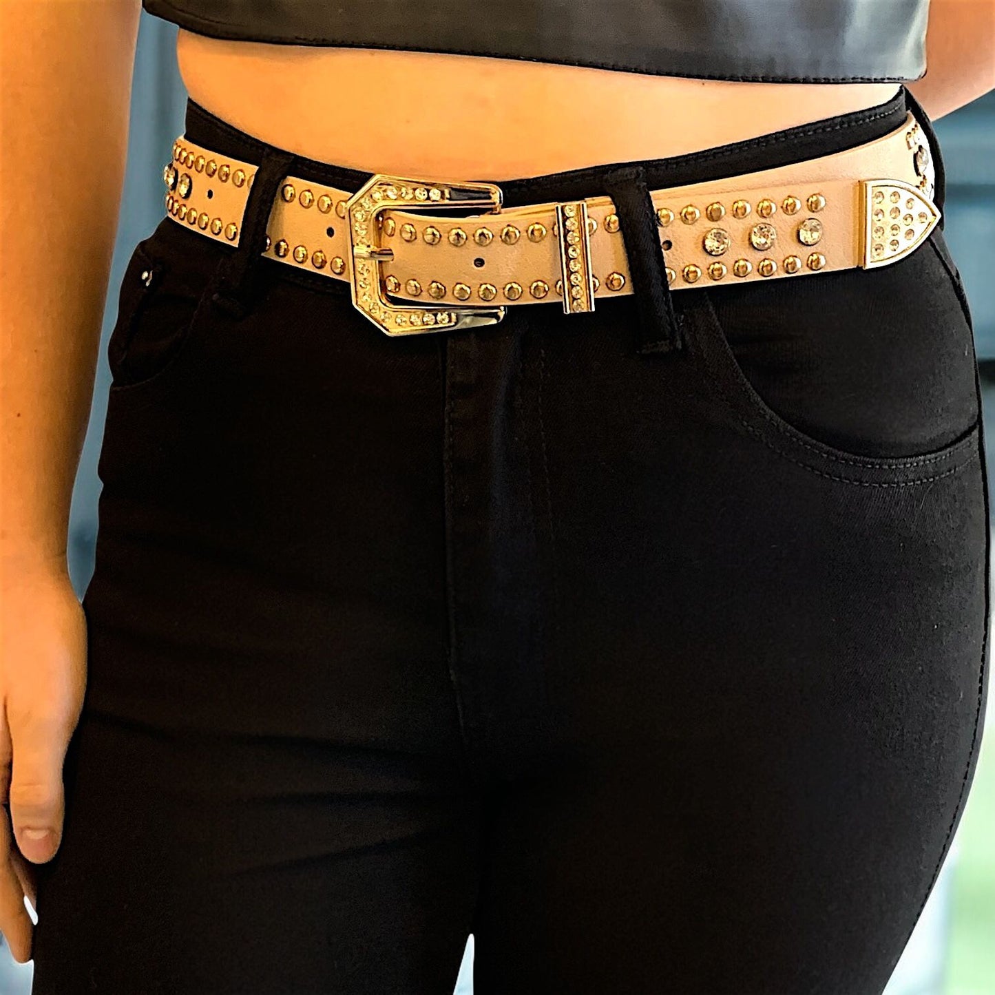 Cinto eco cuero beige con hebilla y tachas doradas de metal + piedritas de strass.