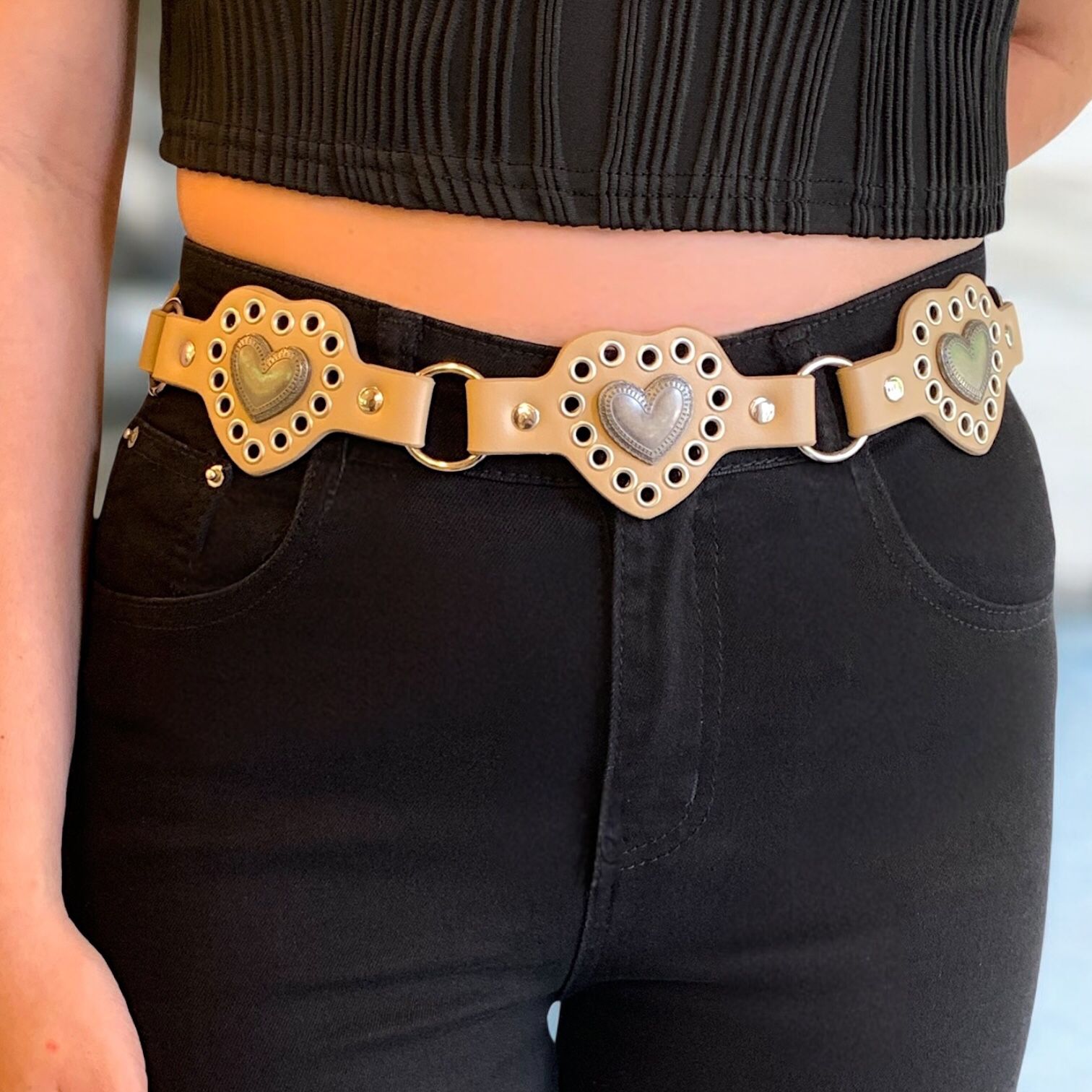 Cinto en eco cuero, detalles en metal y trabajos en relieves.