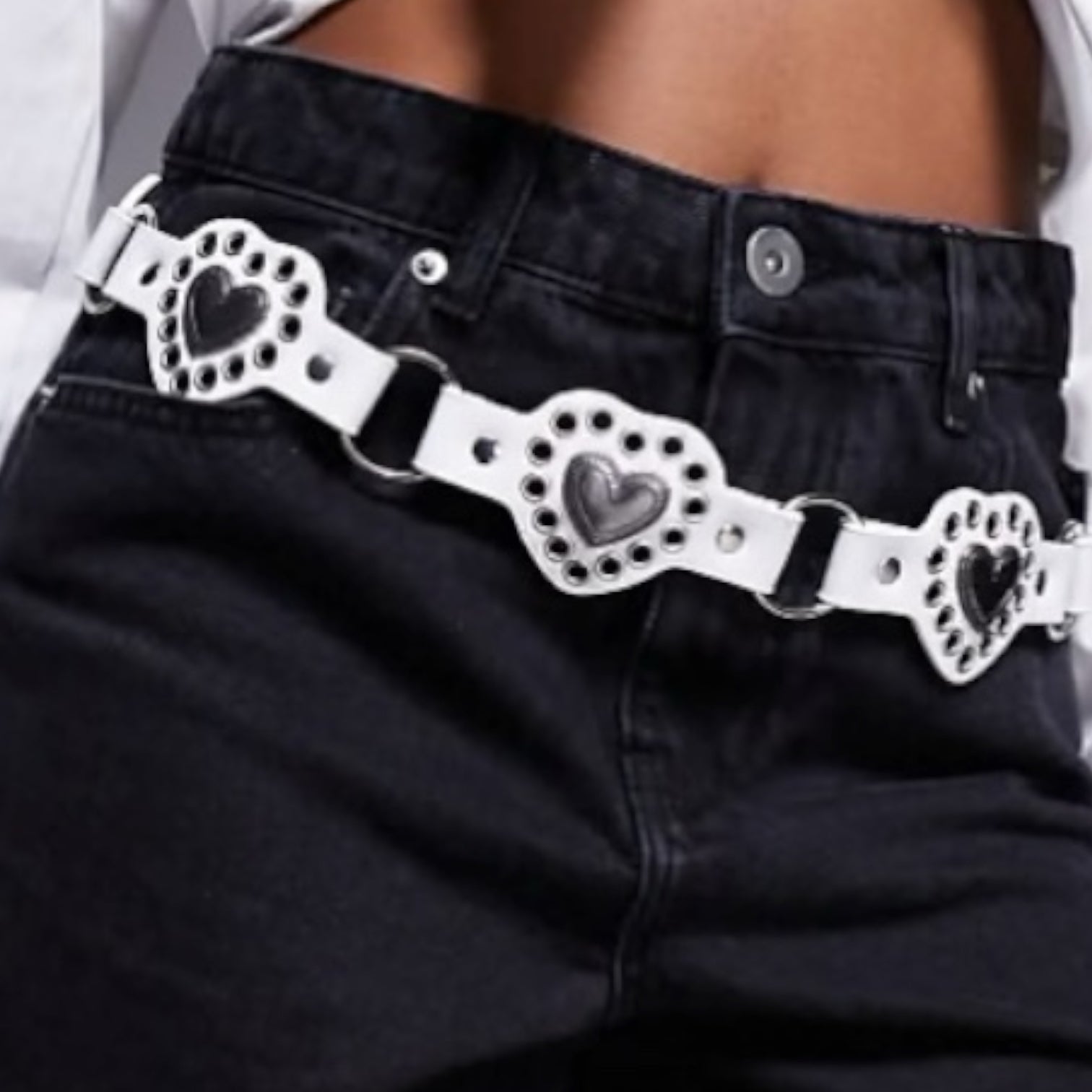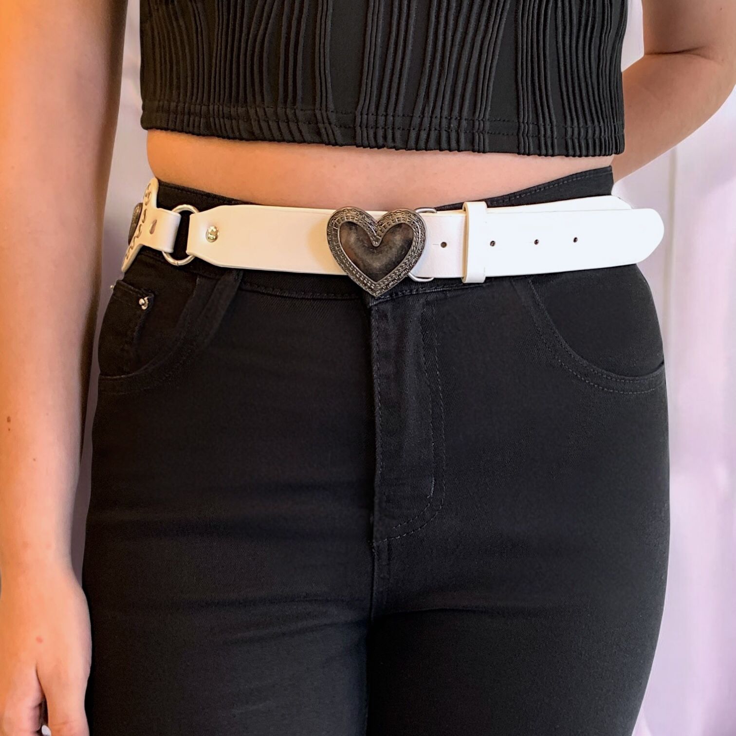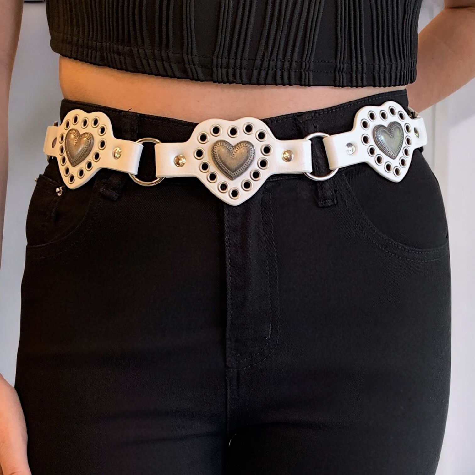 Cinto en eco cuero, detalles en metal y trabajos en relieves.