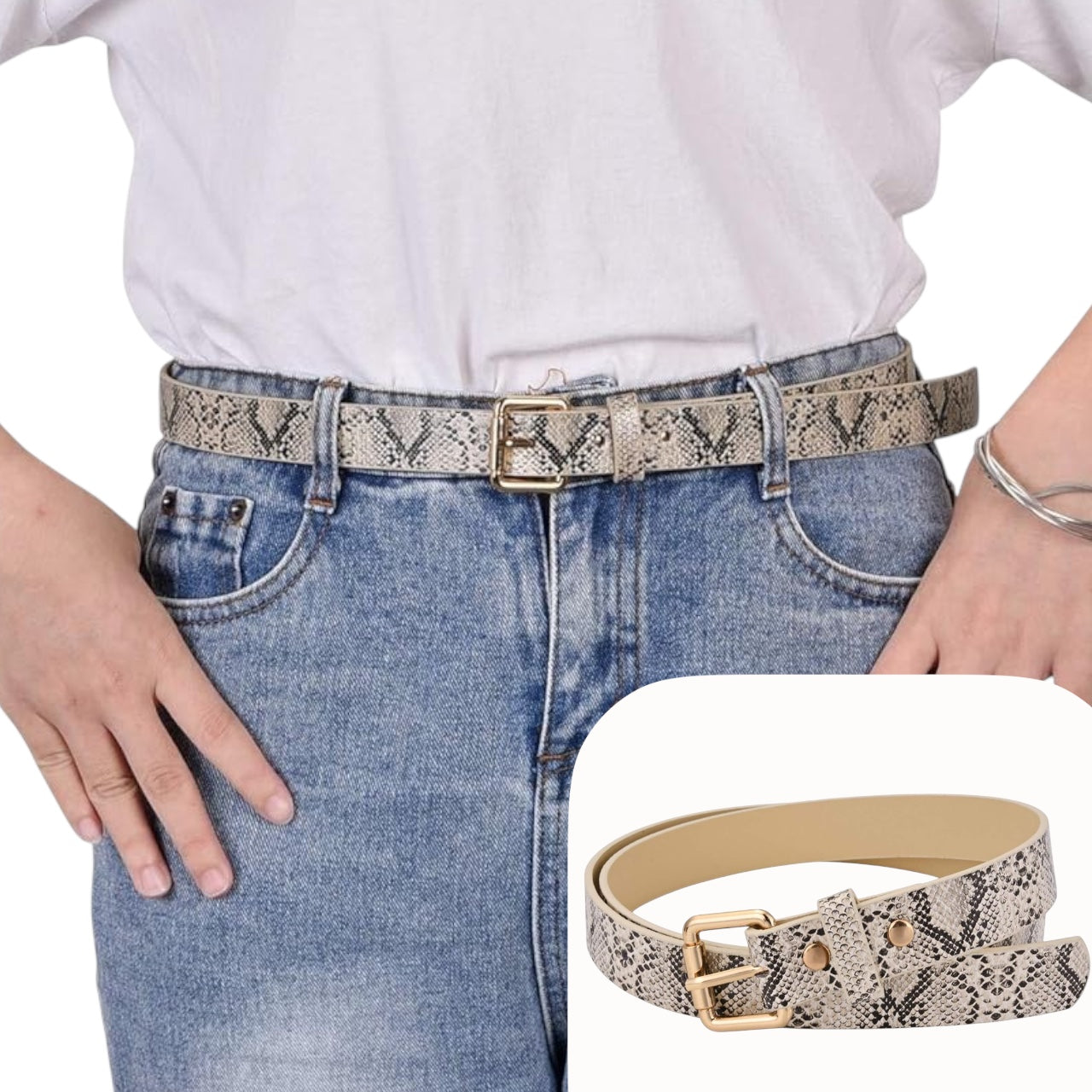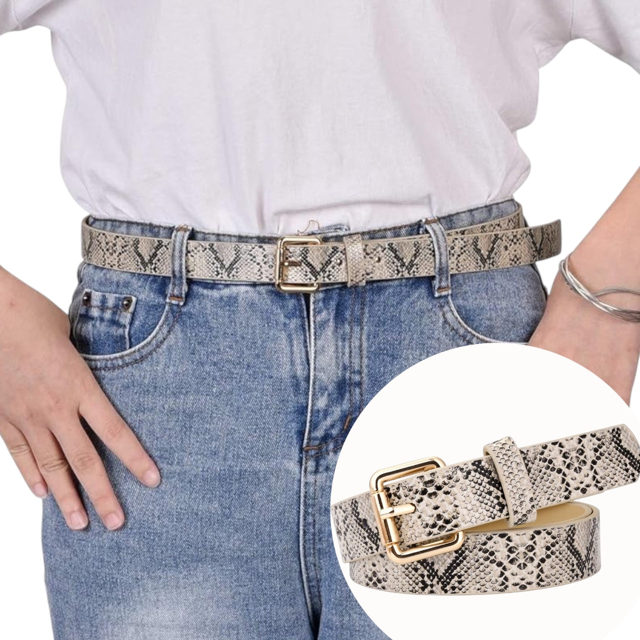 Cinto eco cuero con hebilla dorada de metal.