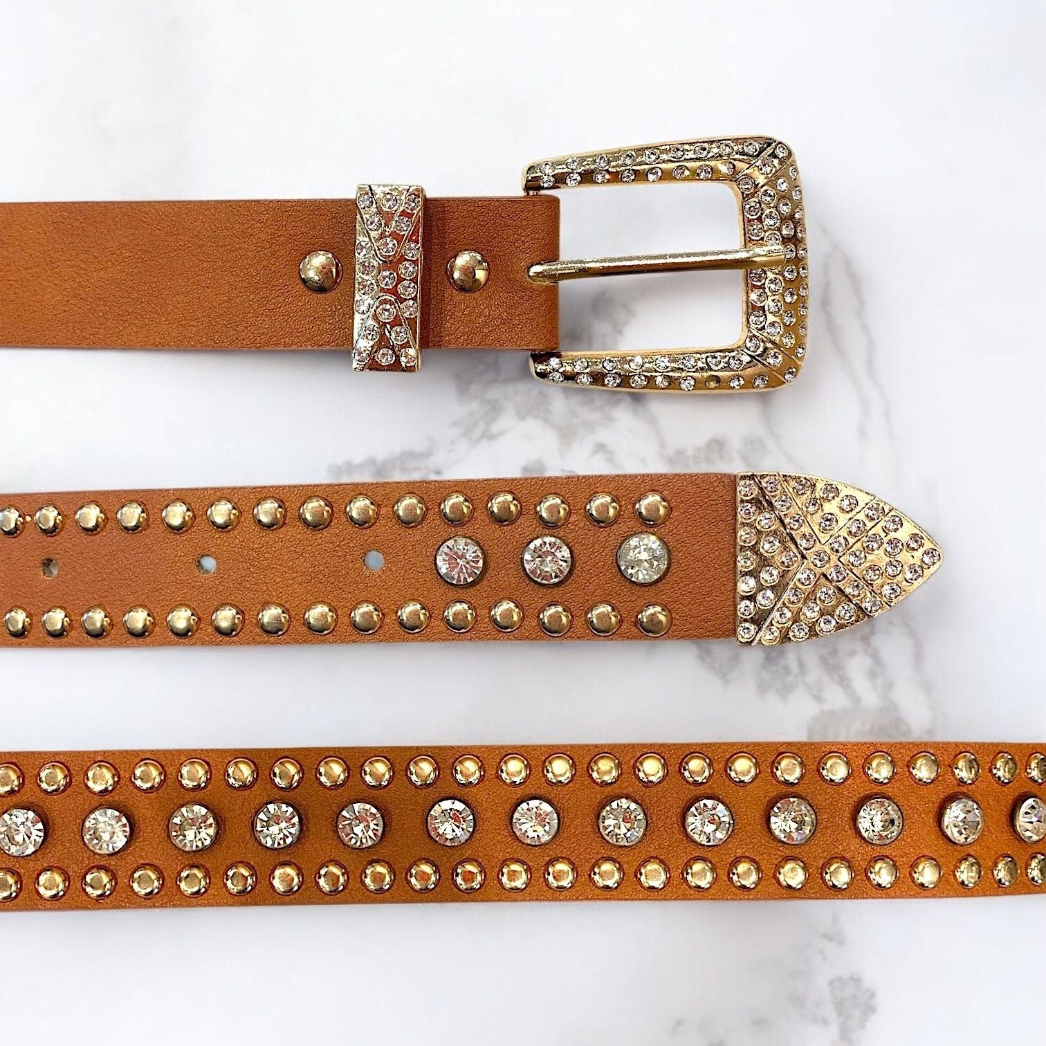 Cinto eco cuero con hebilla y tachas doradas de metal + piedritas de strass.
