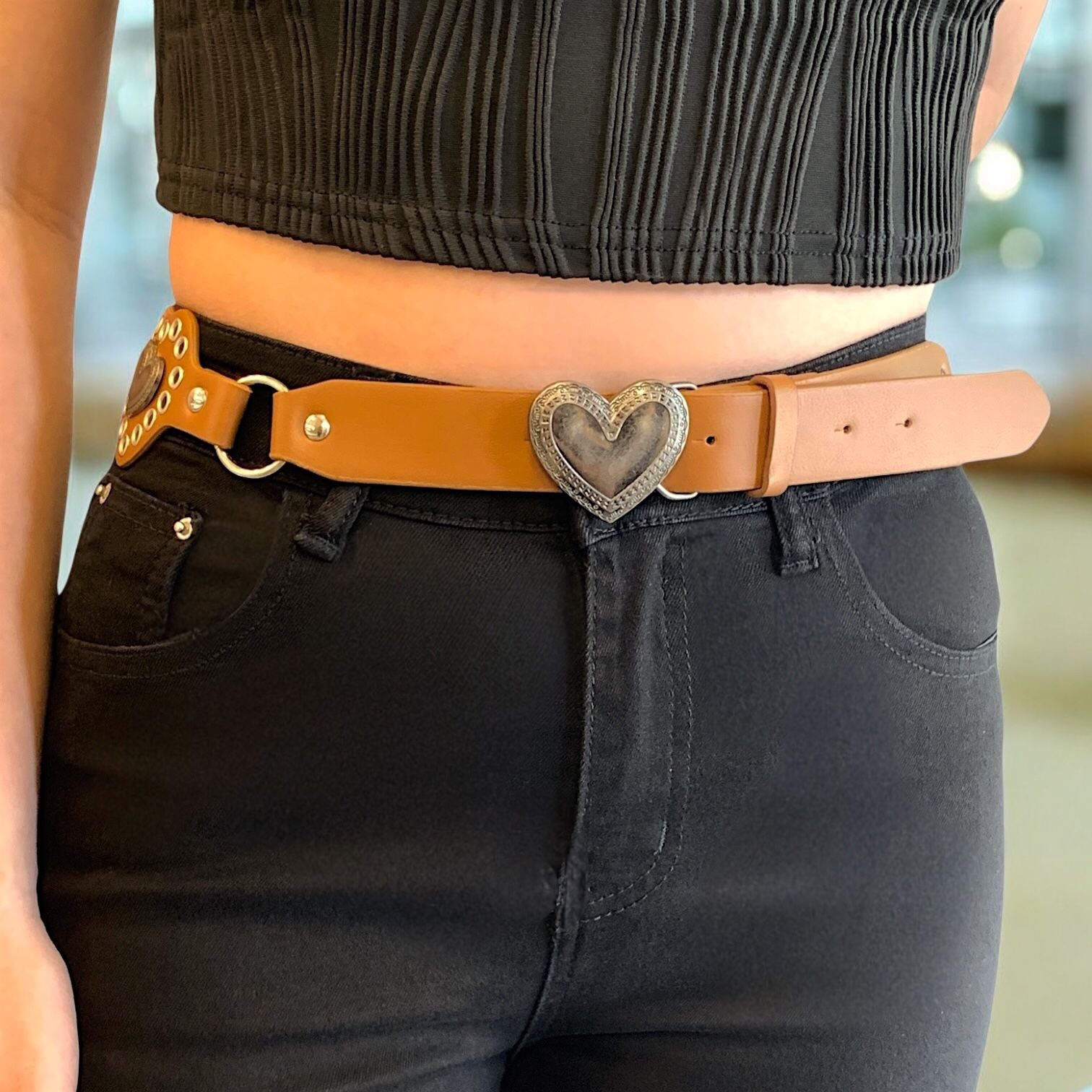 Cinto en eco cuero, detalles en metal y trabajos en relieves.