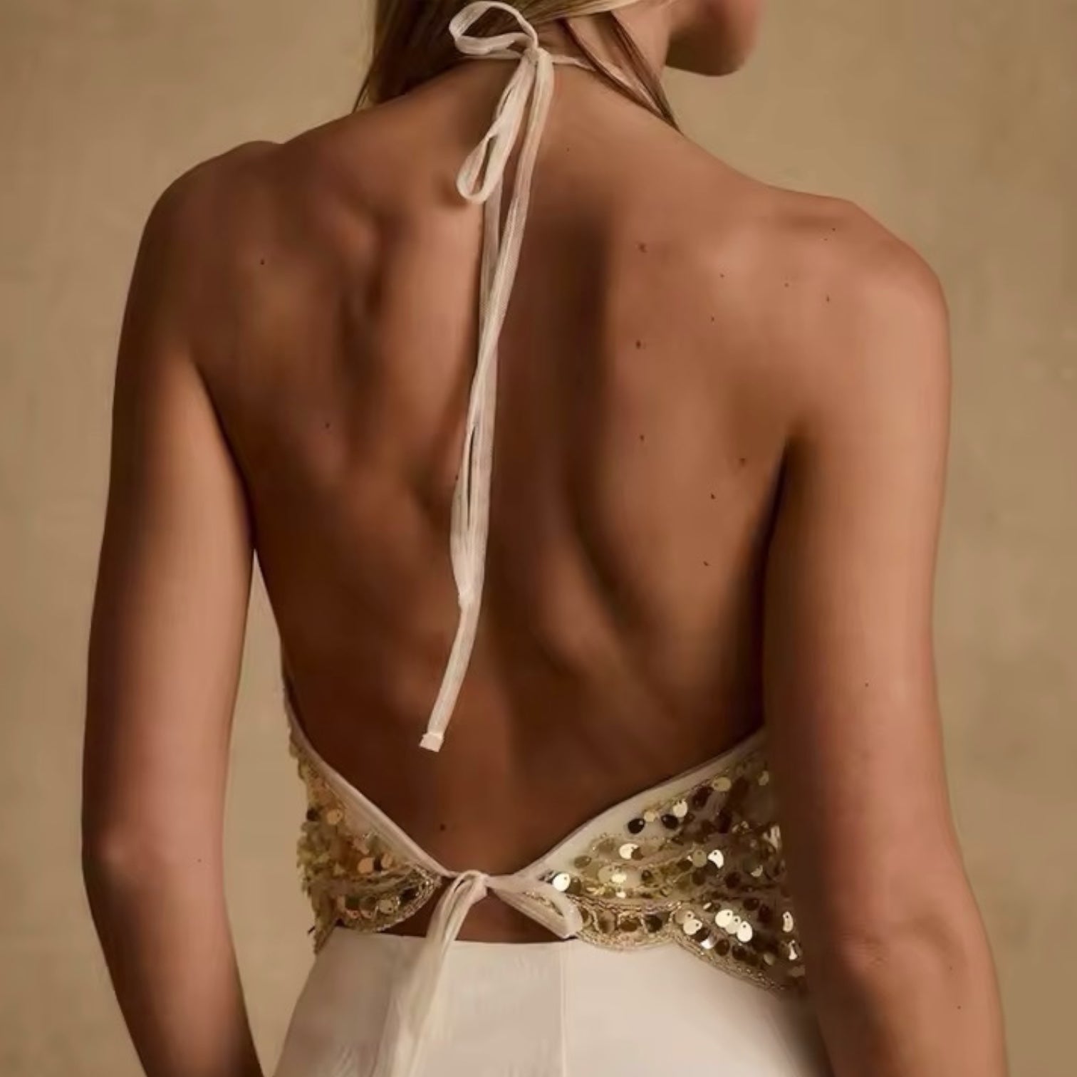 Blusa elastziada totalmente bordada en lentejuelas, espalda abierta.