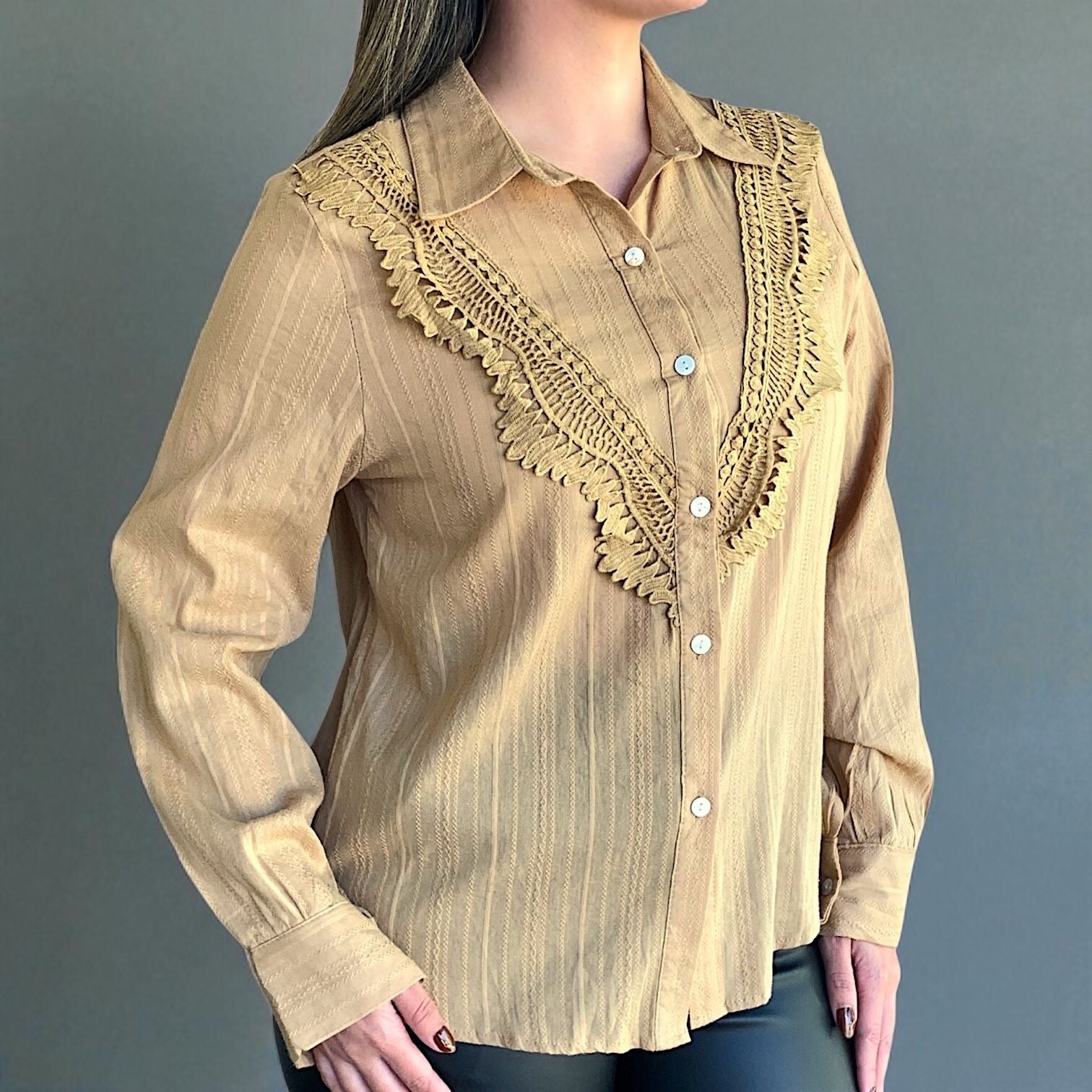 Camisa con detalle de encaje de algodón con trabajos calados y botones de nácar.