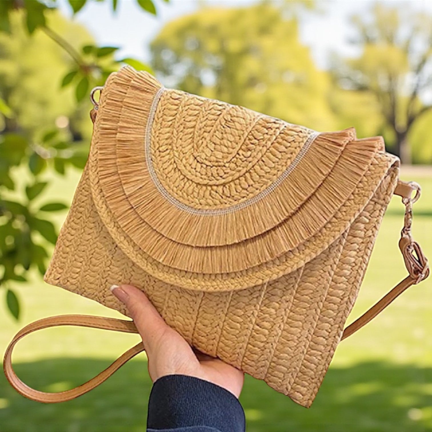 Cartera/ Sobre de rafia, totalmente forrado por dentro + 1 bolsillo en el interior.