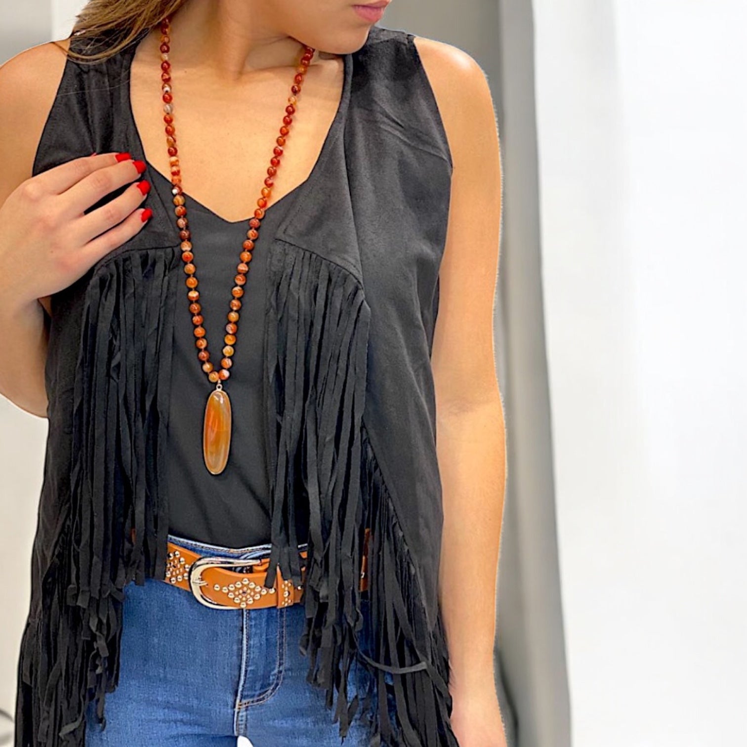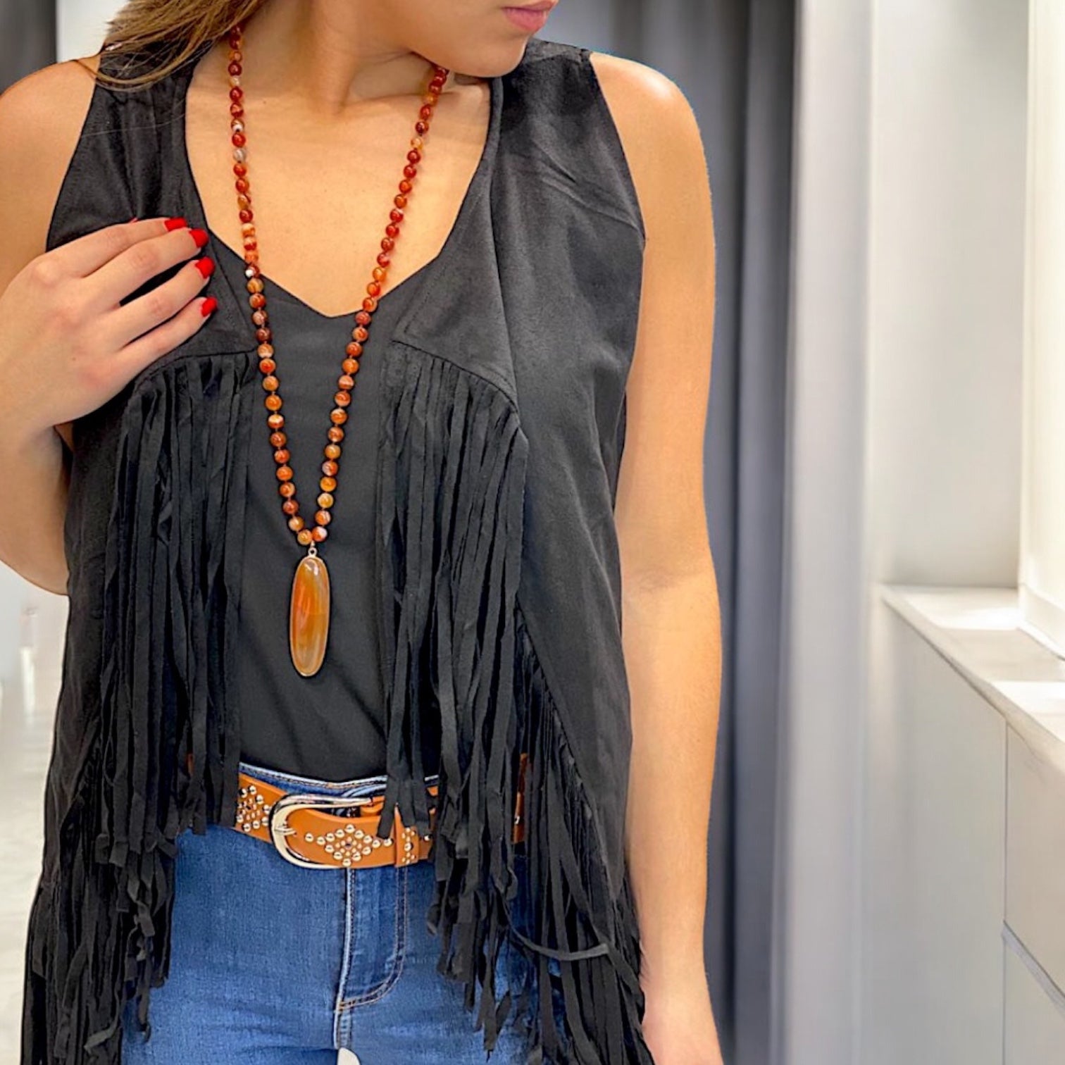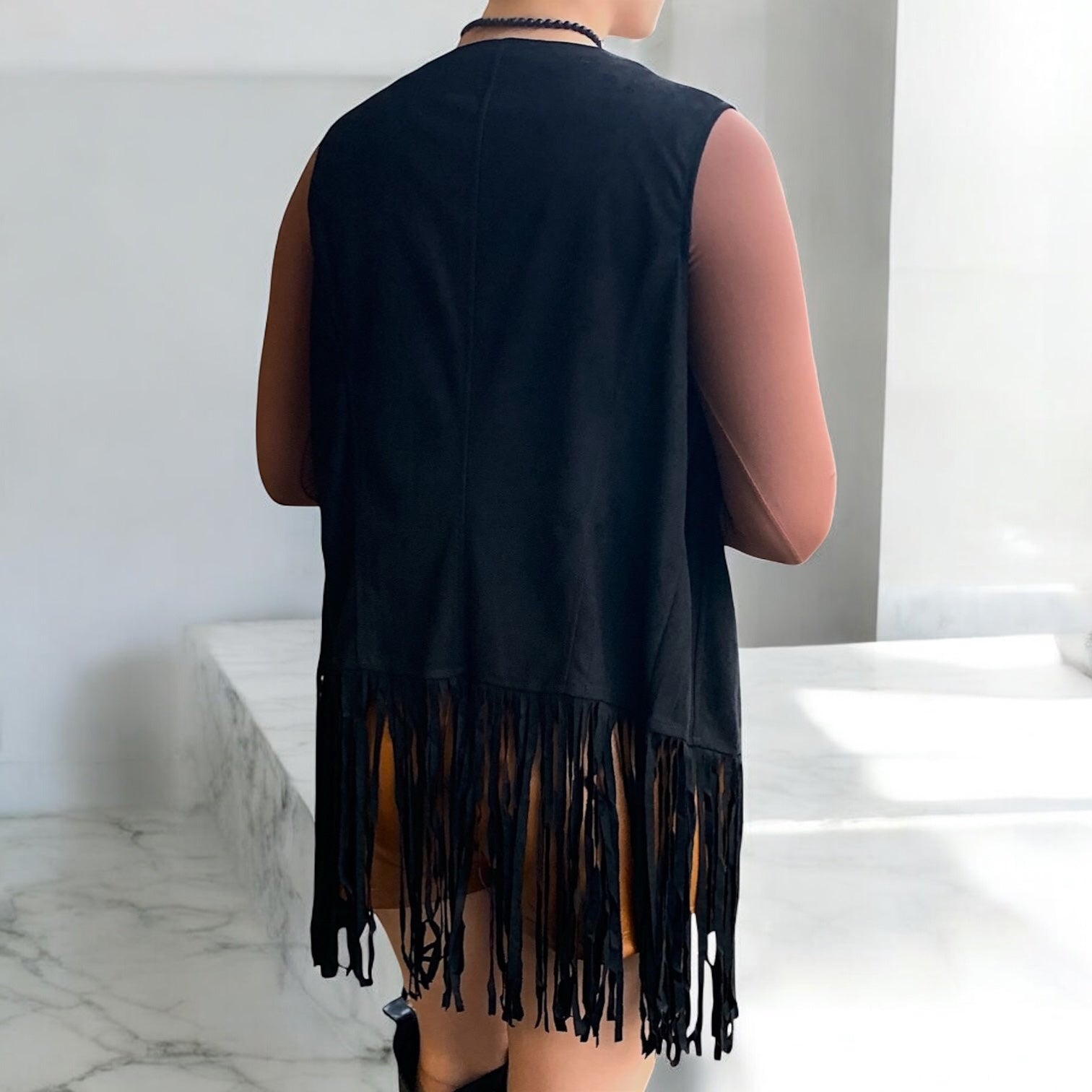 Chaleco en eco cuero gamuzado, con terminación en flecos.