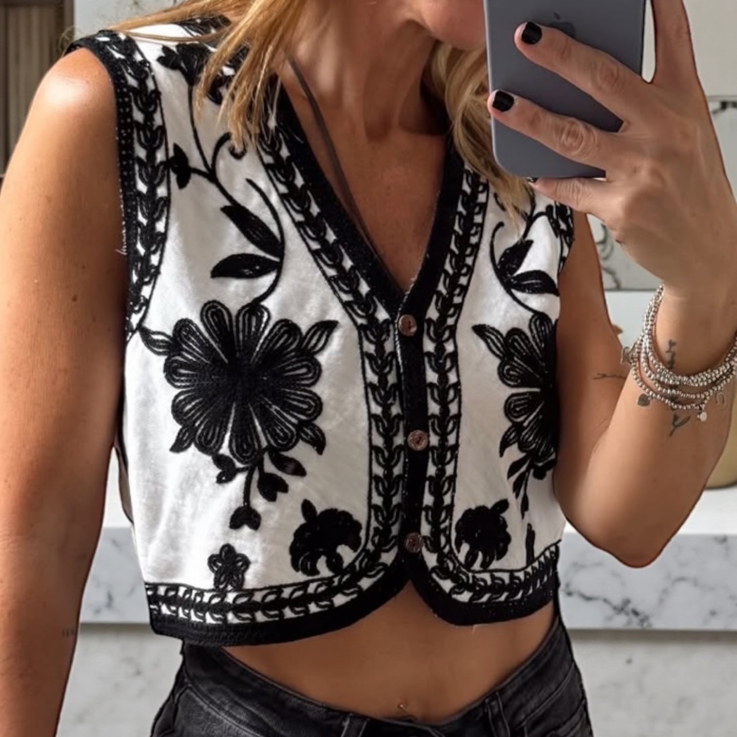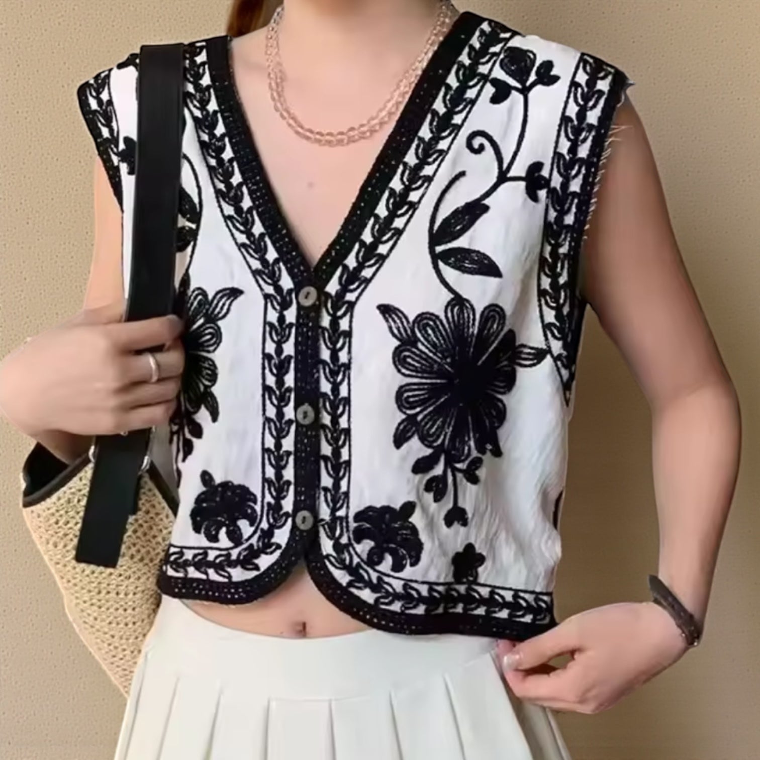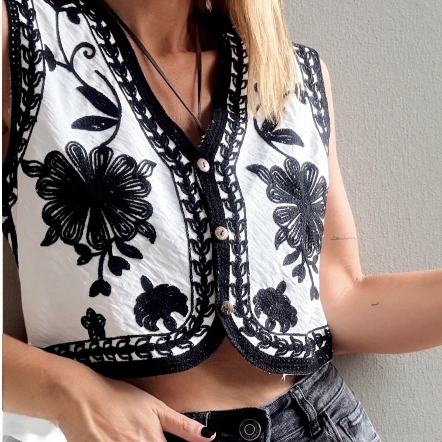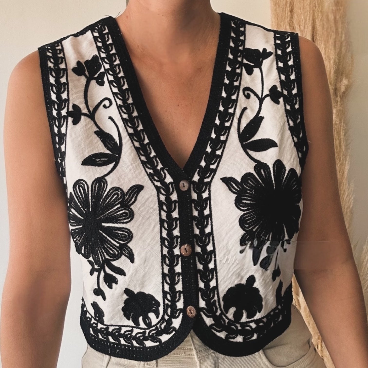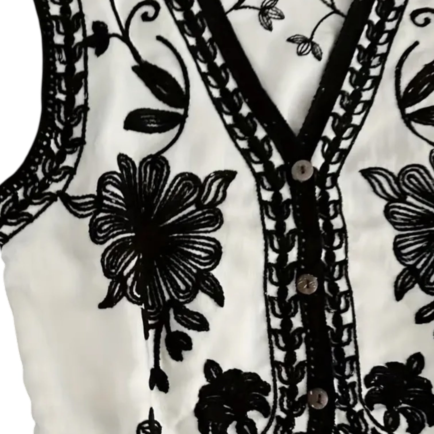 Chaleco de algodón horadado. Puede usarse abierto o cerrado.