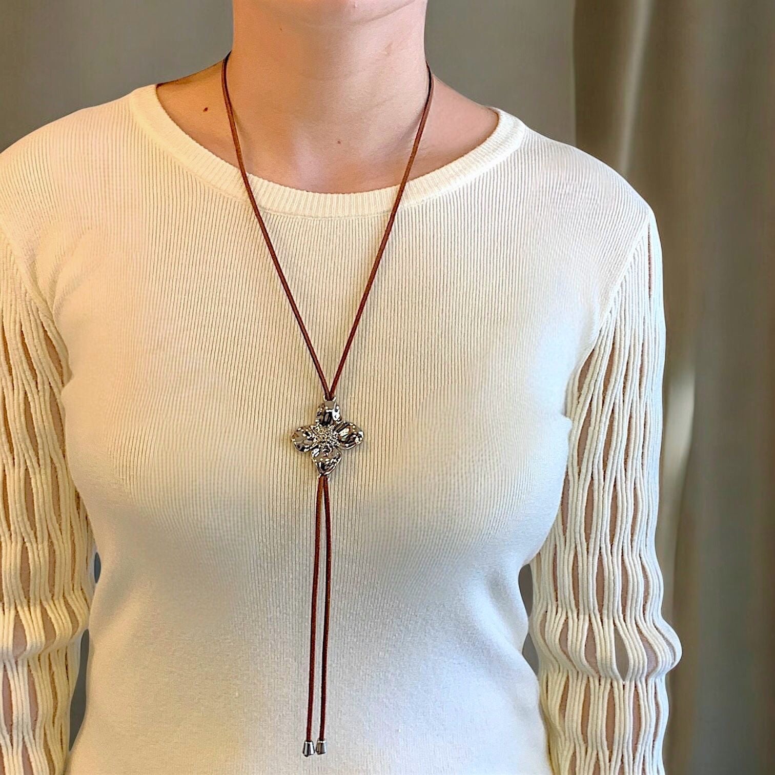 Collar de cuerito marrón, con dije en metal plateado. El dije puede colocarse a la altura que uno prefiera.