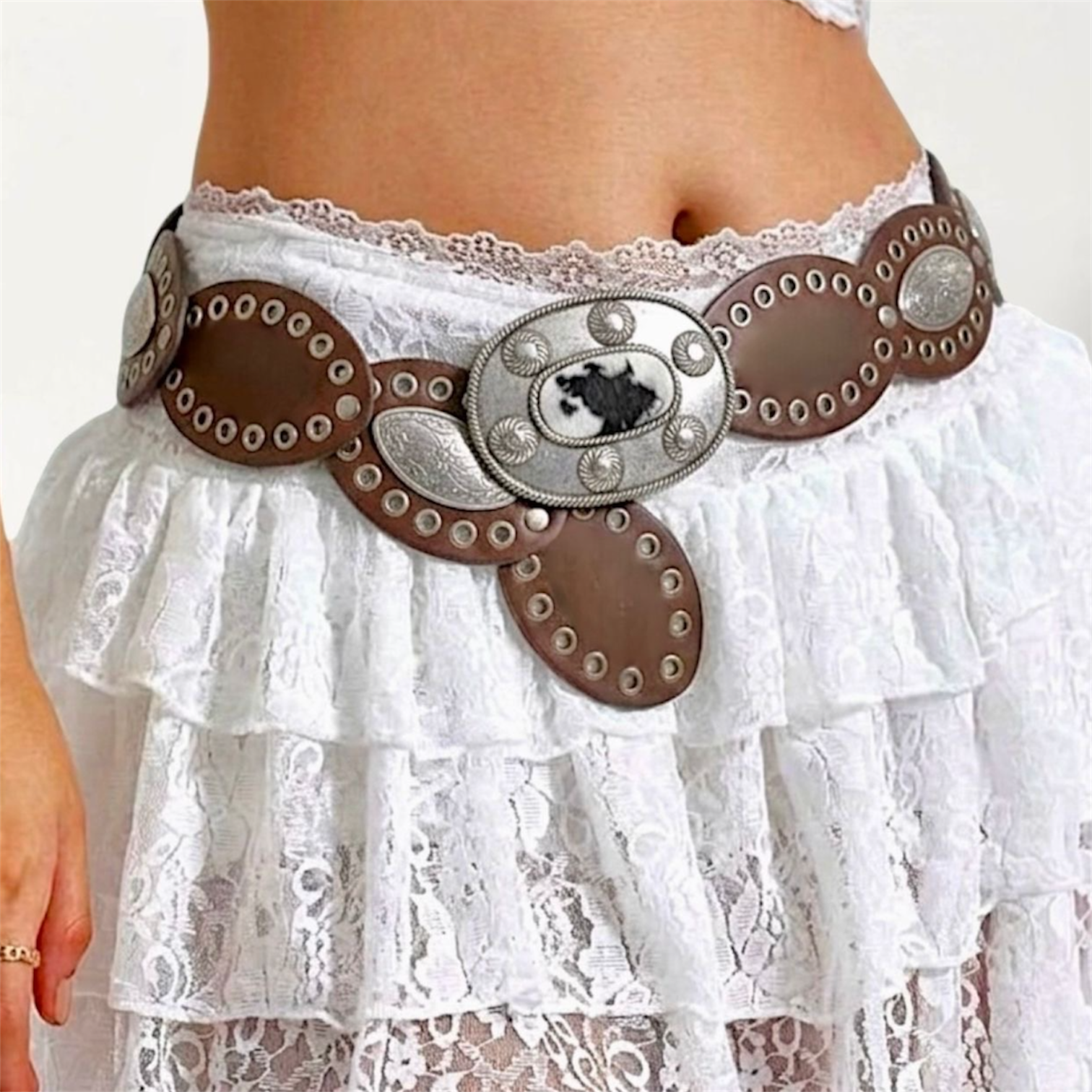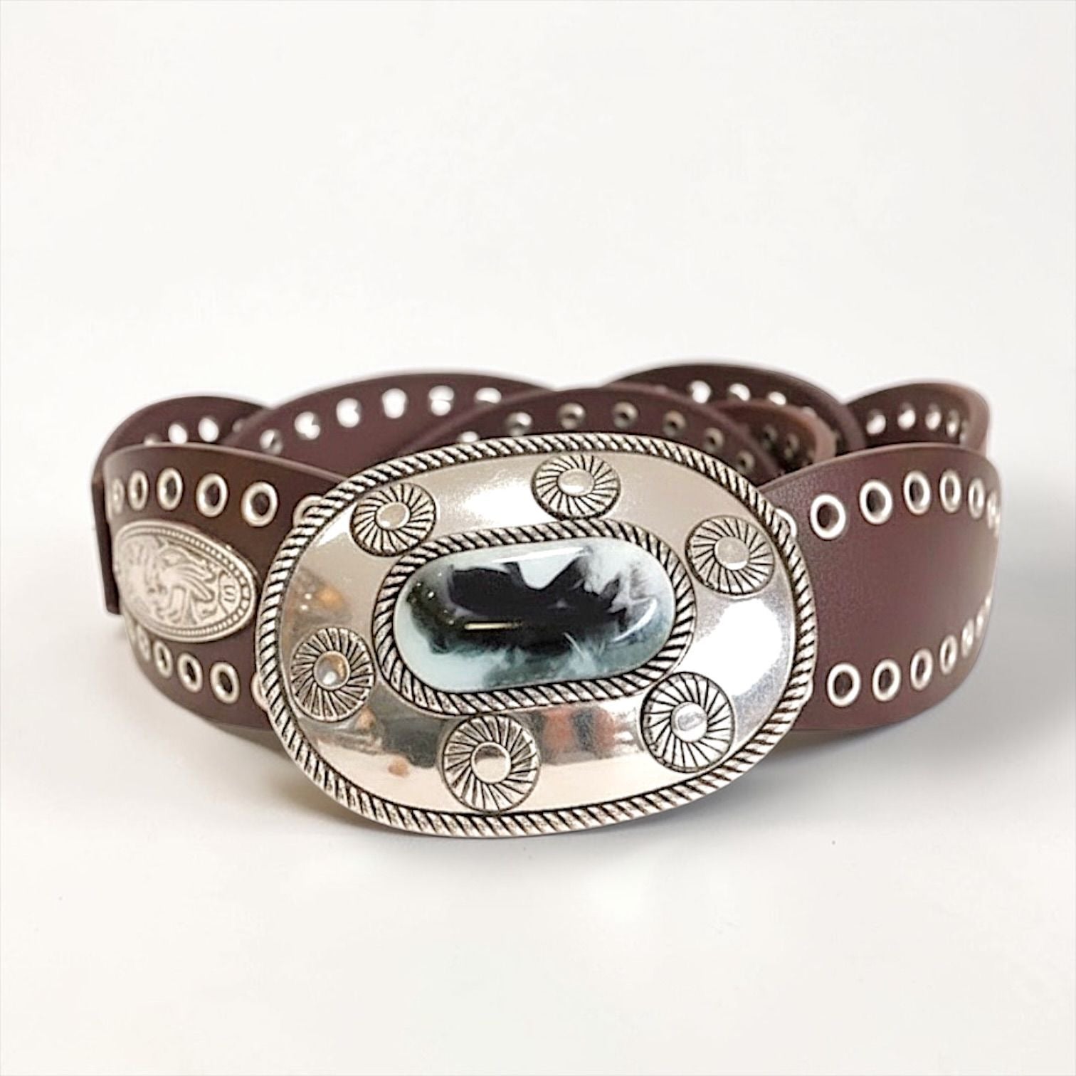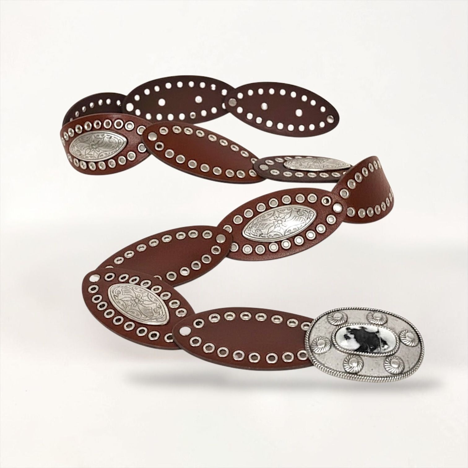 Cinto símil cuero con detalles en metal plateado y trabajos en relieves. Se ajusta según necesidad.