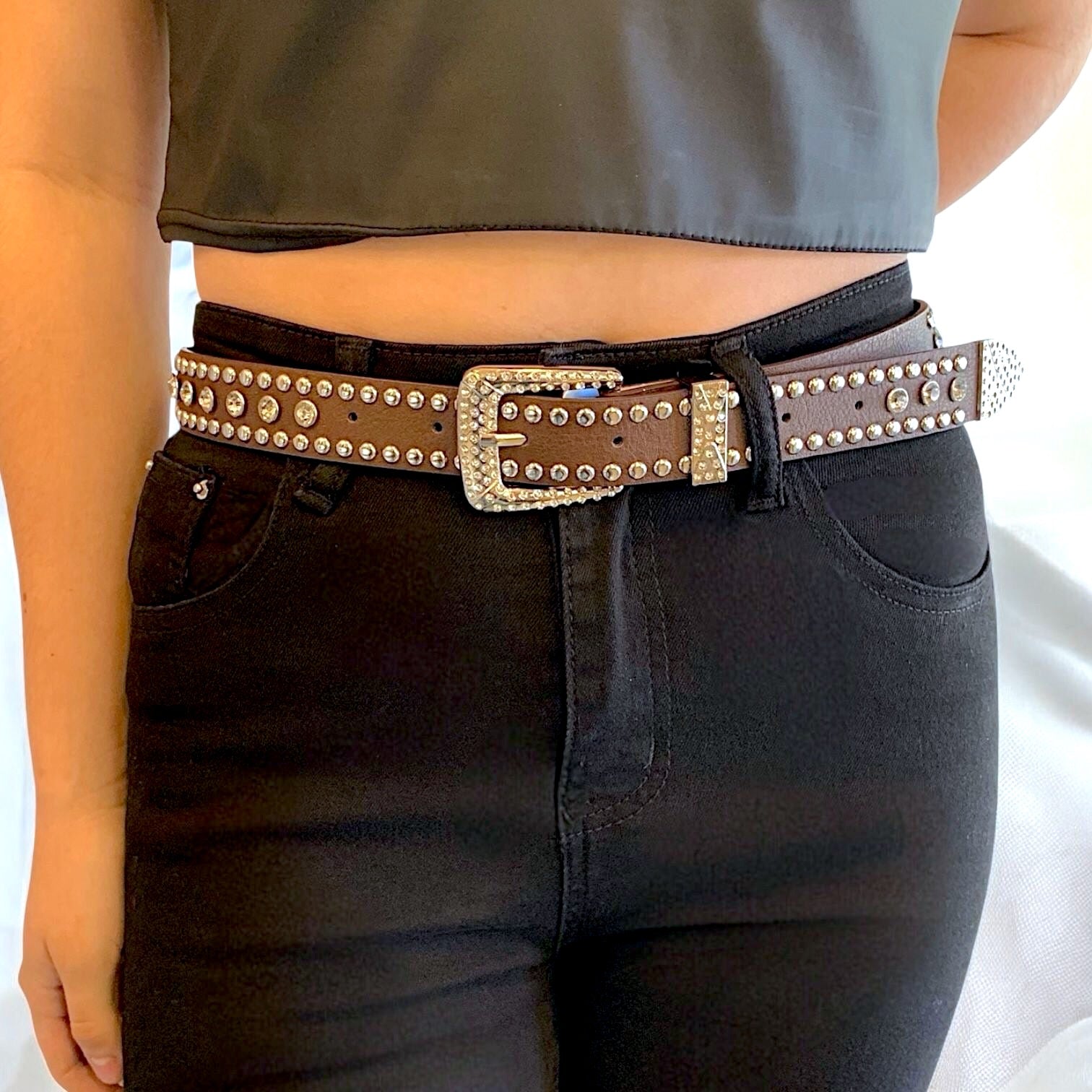 Cinto eco cuero con hebilla y tachas plateadas de metal + piedritas de strass.