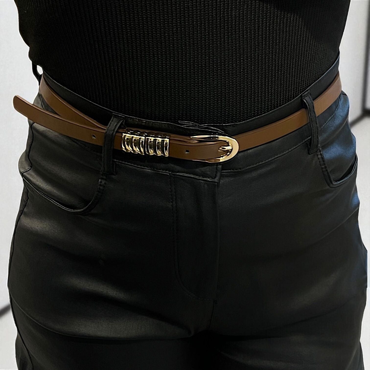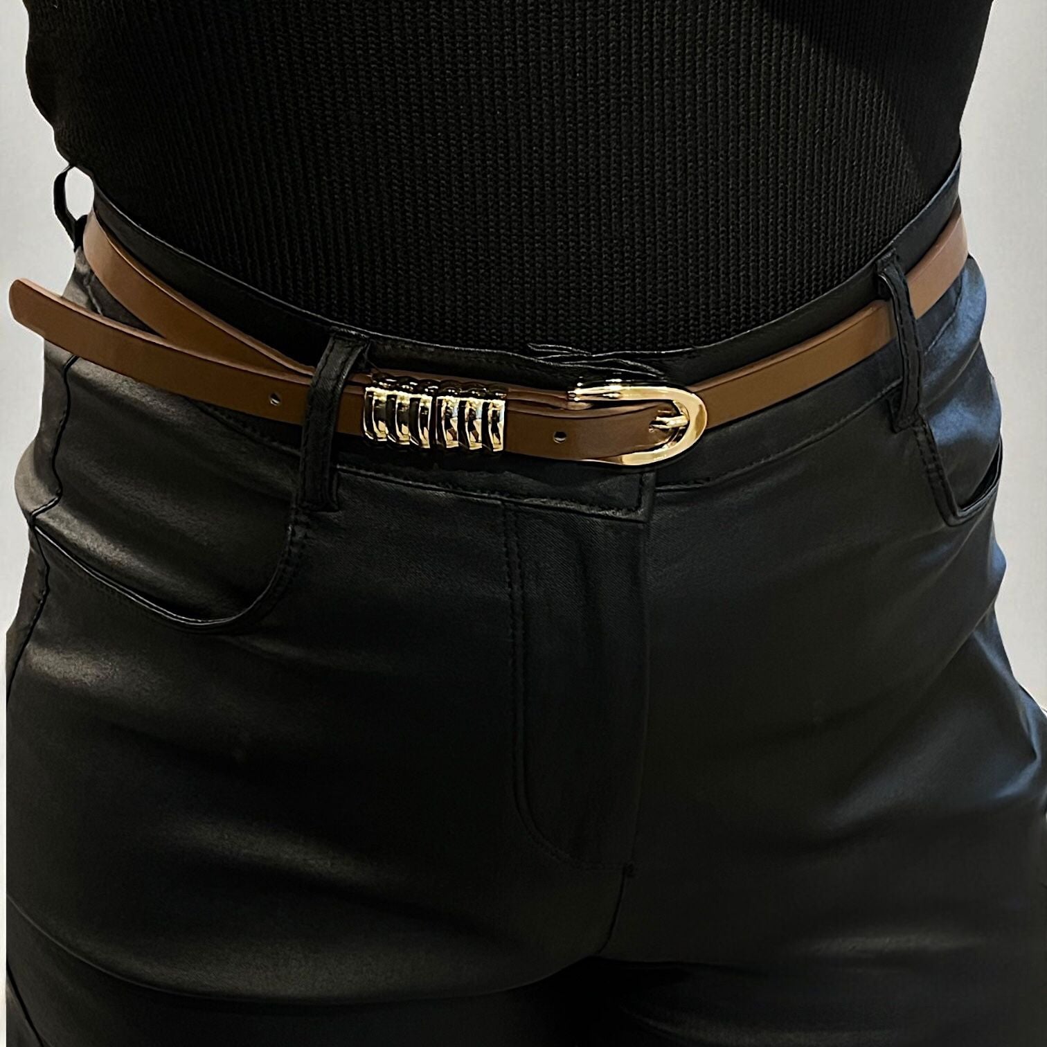 Cinto eco cuero con detalles doradas de metal.