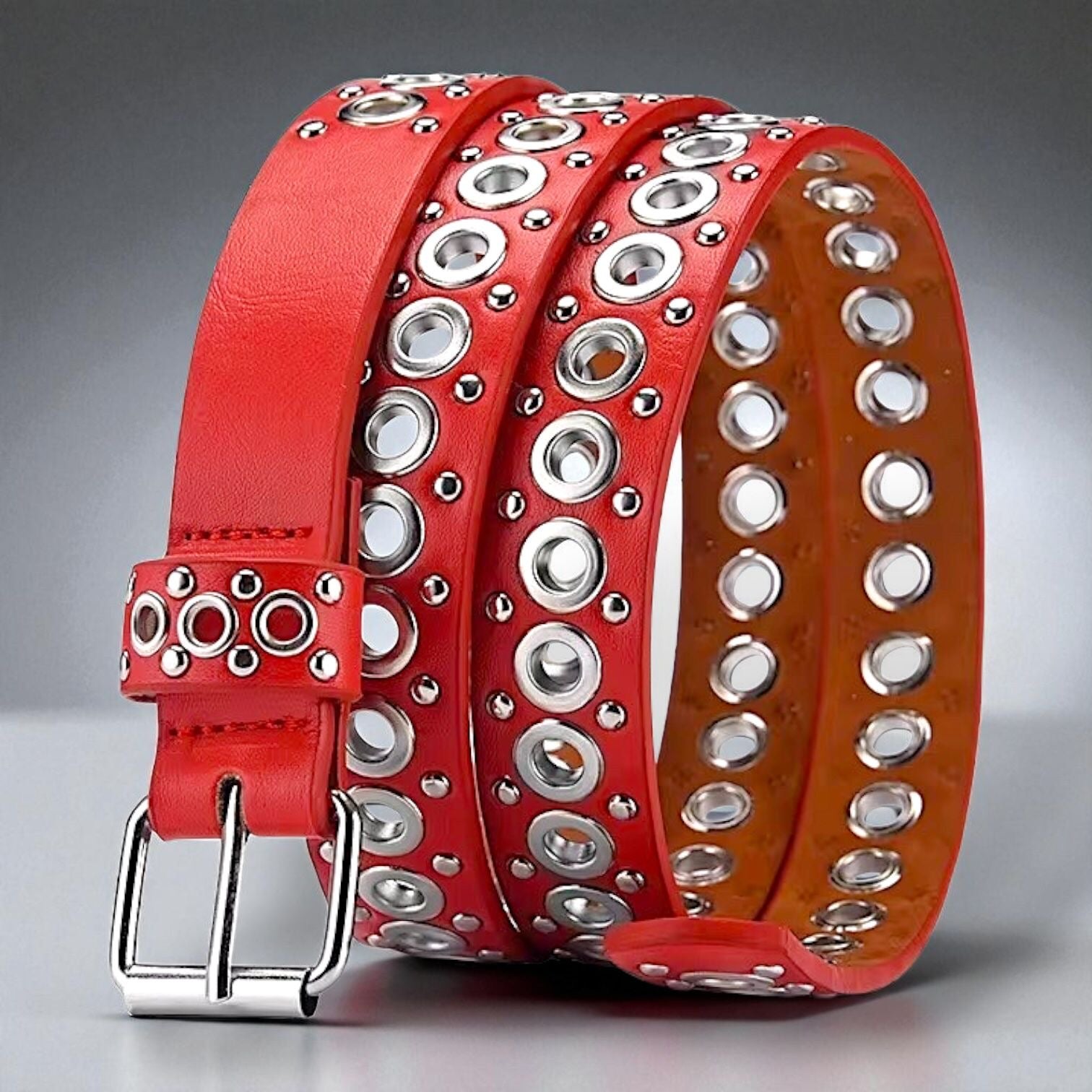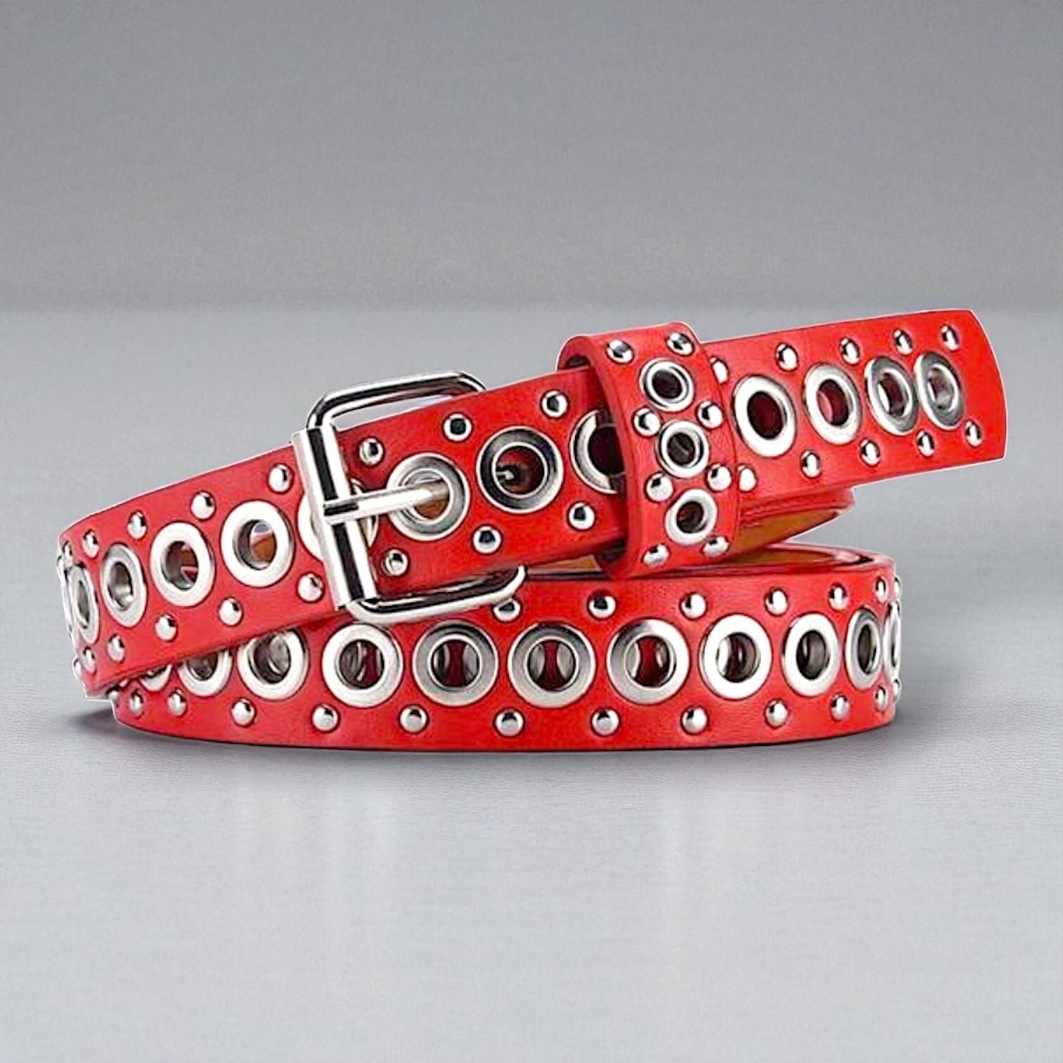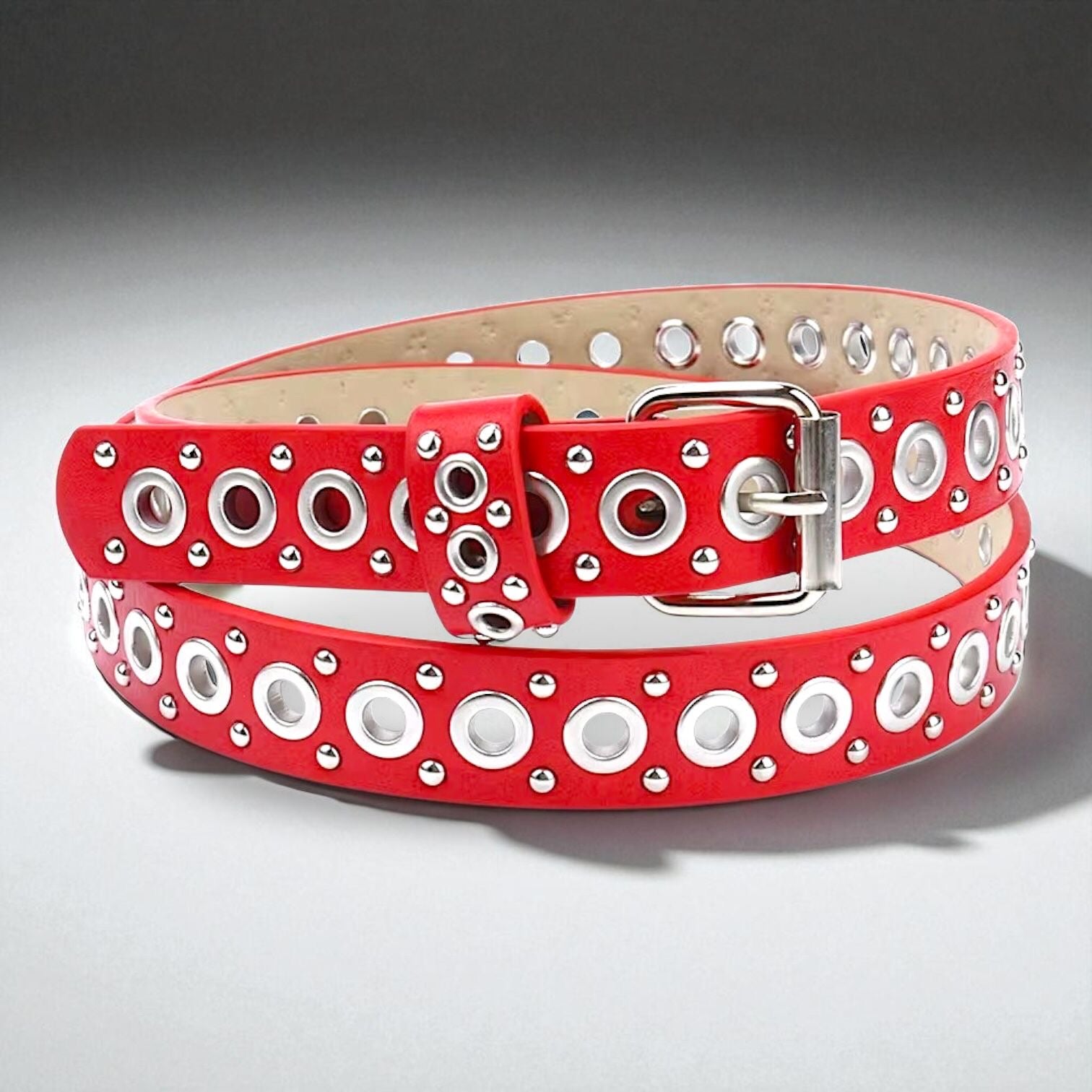 Cinto eco cuero con detalles plateados de metal. Se ajusta según necesidad.