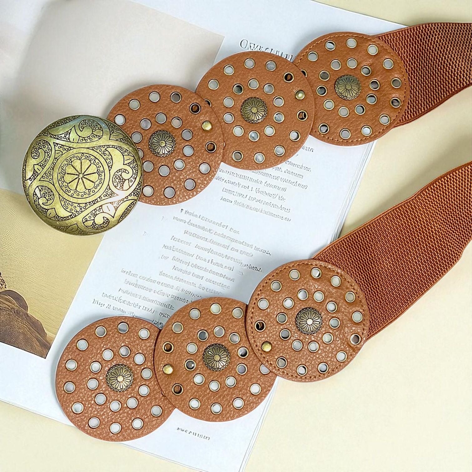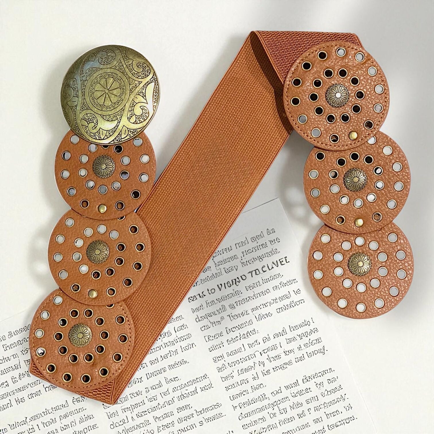 Cinto elastizado en eco cuero con detalles en metal dorado envejecido.