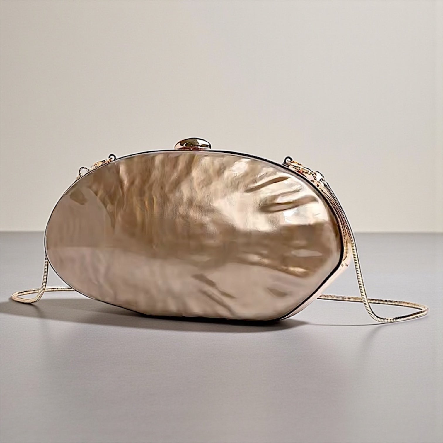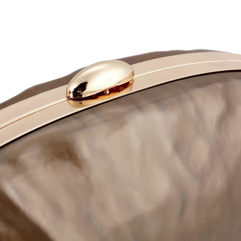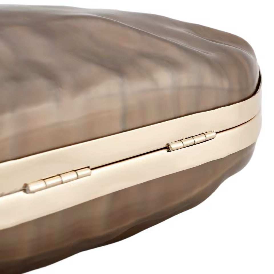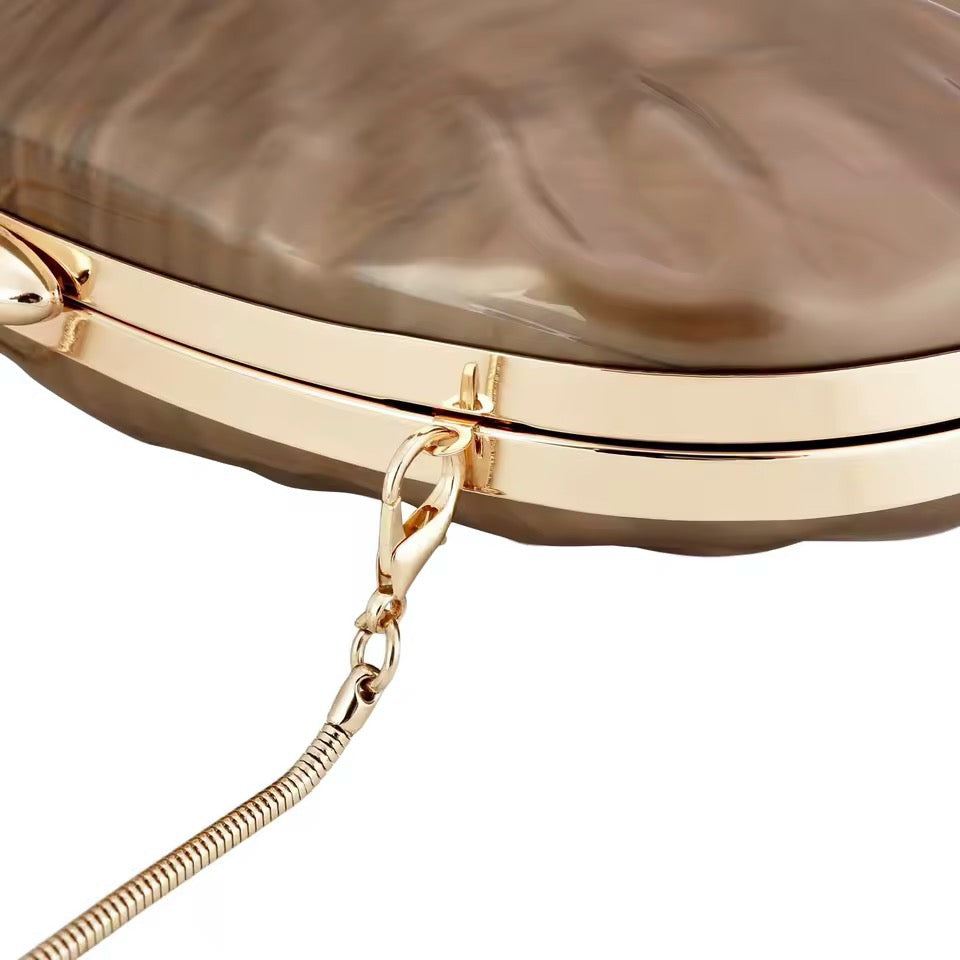 Clutch de carey (símil nácar) totalmente forrado por dentro con detalles dorados + 1 cadena para colgar.