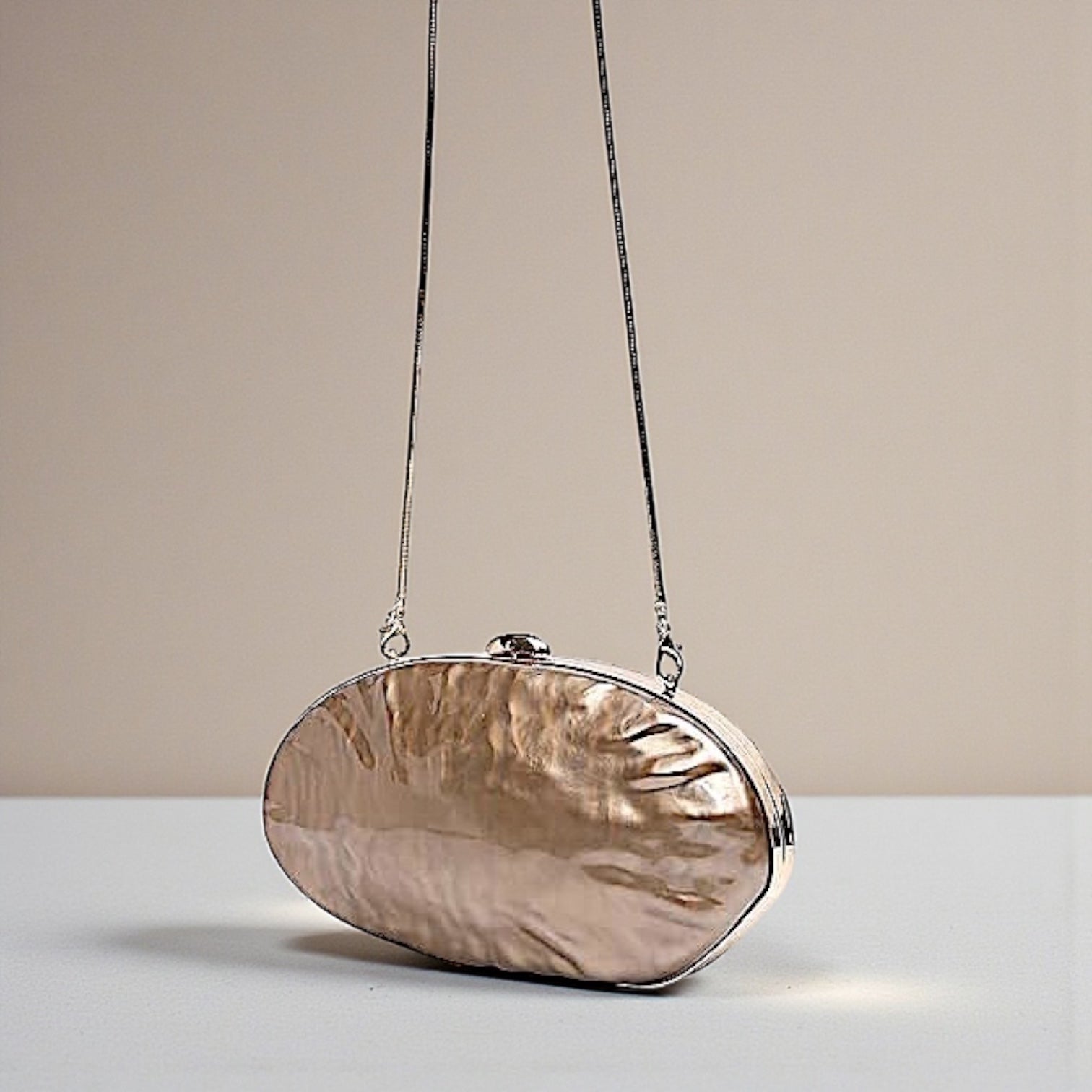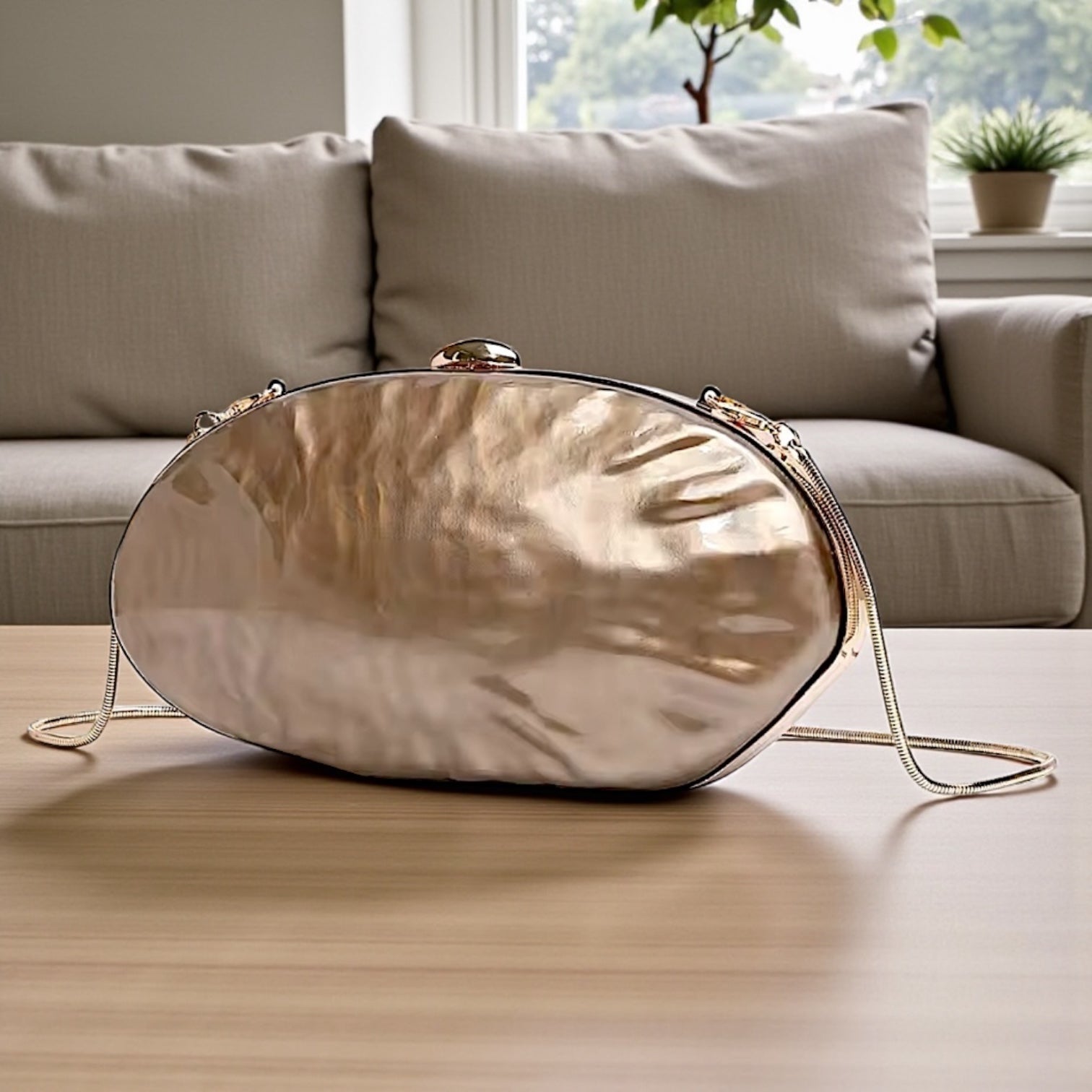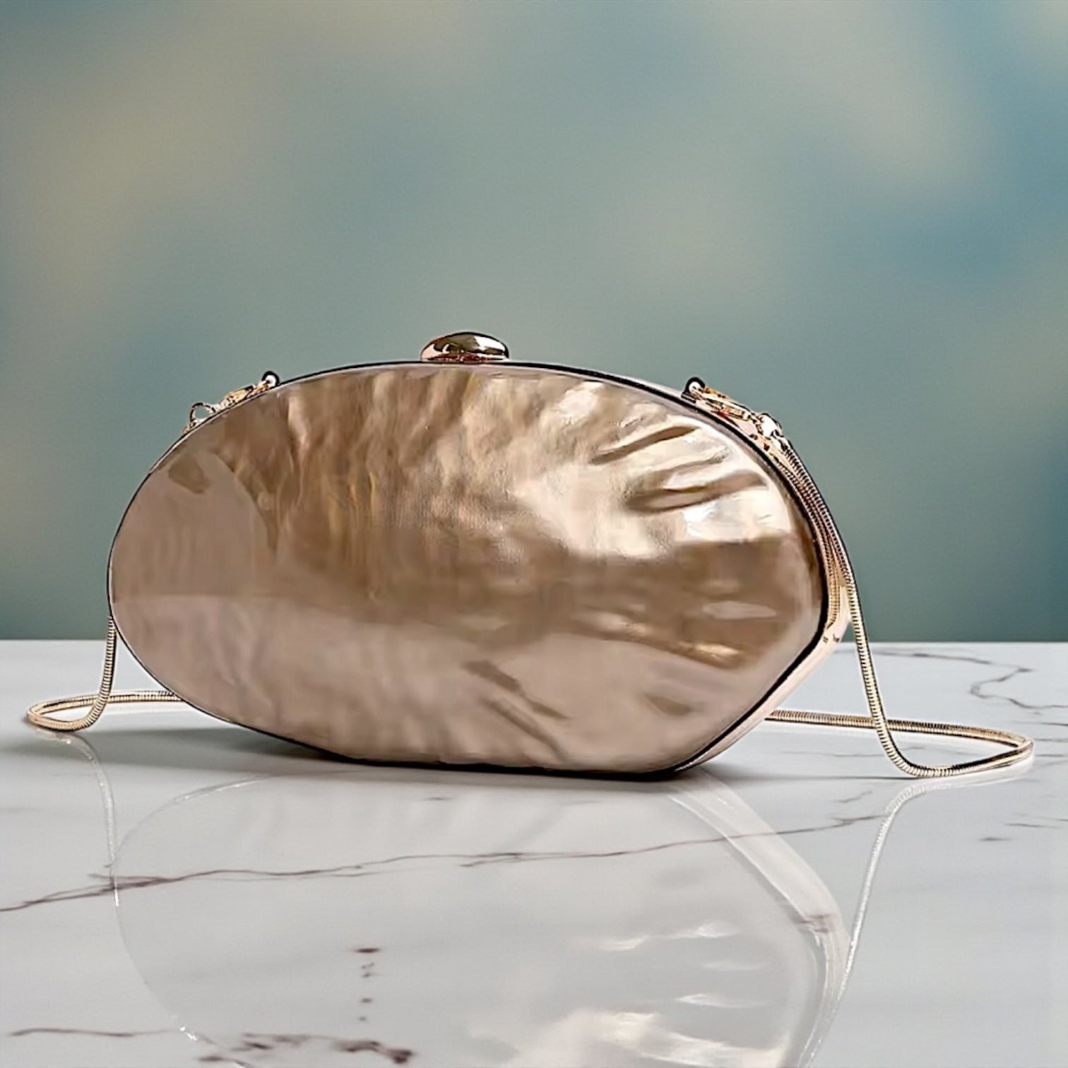Clutch de carey (símil nácar) totalmente forrado por dentro con detalles dorados + 1 cadena para colgar.