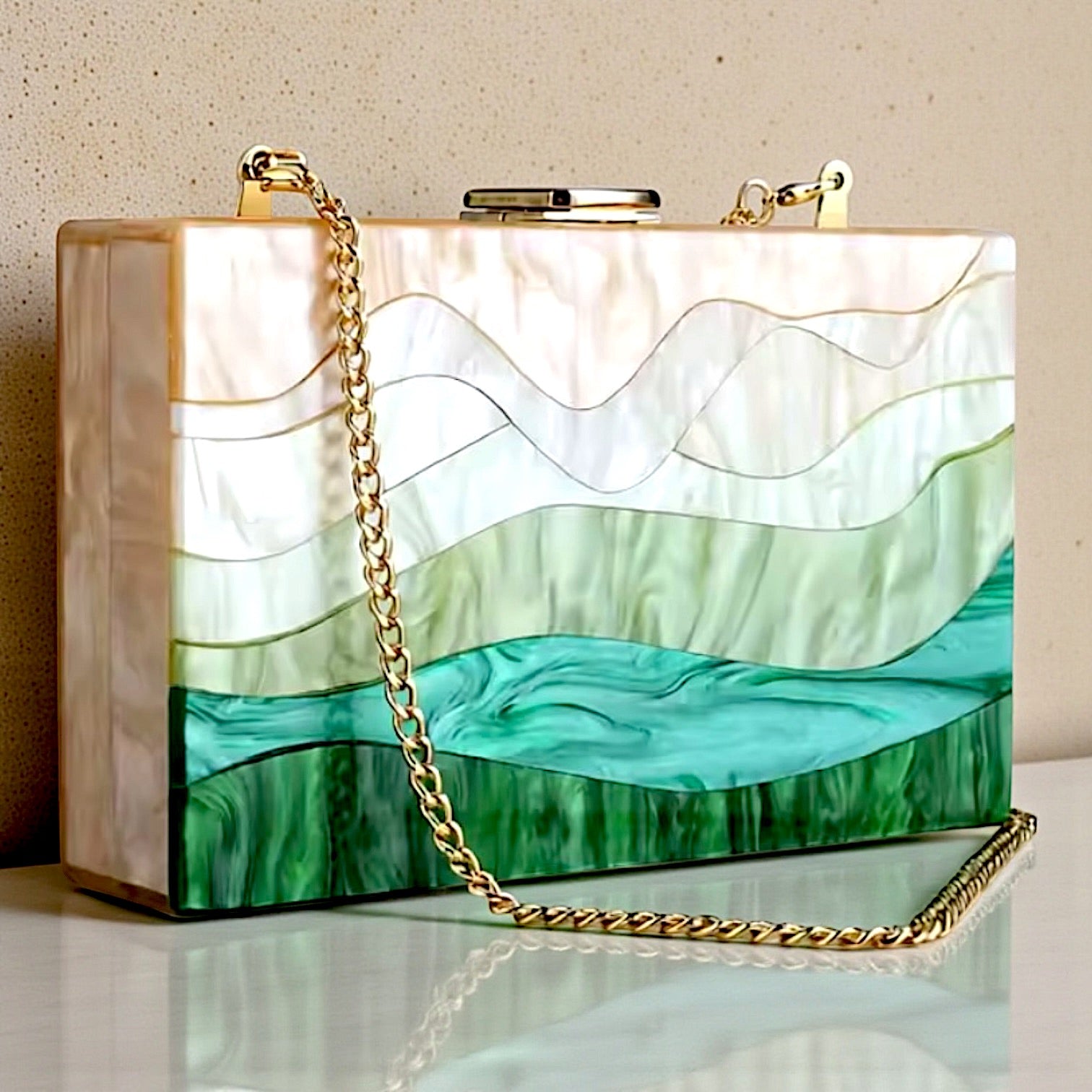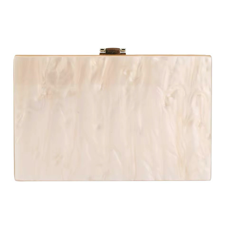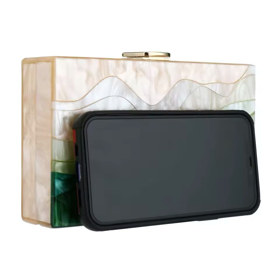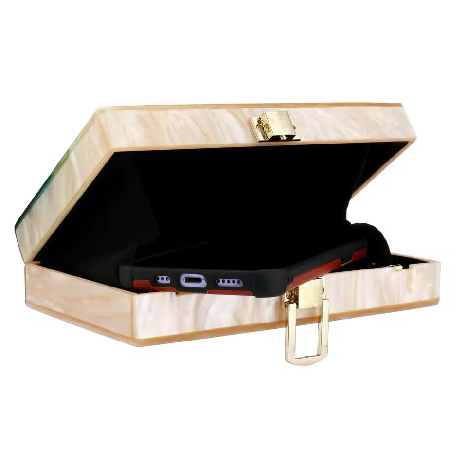 Clutch de carey (símil nácar) totalmente forrado por dentro con detalles dorados + 1 cadena para colgar.