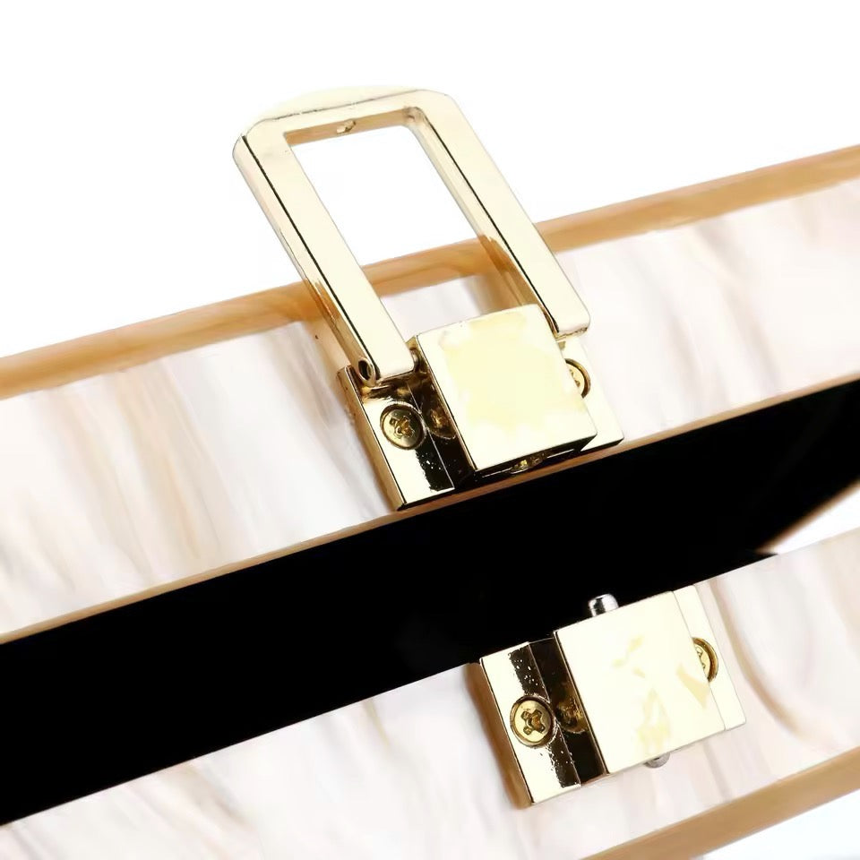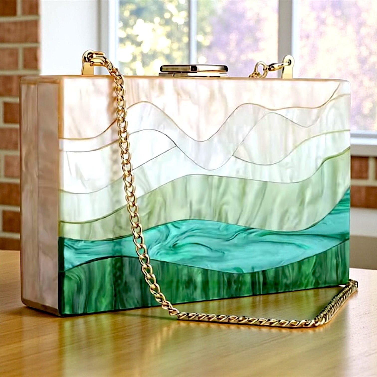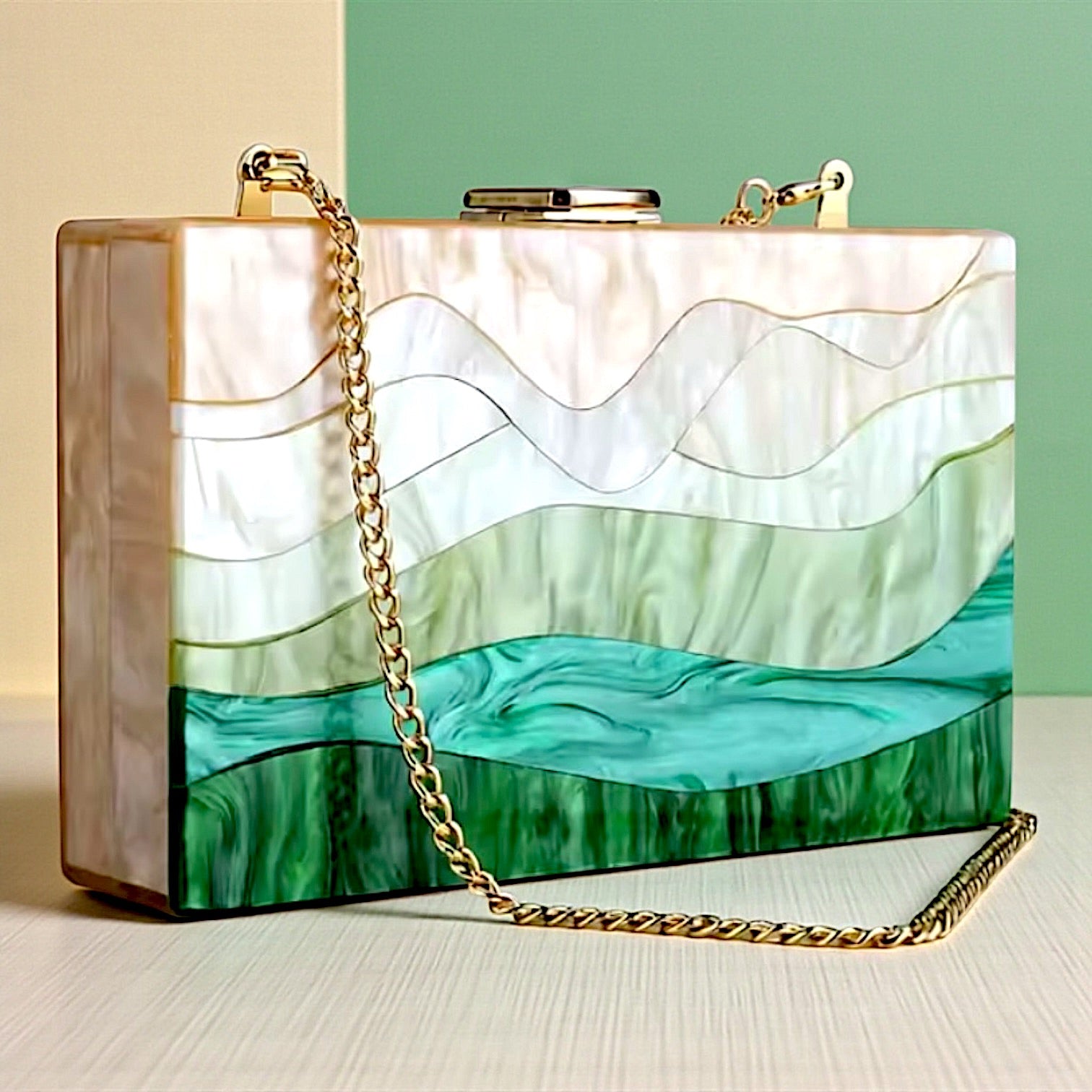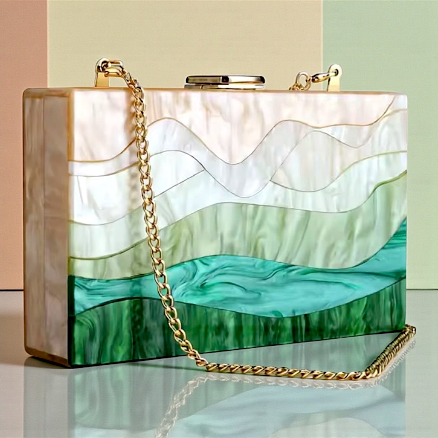 Clutch de carey (símil nácar) totalmente forrado por dentro con detalles dorados + 1 cadena para colgar.