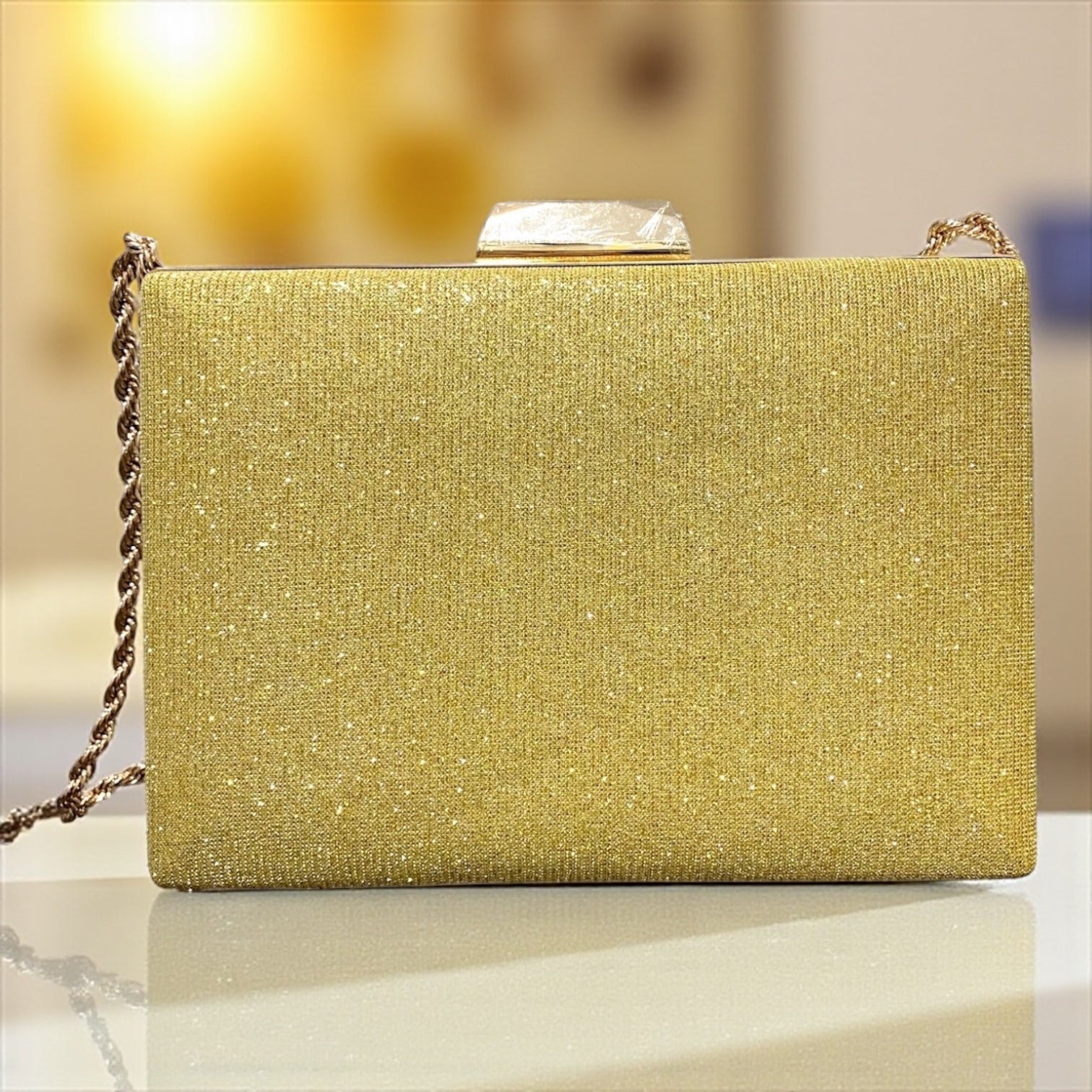 Clutch/carterita dorada brillosa con detalles en metal + 1 cadena para colgar, totalmente forrada por dentro.