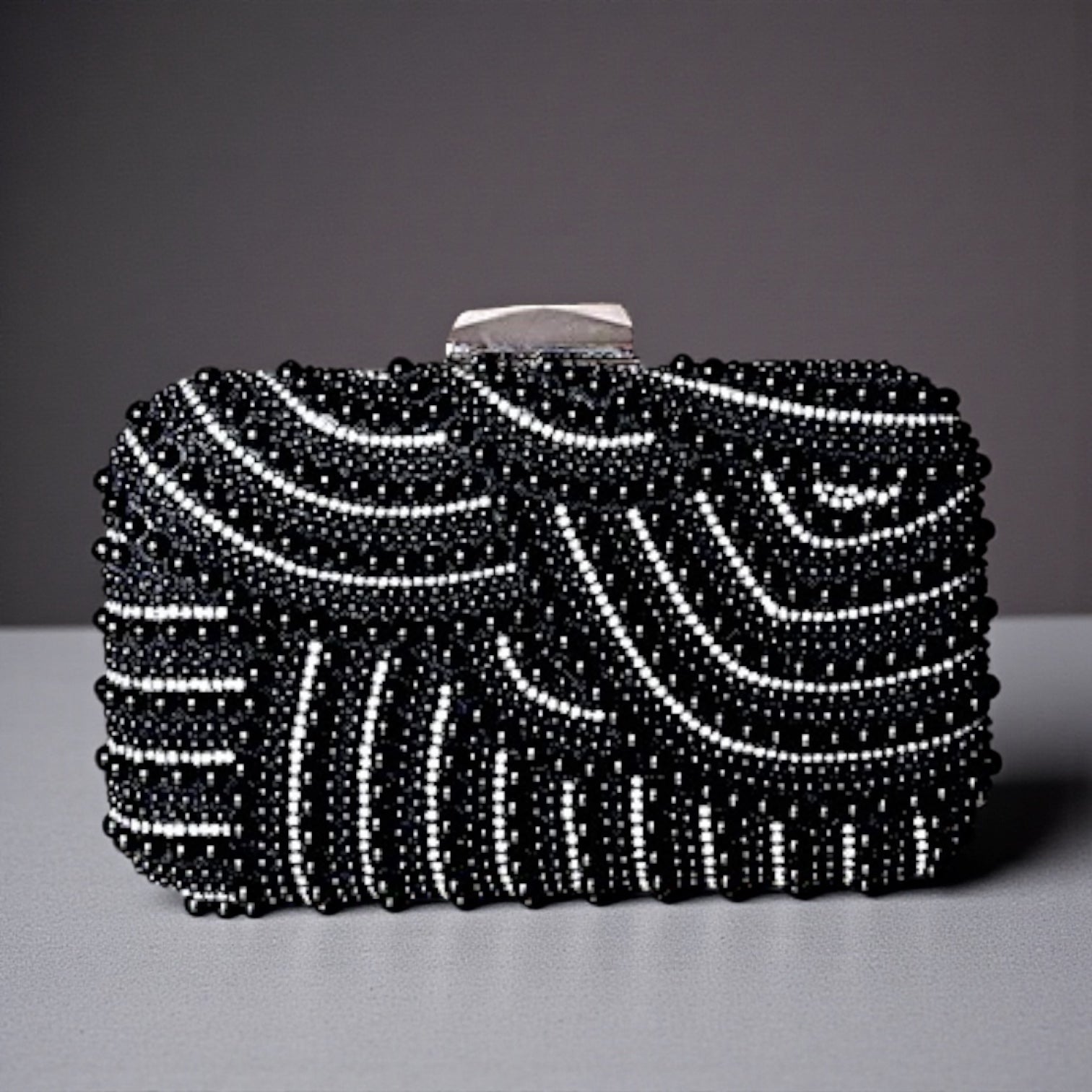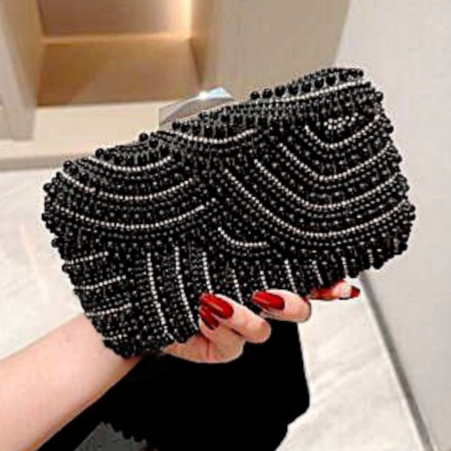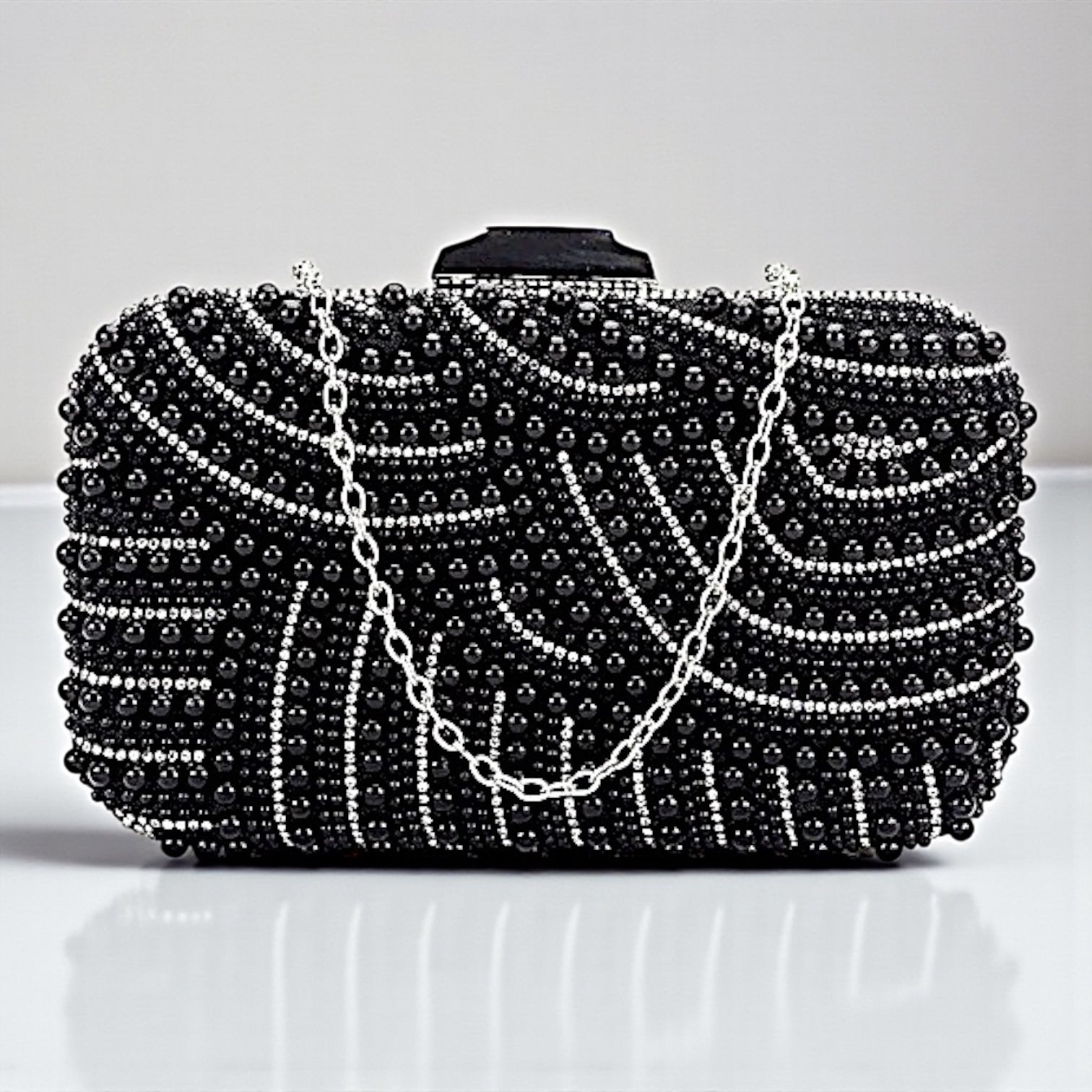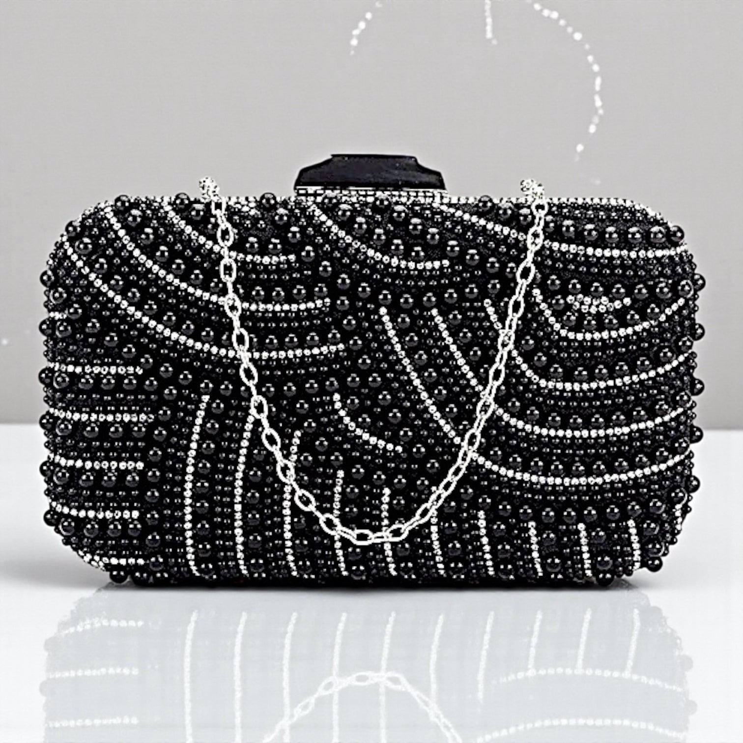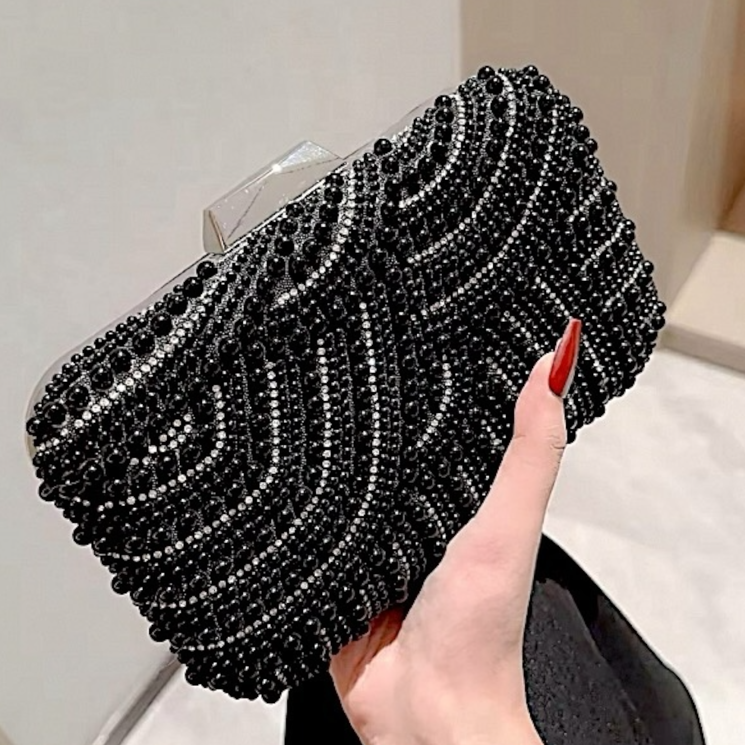 Clutch con Perlas y piedritas de strass + detalles en meta plateado + 1 cadena para colgar, totalmente forrado por dentro.