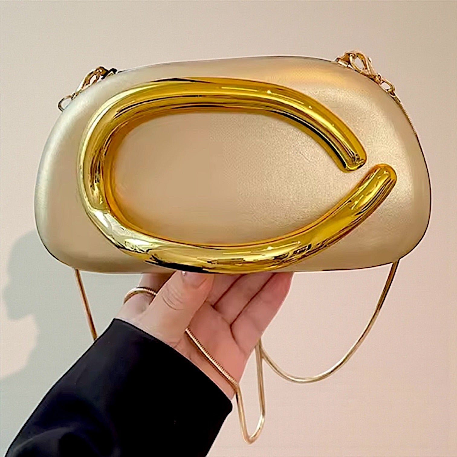 Clutch dorada opaca en eco cuero, con detalle dorado en carey + 1 cadena para colgar, totalmente forrado por dentro.