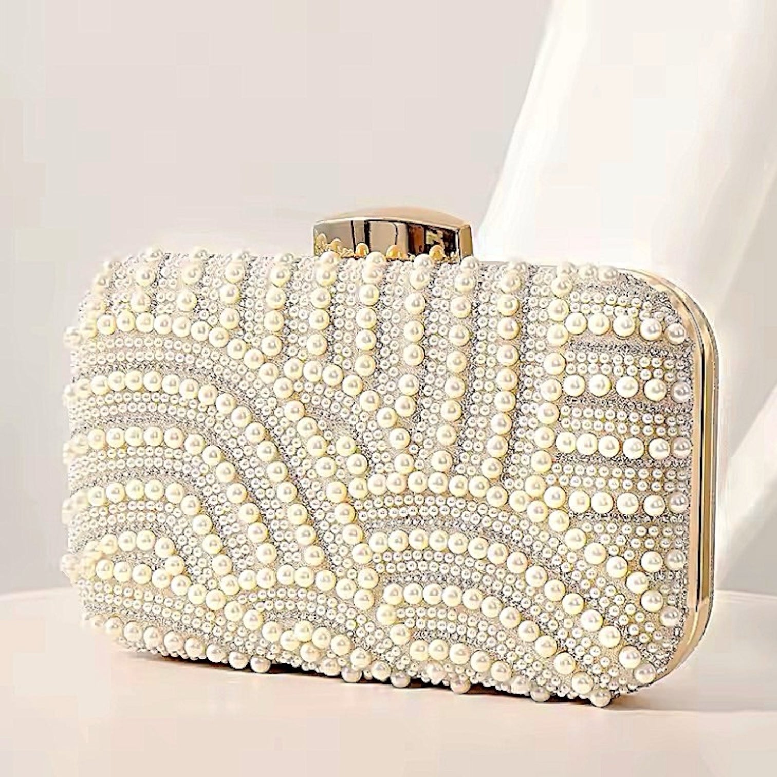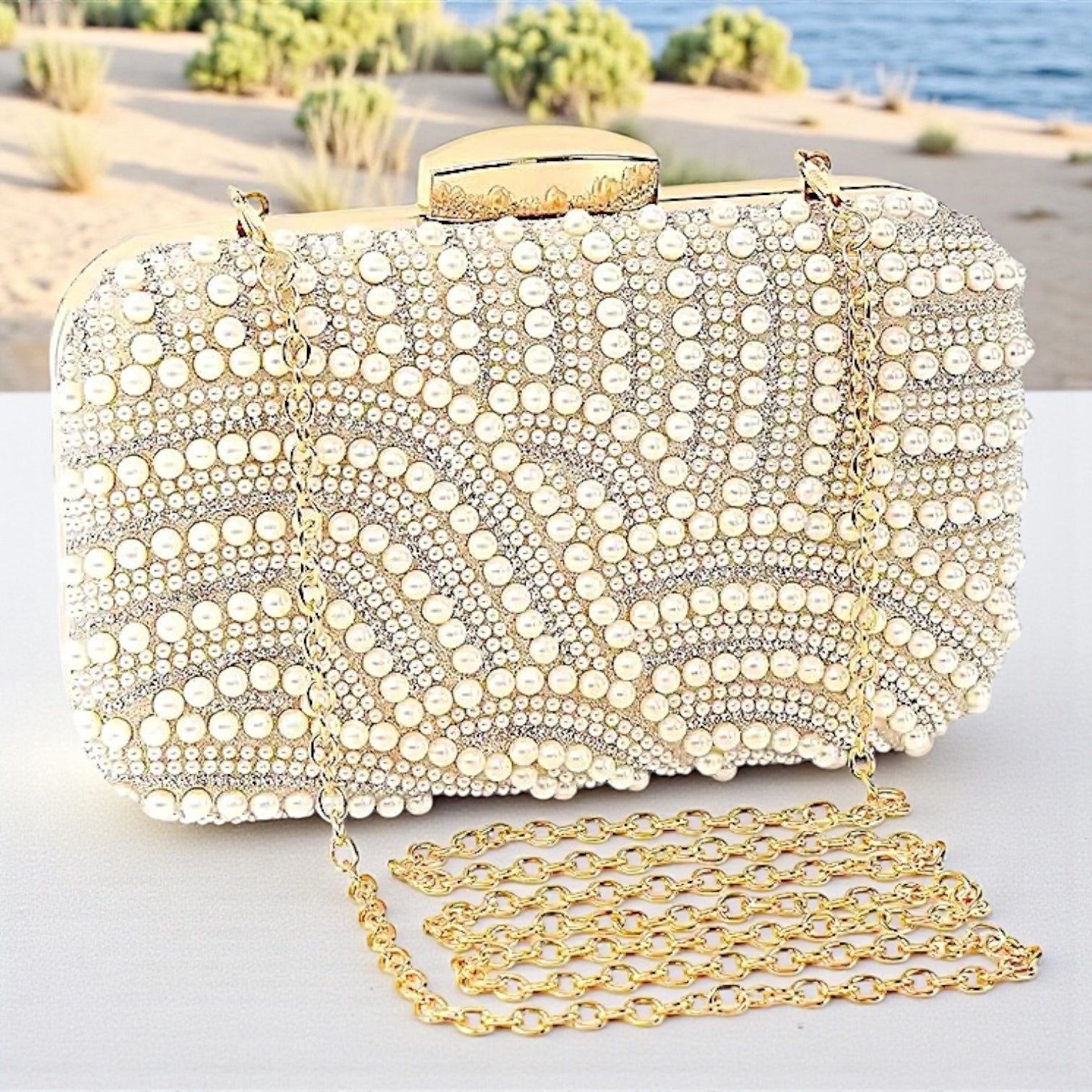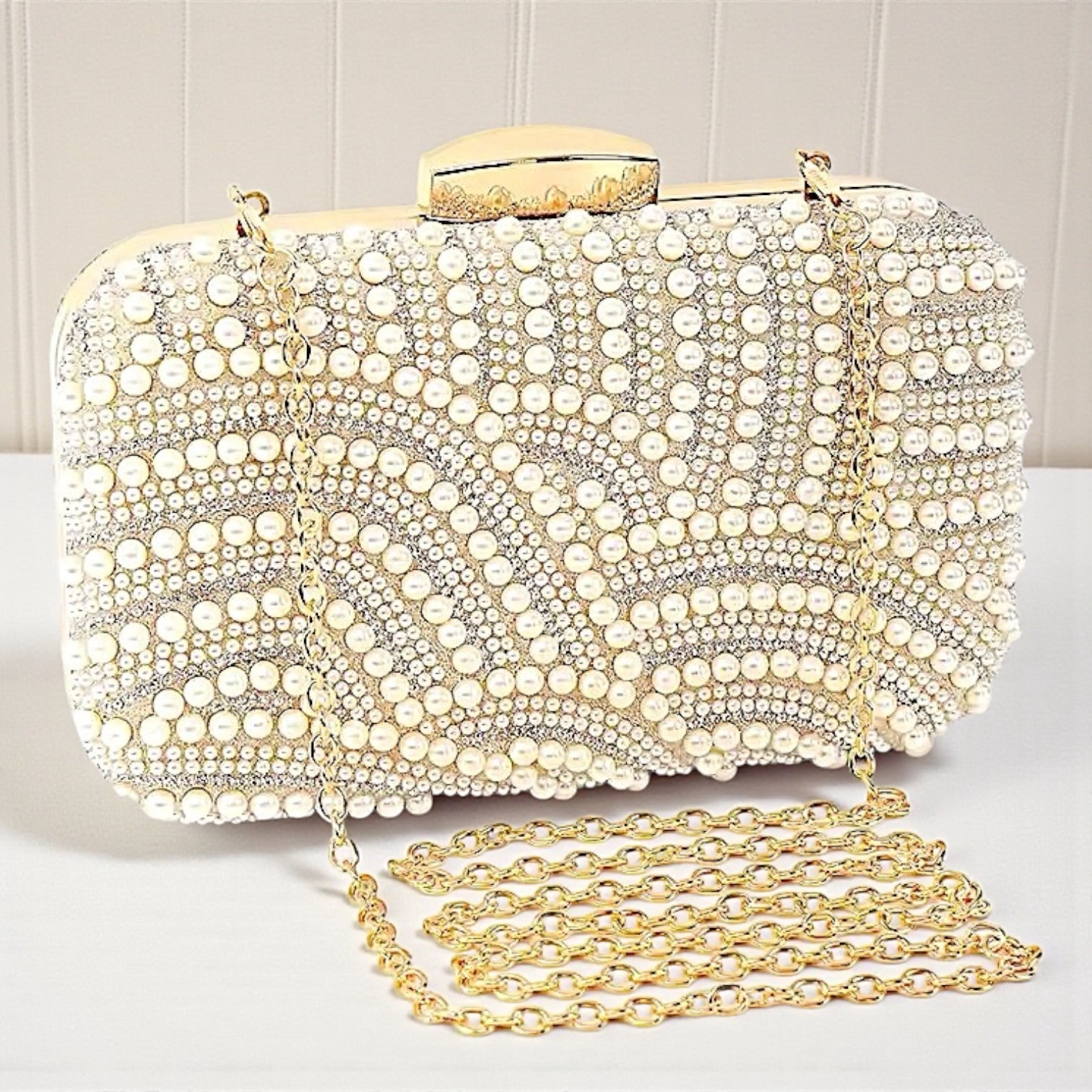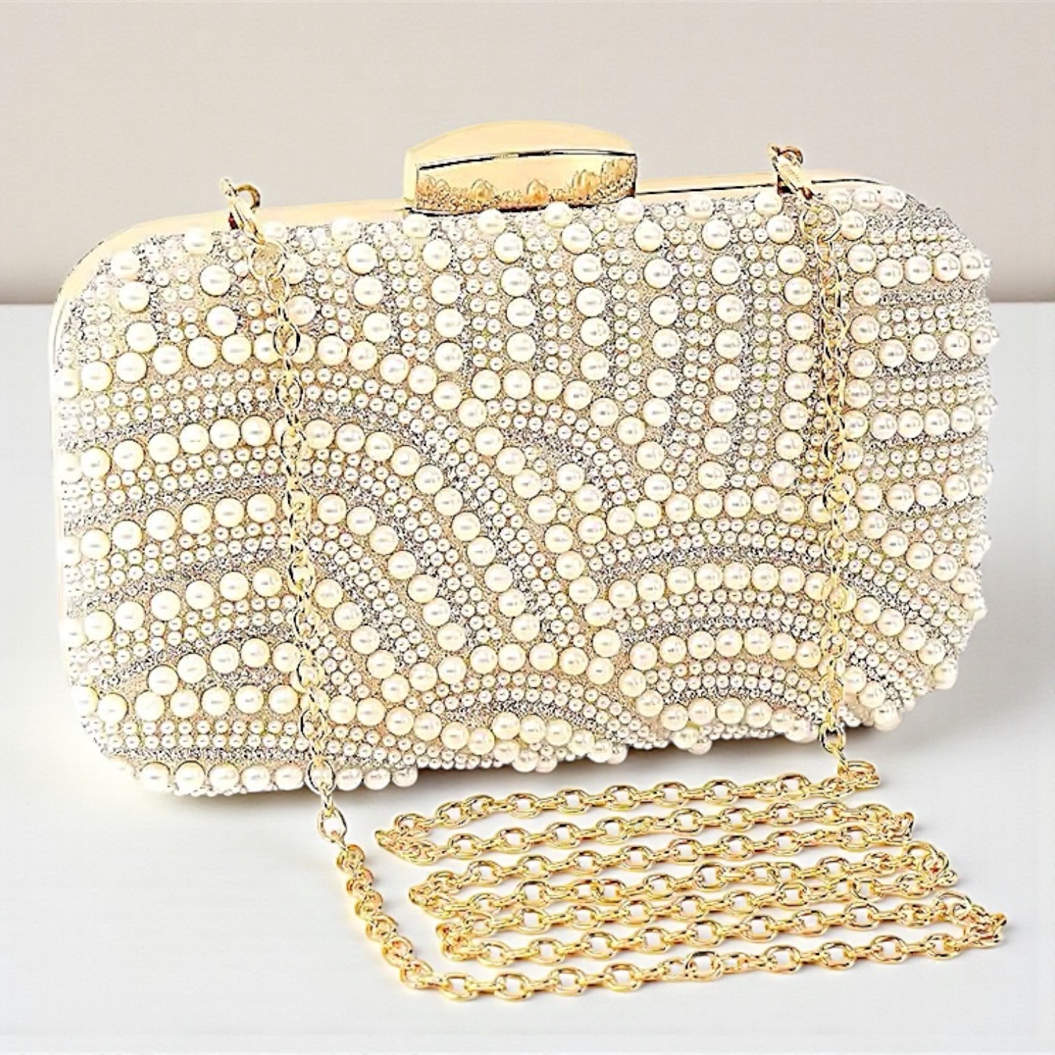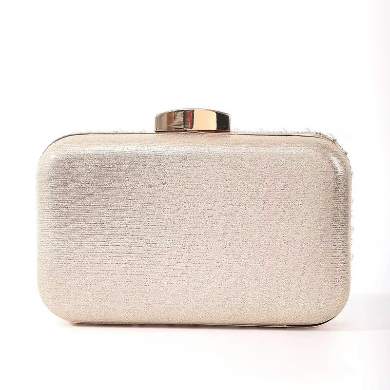 Clutch con Perlas y piedritas de strass + detalles en meta dorado + 1 cadena para colgar, totalmente forrado por dentro.
