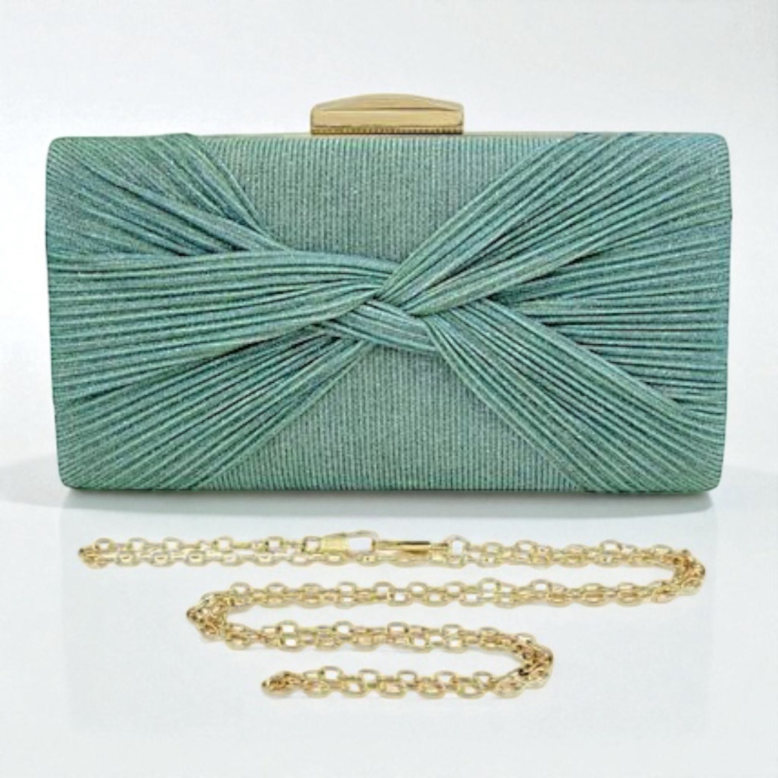 Clutch brilloso con detalles en metal + 1 cadena para colgar, totalmente forrado por dentro.