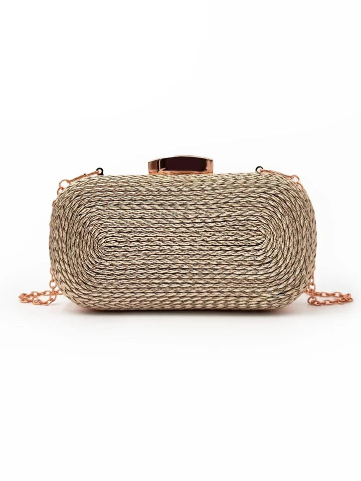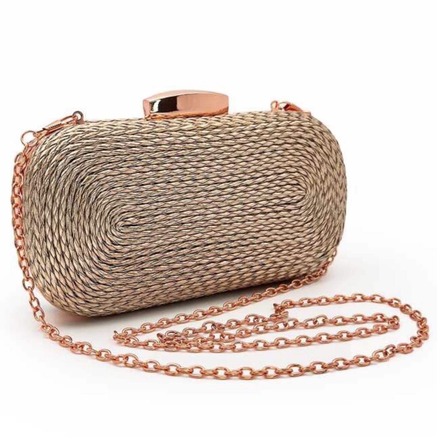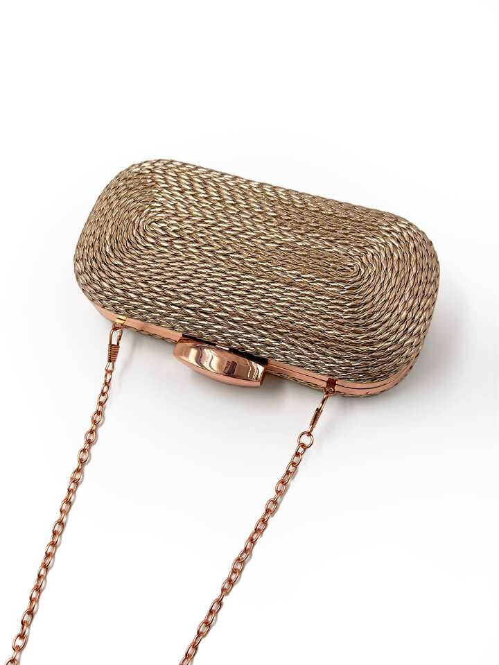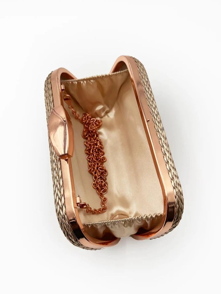 Clutch rosé con trabajos trenzados en simil cuero + 1 cadena para colgar, totalmente forrada por dentro.