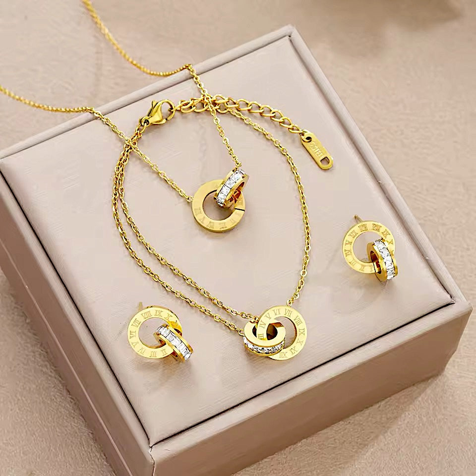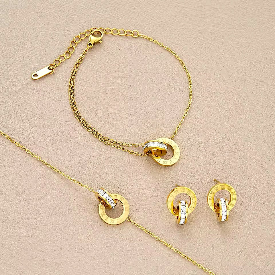 Collar, Aros y pulsera de Acero cin piedritas de strass