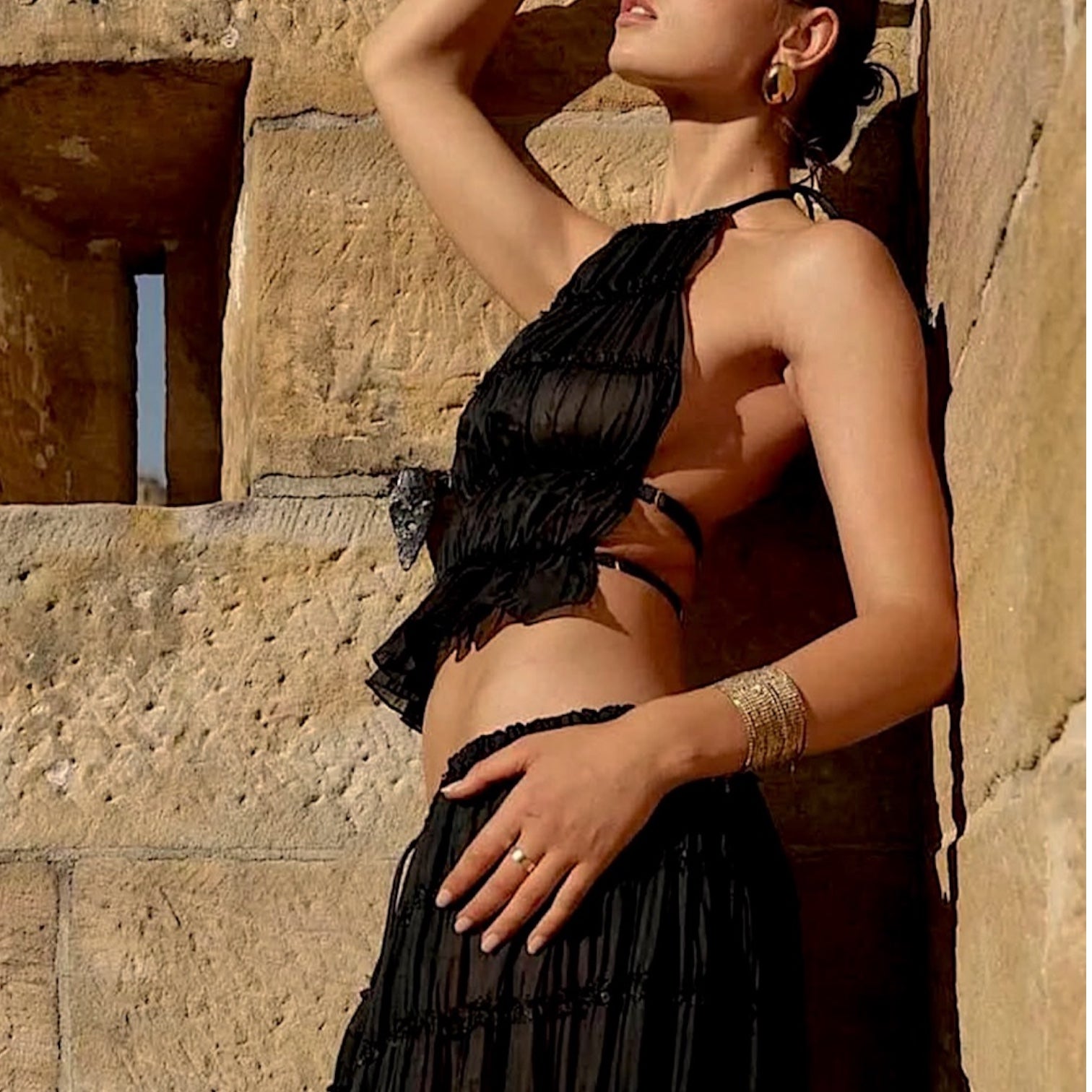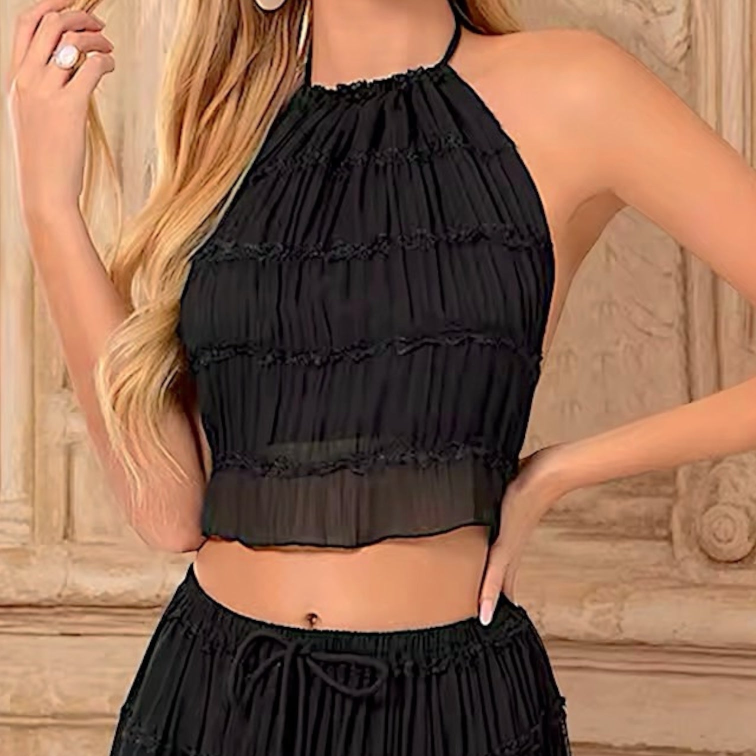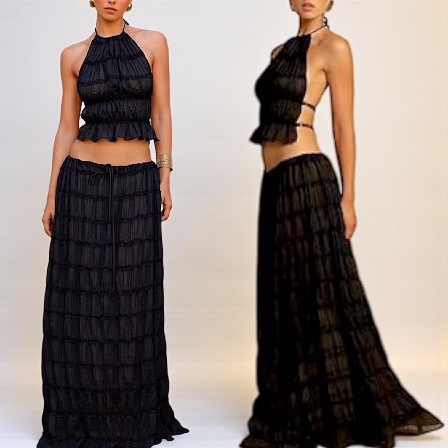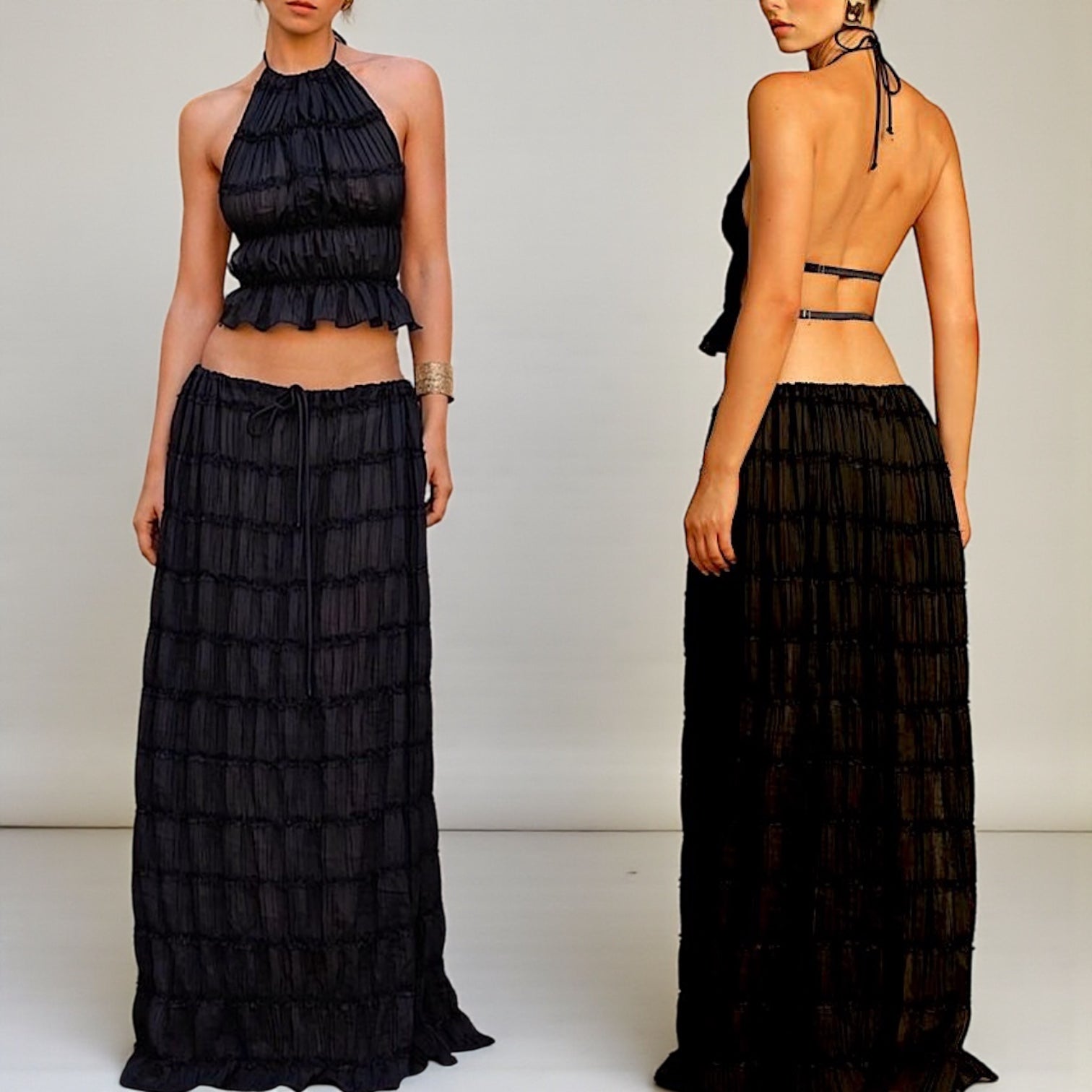Pollera con goma que puede usarse cintura alta o de cadera (con forro) + blusa halter con espalda abierta (los dos elásticos se ajustan según necesidad.