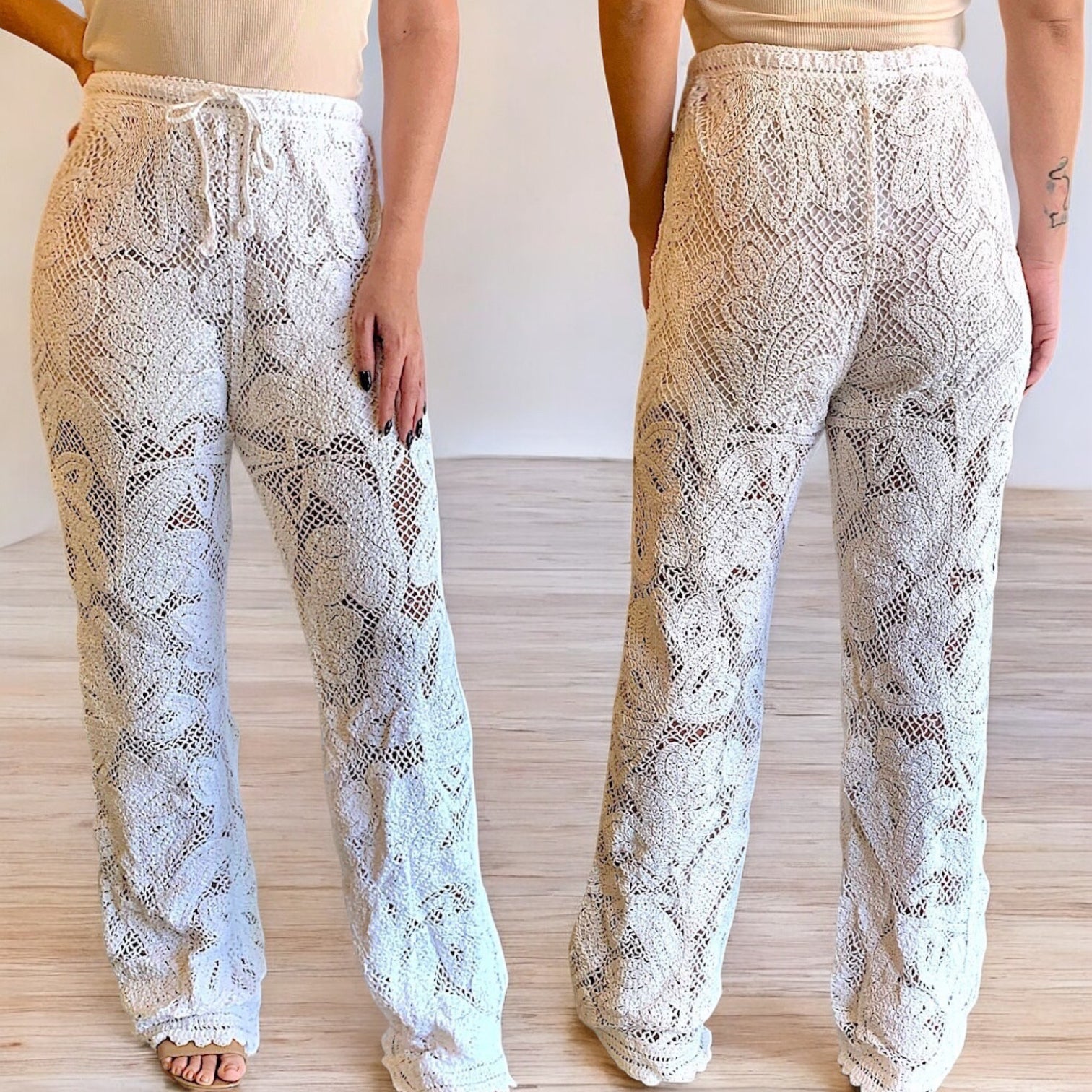 Pantalón blanco en croché, cintura alta con engomado y short.