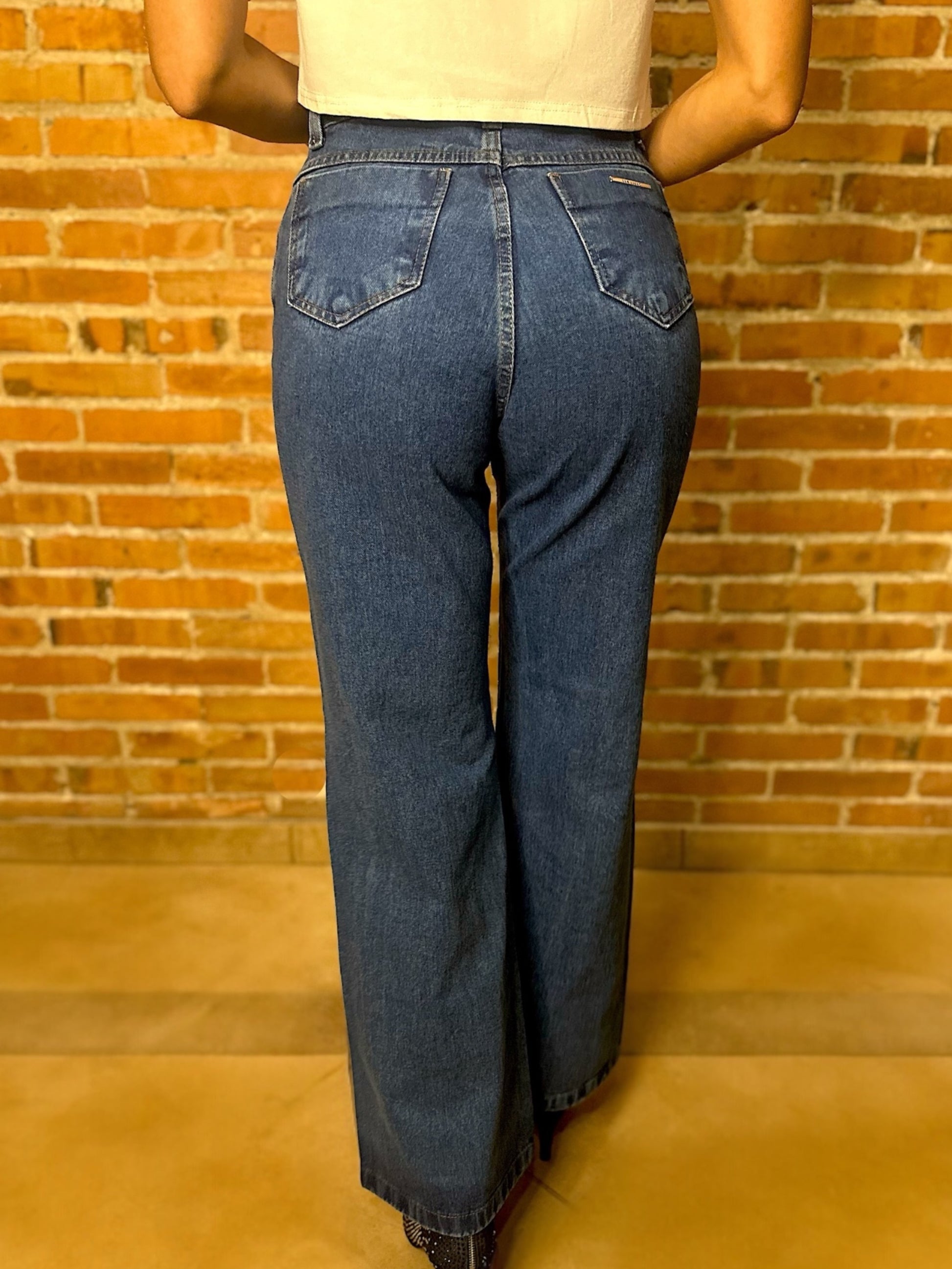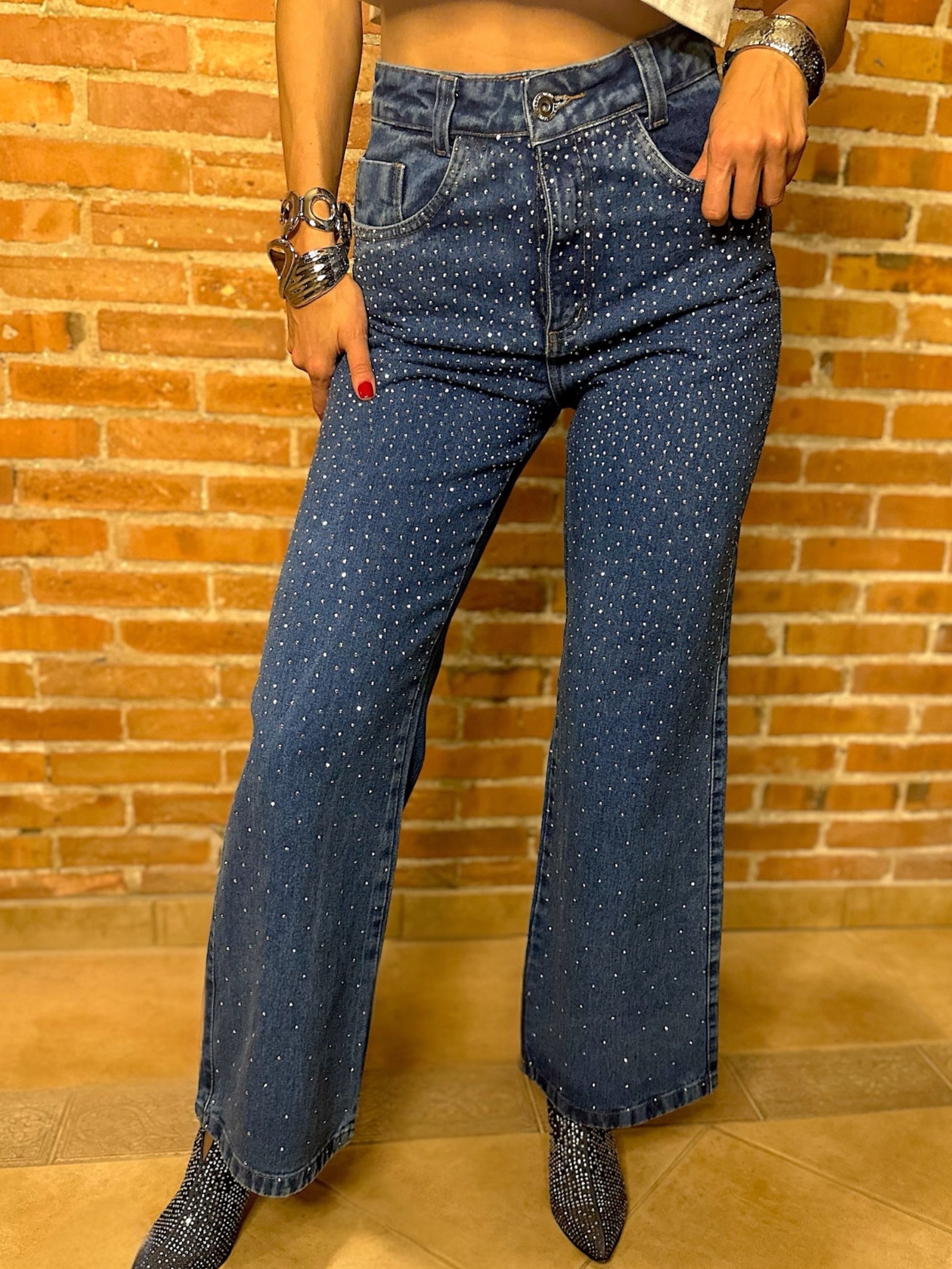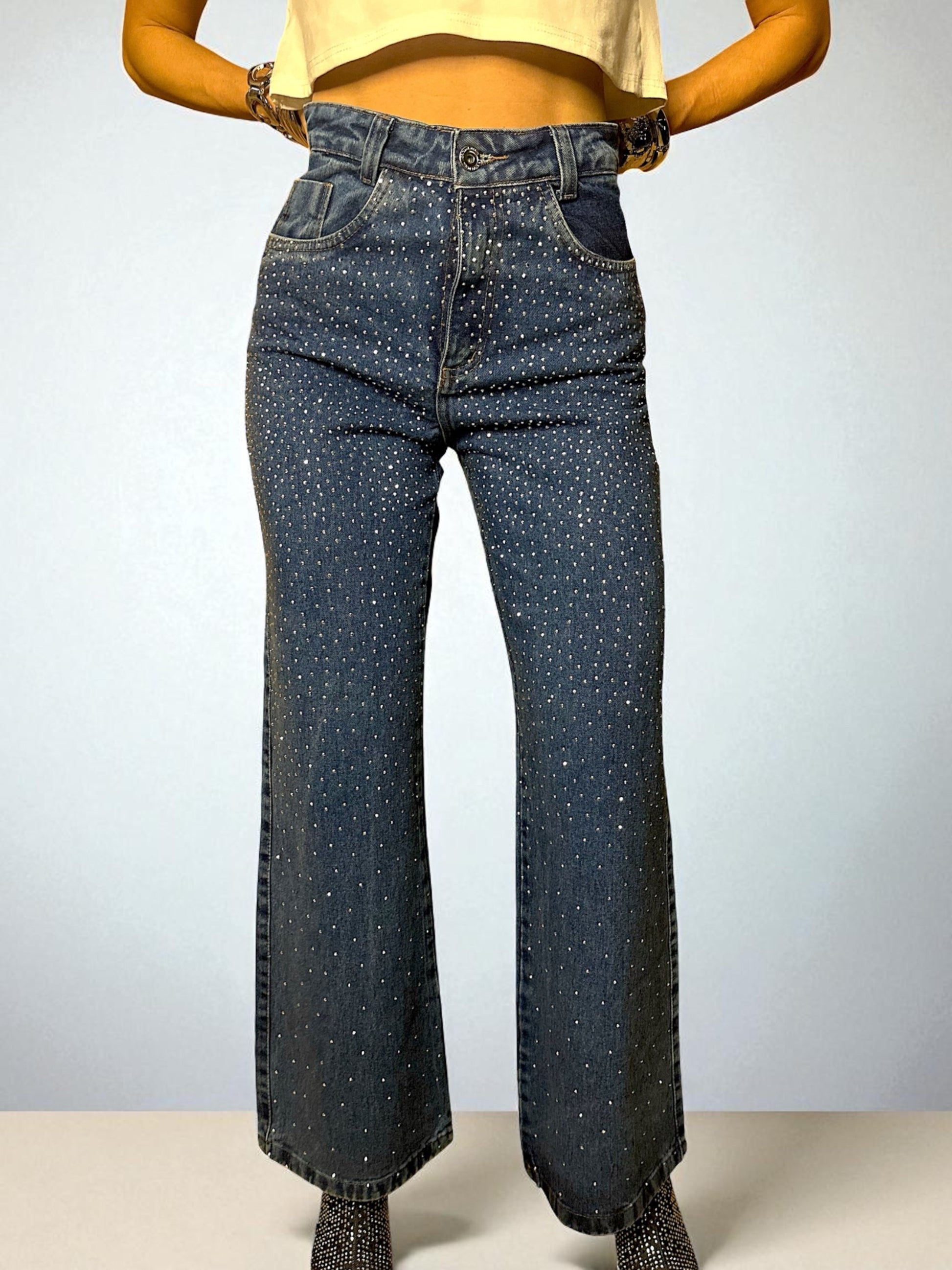 Pantalón no elastizado de jean, cintura alta, bolsillos a los costados y atrás con piedritas de strass.
