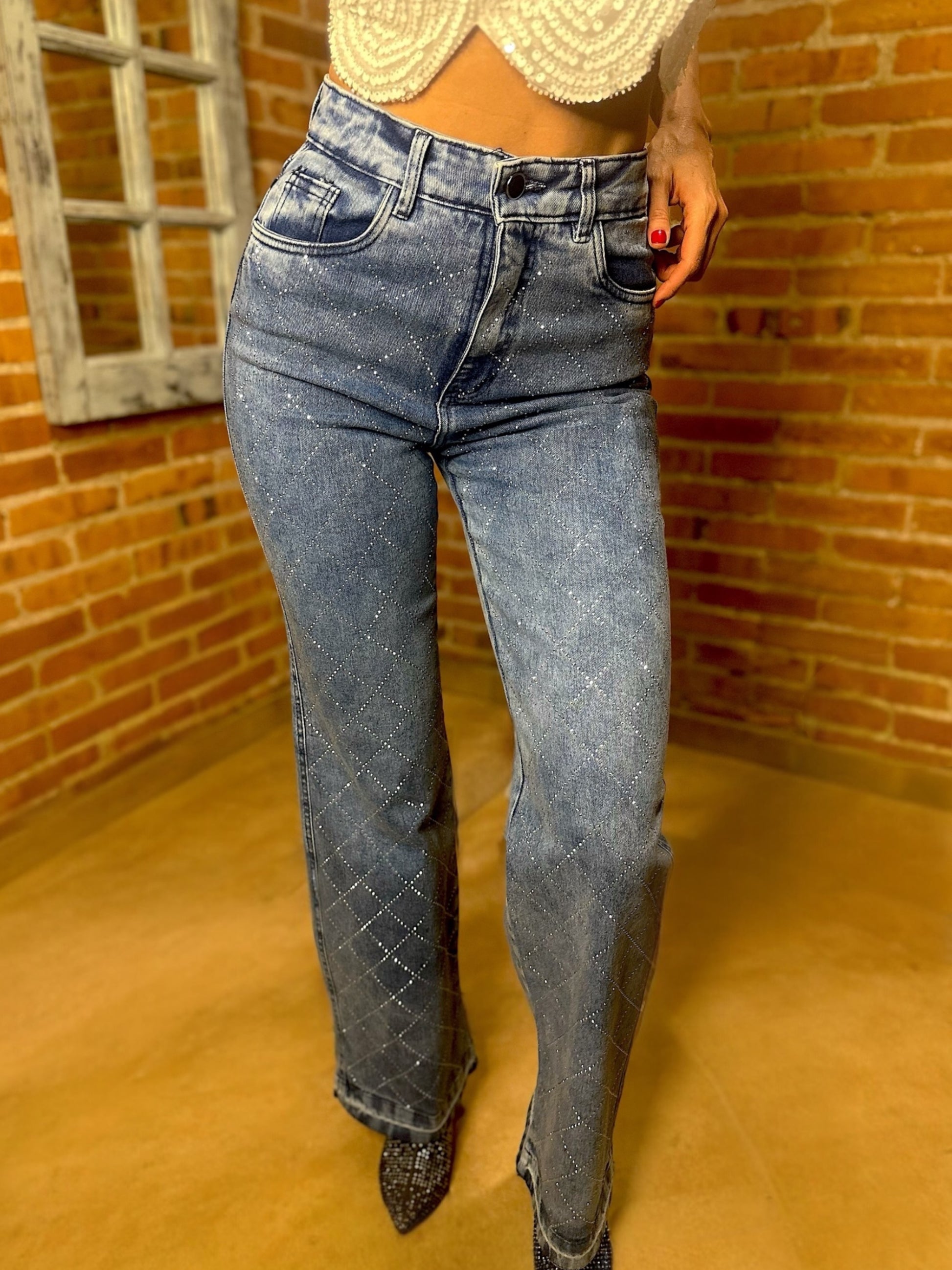 Pantalón elastizado de jean, cintura alta, bolsillos a los costados y atrás con piedritas de strass.