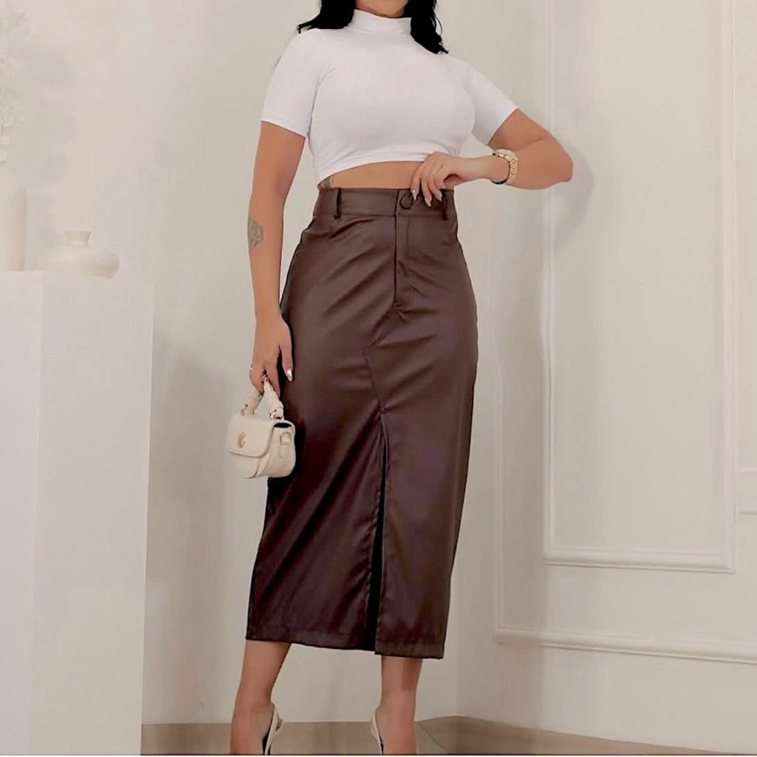 Pollera elastizada en eco cuero, bolsillos a los