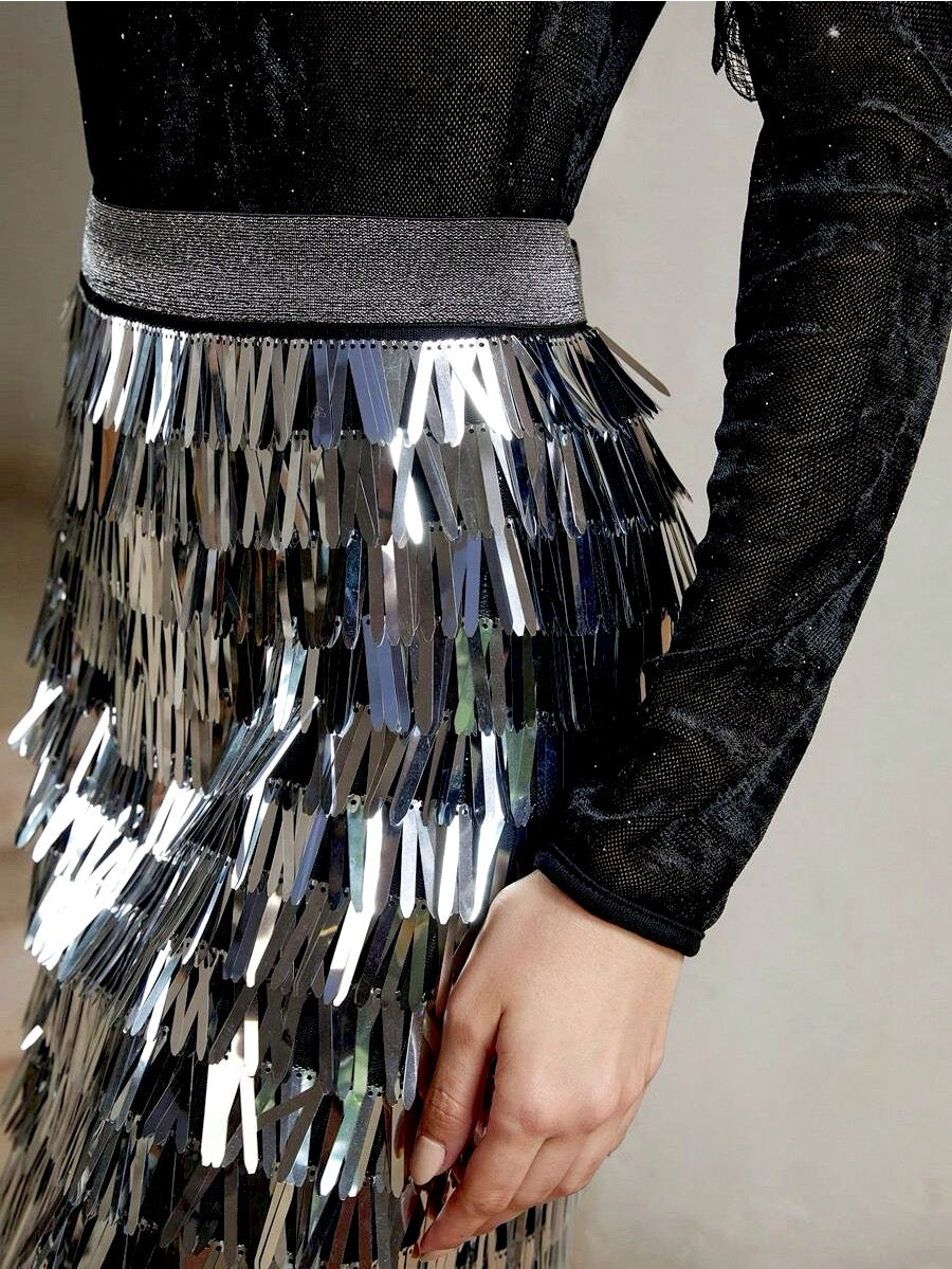 Pollera 100% bordada con lentejuelas peltres, totalmente forrada por dentro, con goma en la cintura.