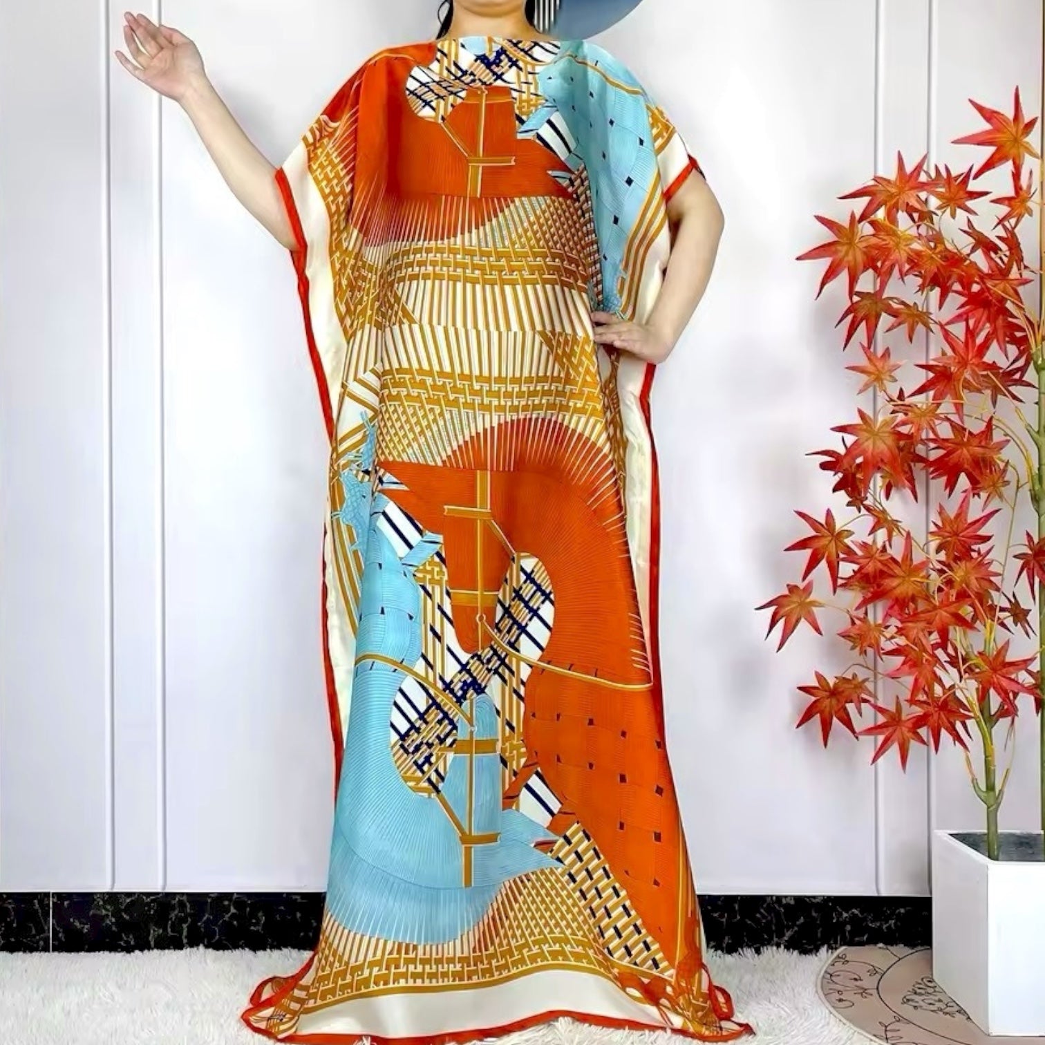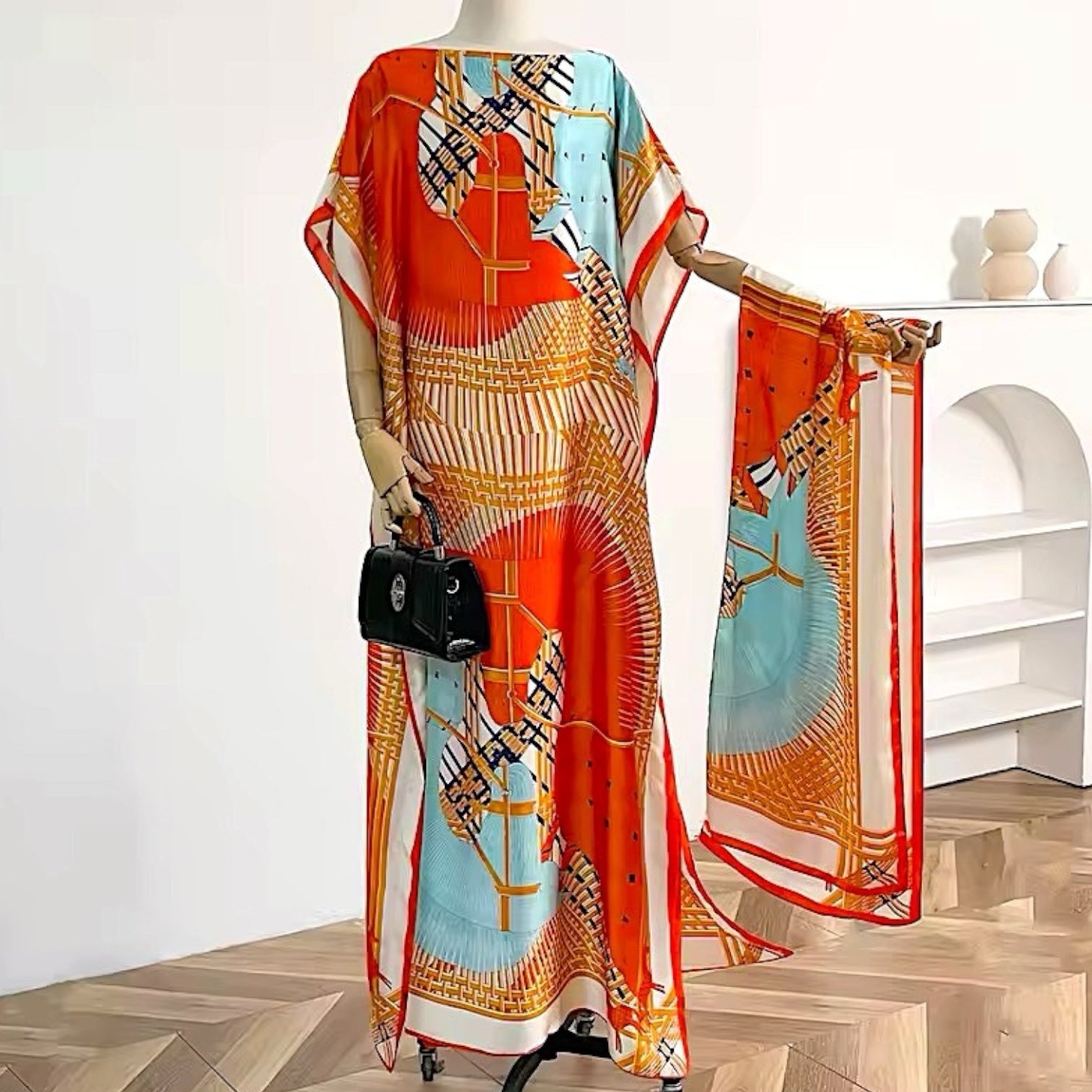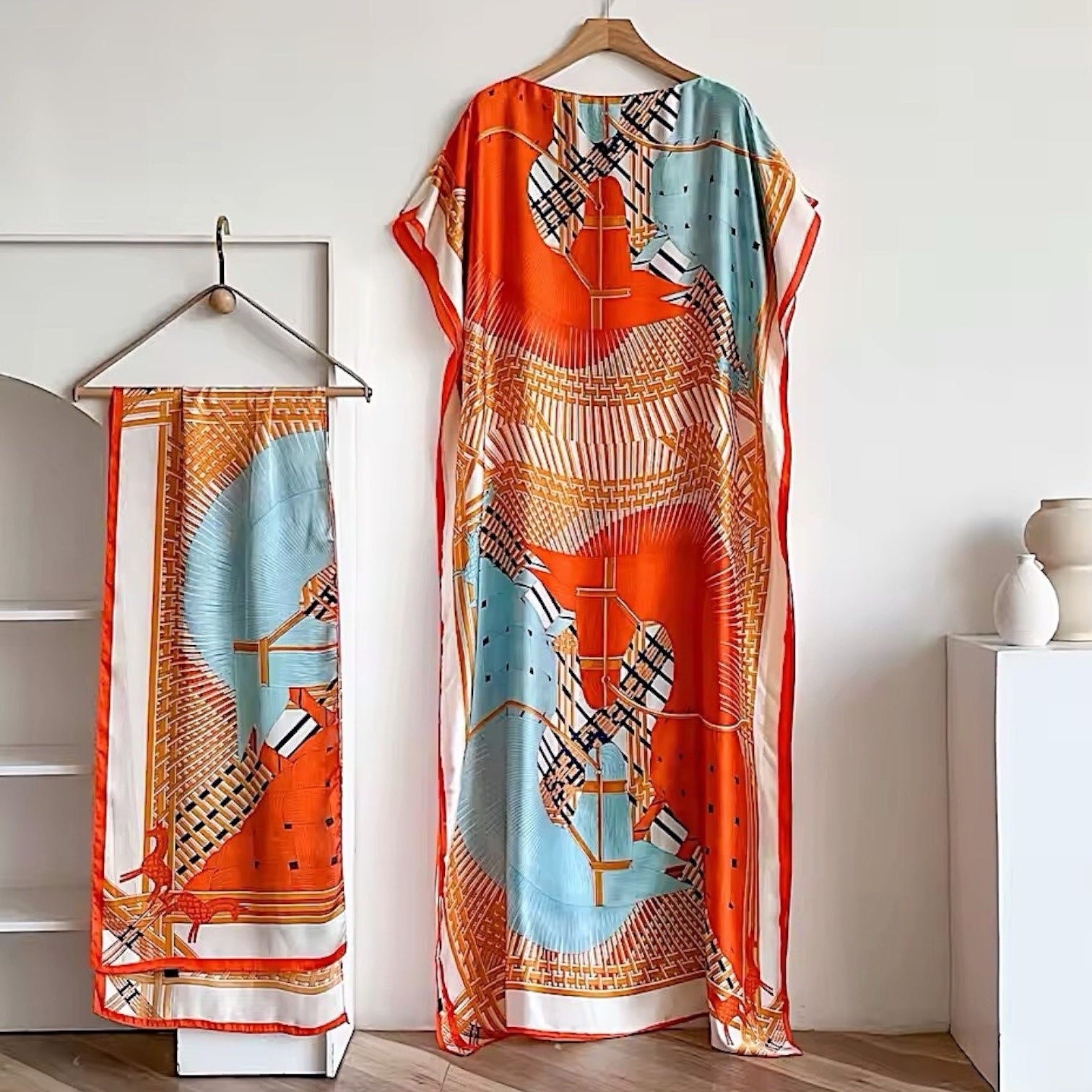 Túnica estampada y chal, tela sensación seda.