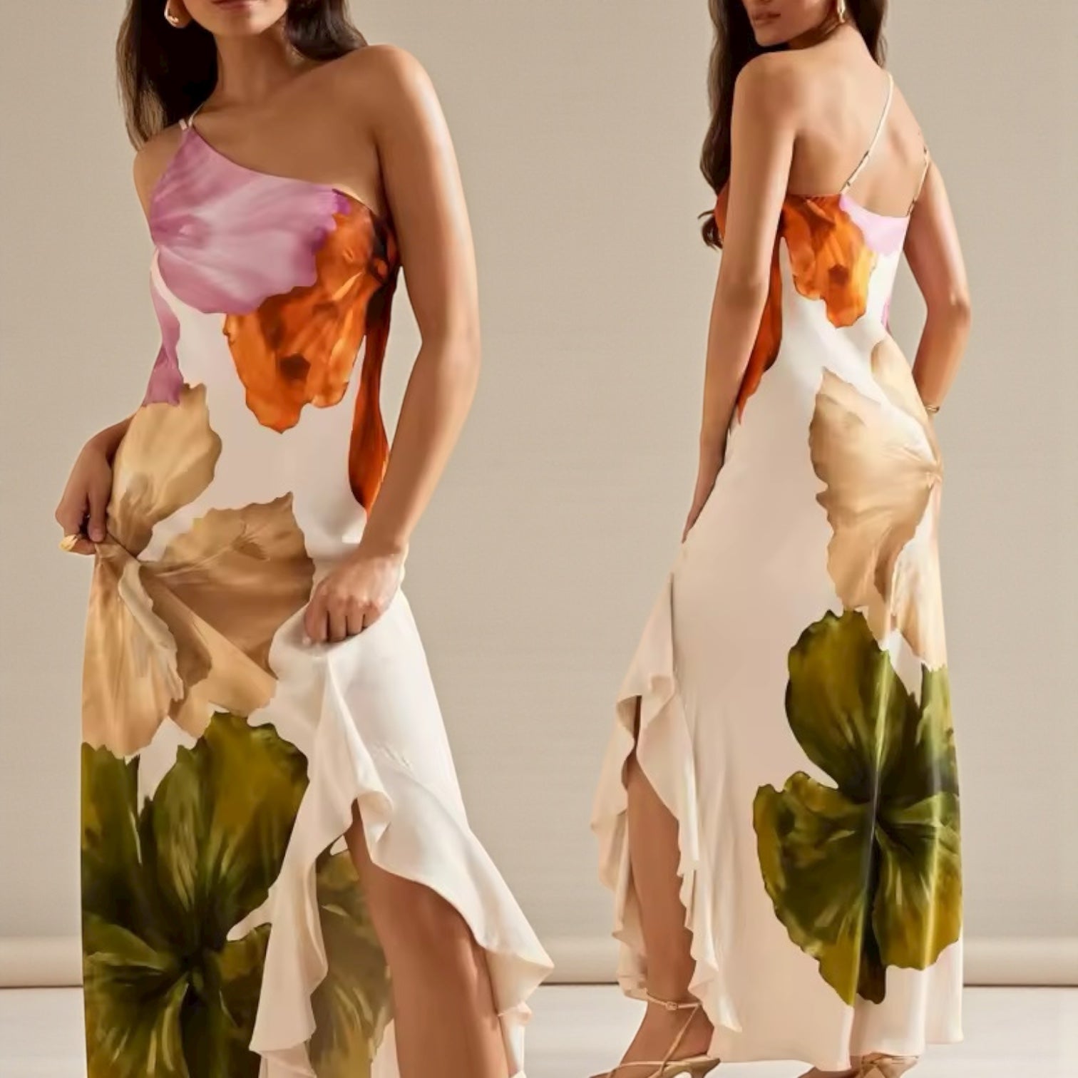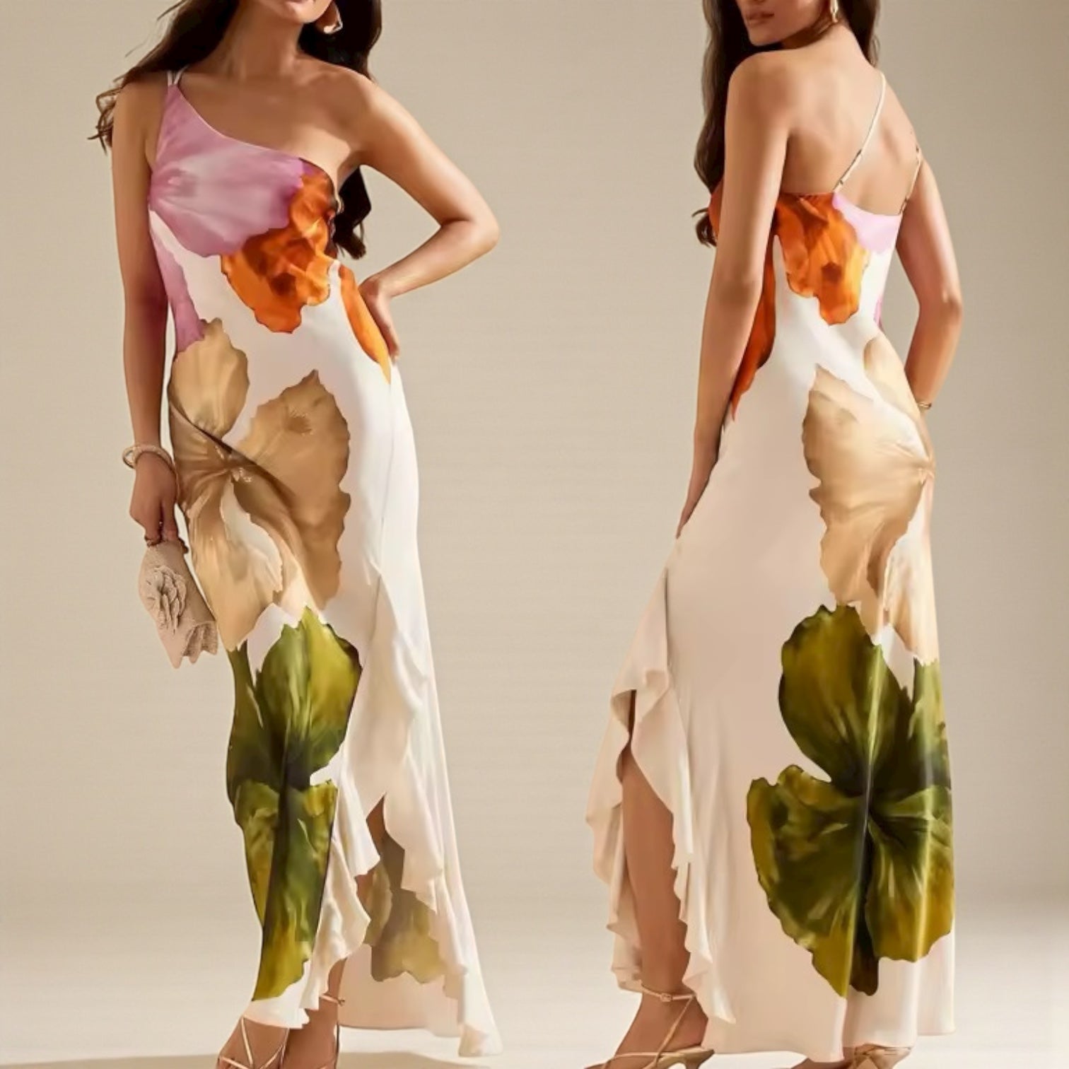 Vestido estampado, de un solo hombro, cierre al costado. Poliéster y elastano