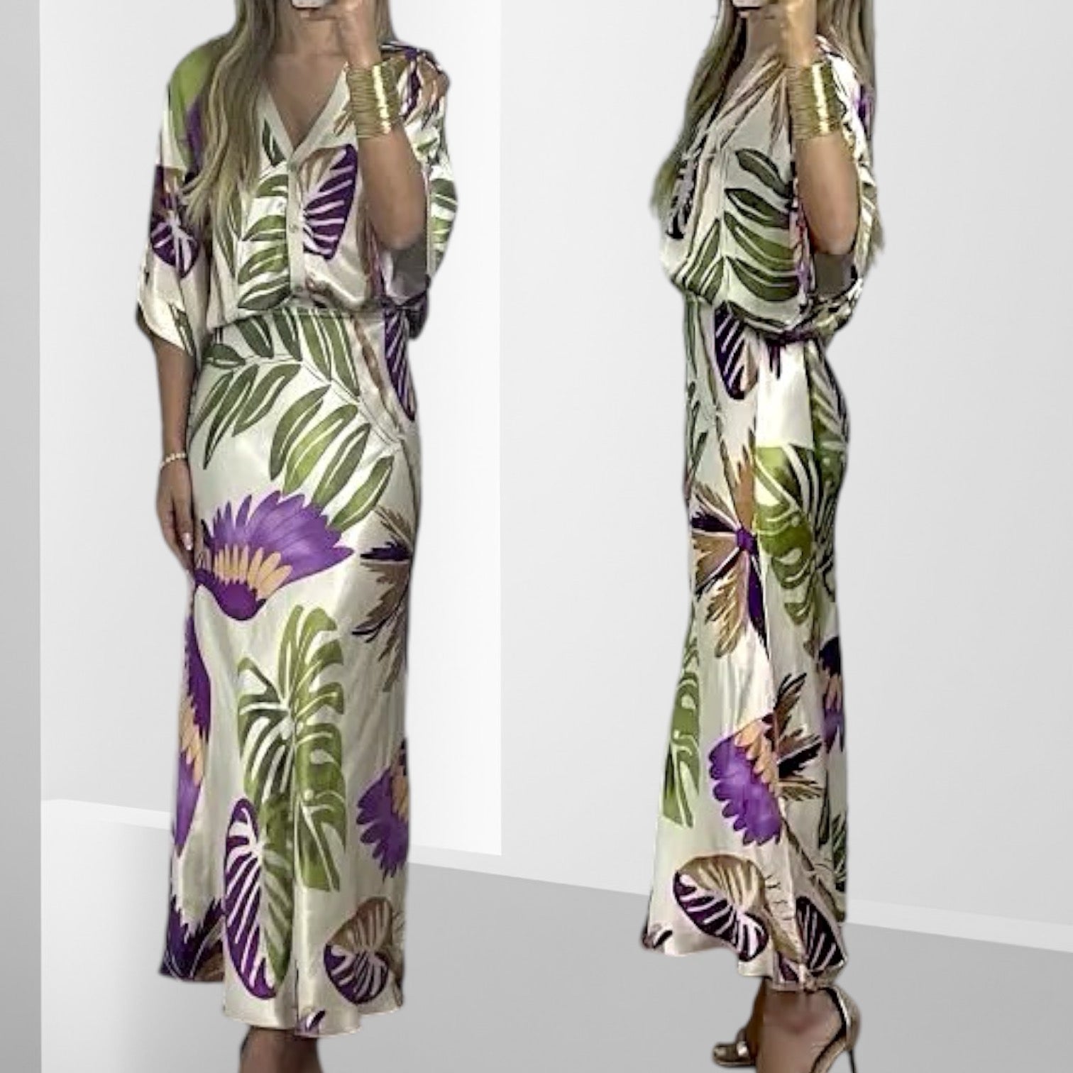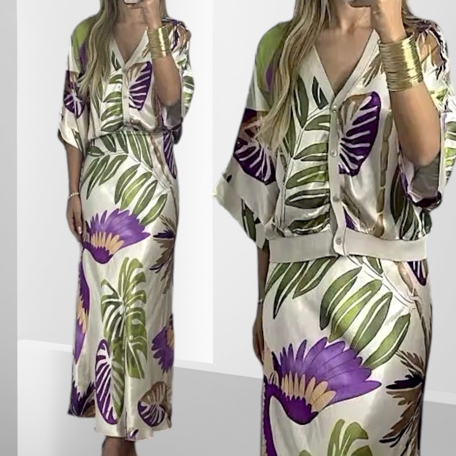 Blusa holgada con mangas amplias + Pollera con cierre al costado.