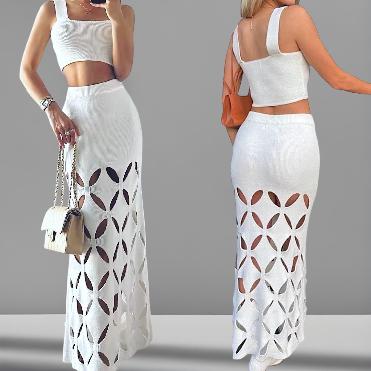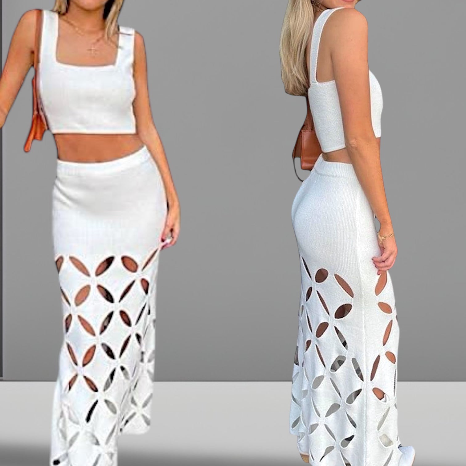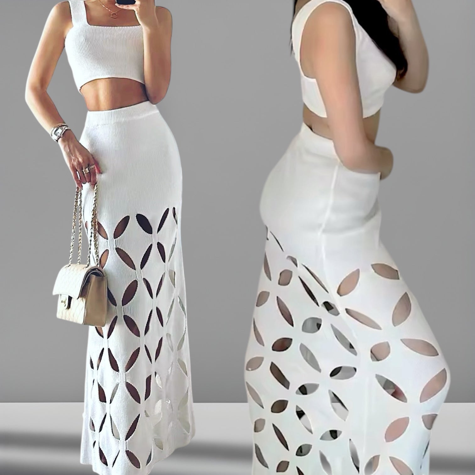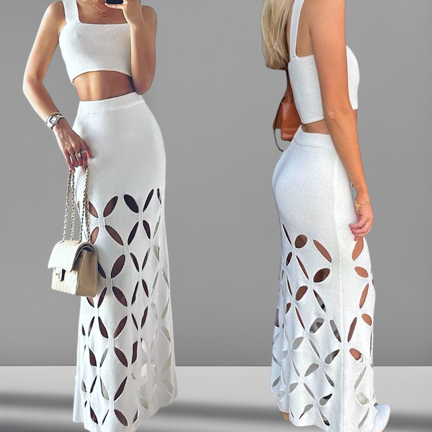 Pollera playa calada de cintura alta con engomado + Crop Top corto.