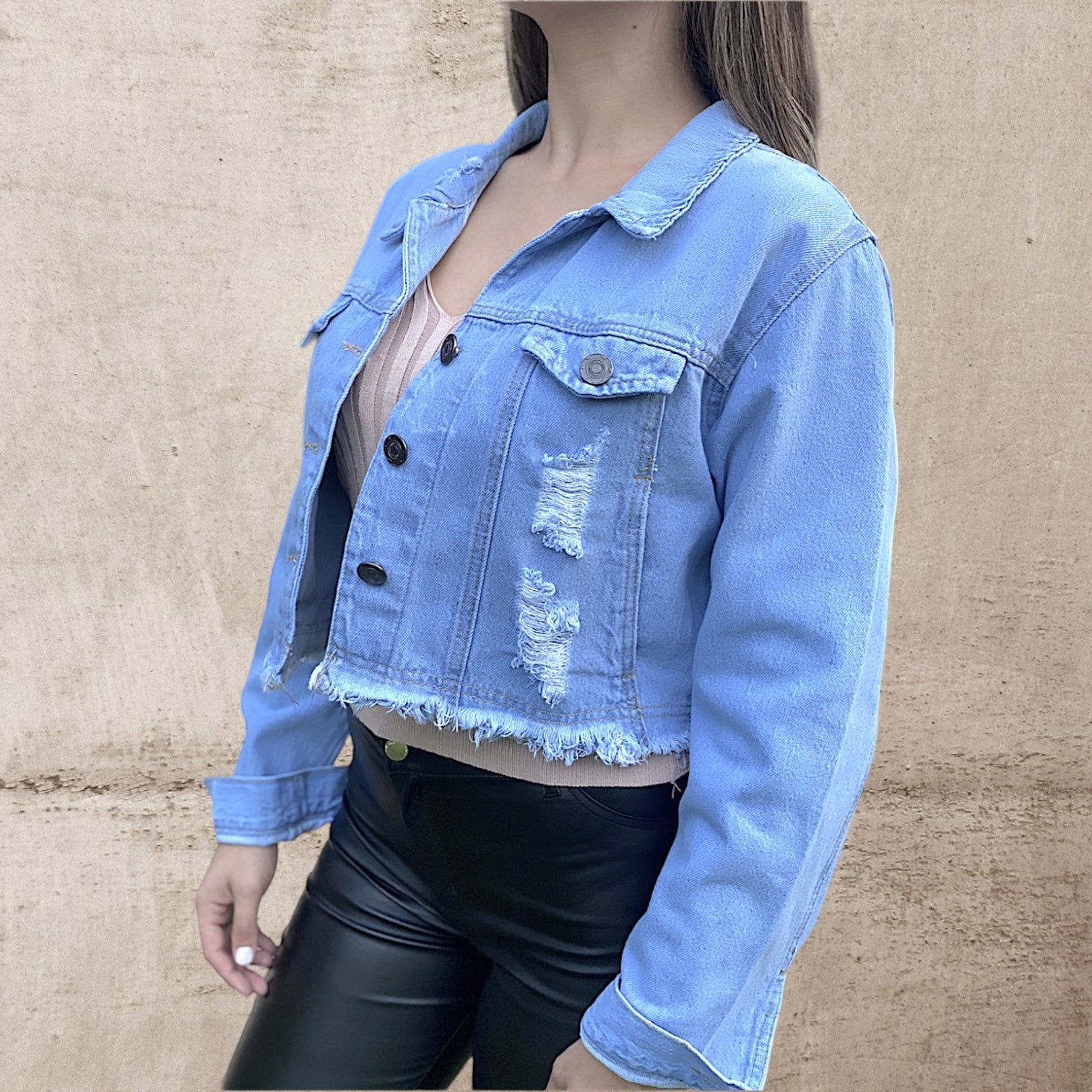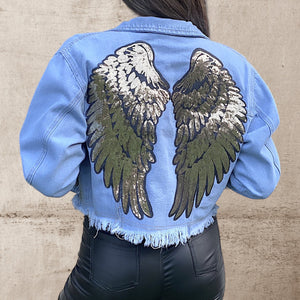 Campera de Jean con trabajos deshilachados y bordados en lentejuelas doradas.